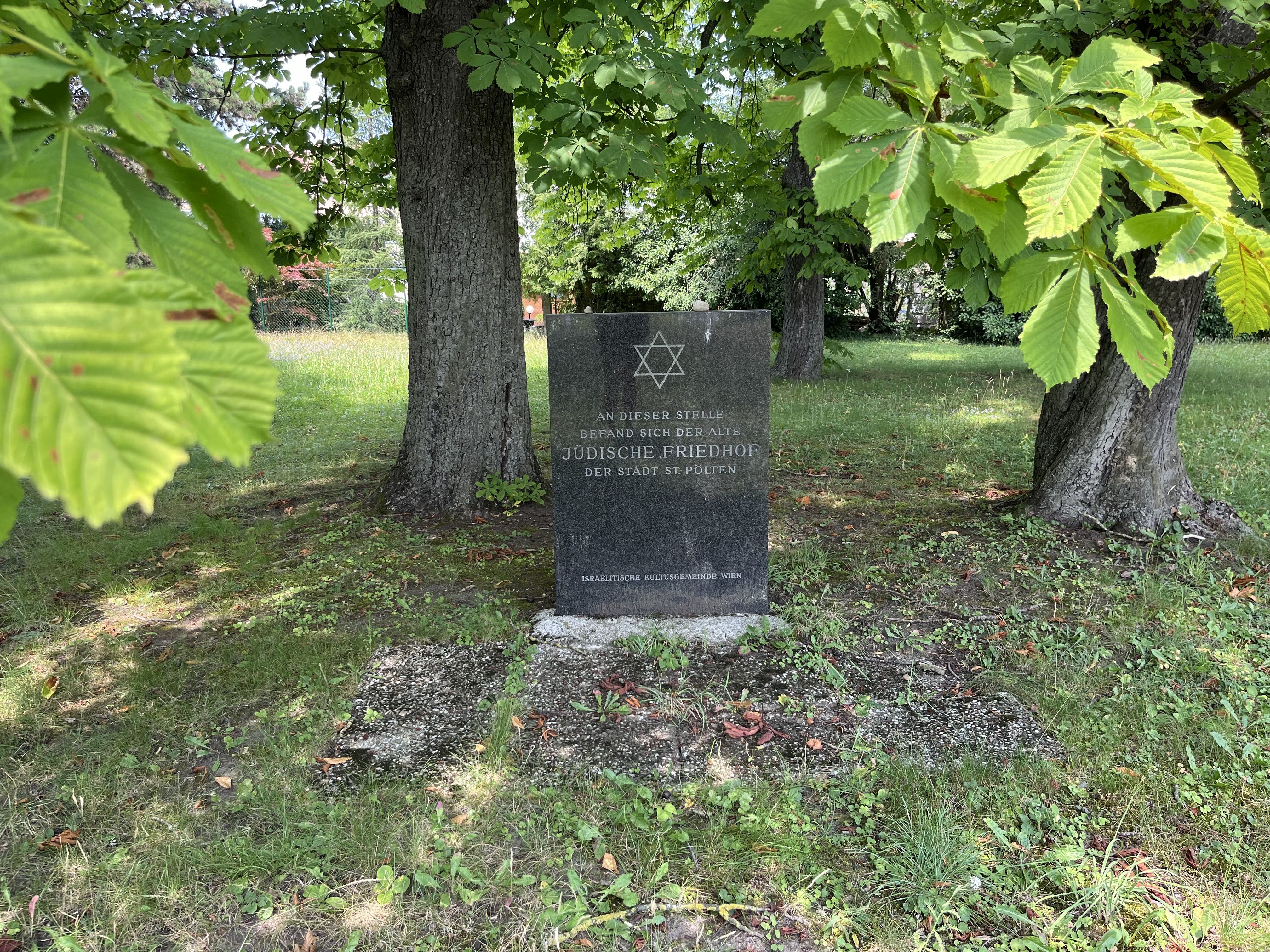 Der 1859 angelegte erste jüdische Friedhof St. Pöltens gehört zu den ältesten in Niederösterreich. Die Gestaltung durch die Künstlerin Anna Artaker fasst den Ort mit einer Umrahmung durch 116 Glasplatten ein, auf denen die Namen und kurze Beschreibungen der zwischen 1859 und 1906 dort bestatteten Menschen zu lesen ist, deren Grabsteine während der NS-Zeit entwendet wurden. Die schlichte und präzise Gestaltung gibt dem Ort wieder seine Bedeutung als Ort der Erinnerung und des Gedenkens zurück und macht die jüdische Geschichte St. Pöltens sichtbar. Die feierliche Eröffnung fand am 18. September 2024 im Rahmen eines Nachkommentreffens vertriebener St. Pöltner Jüdinnen und Juden statt.