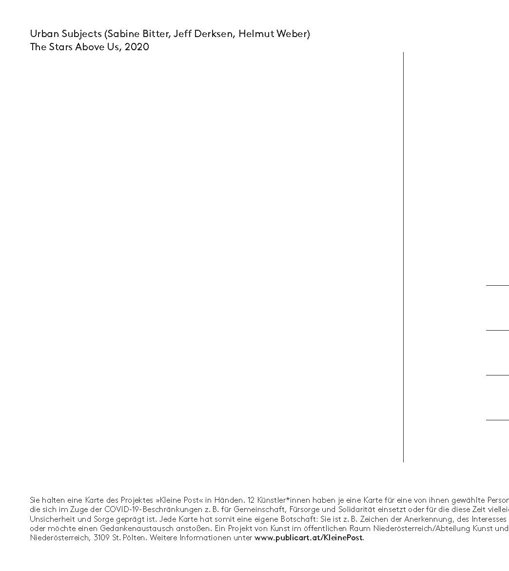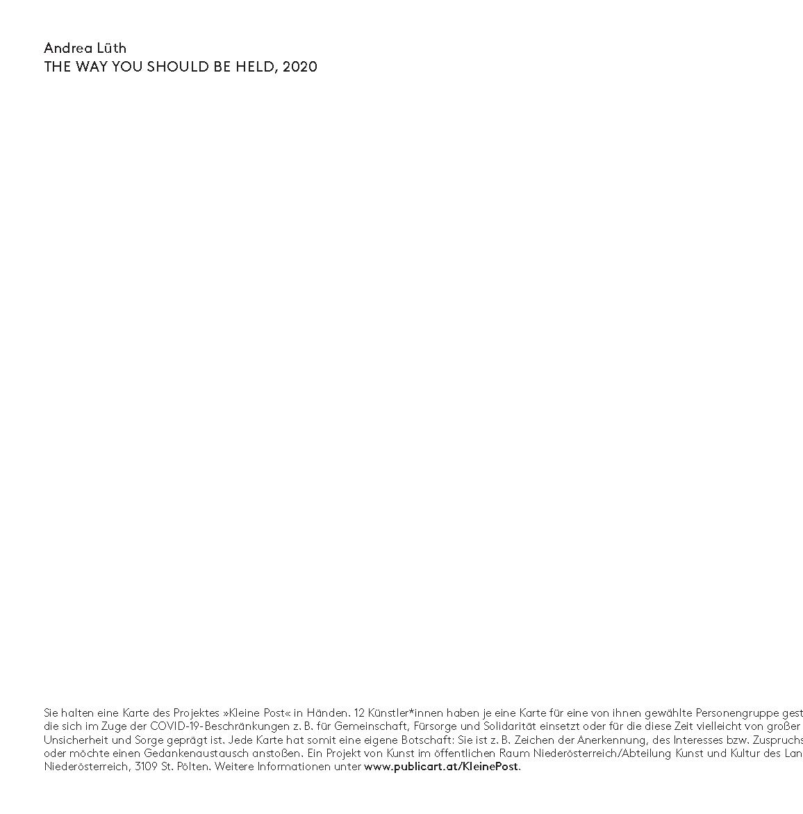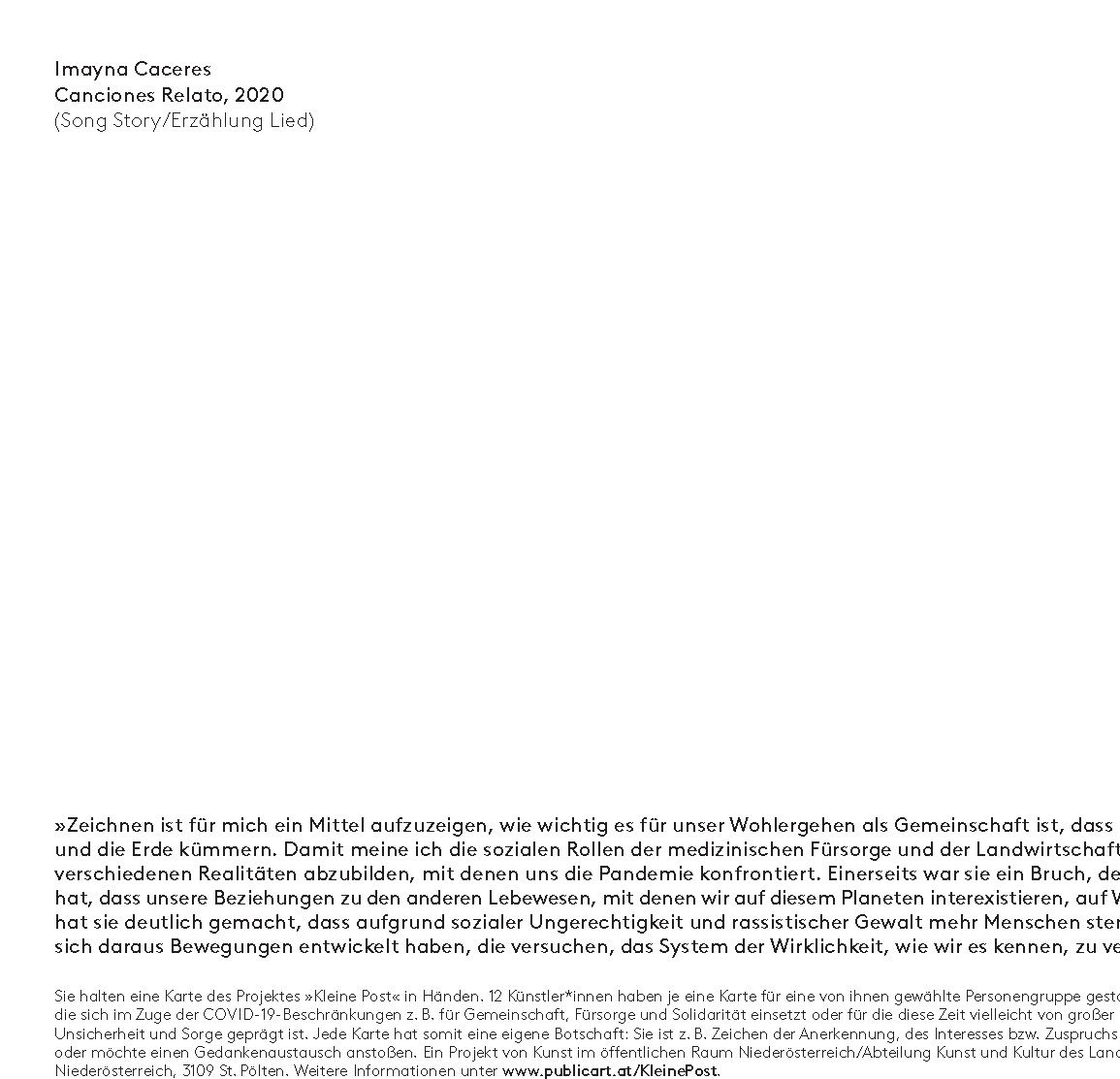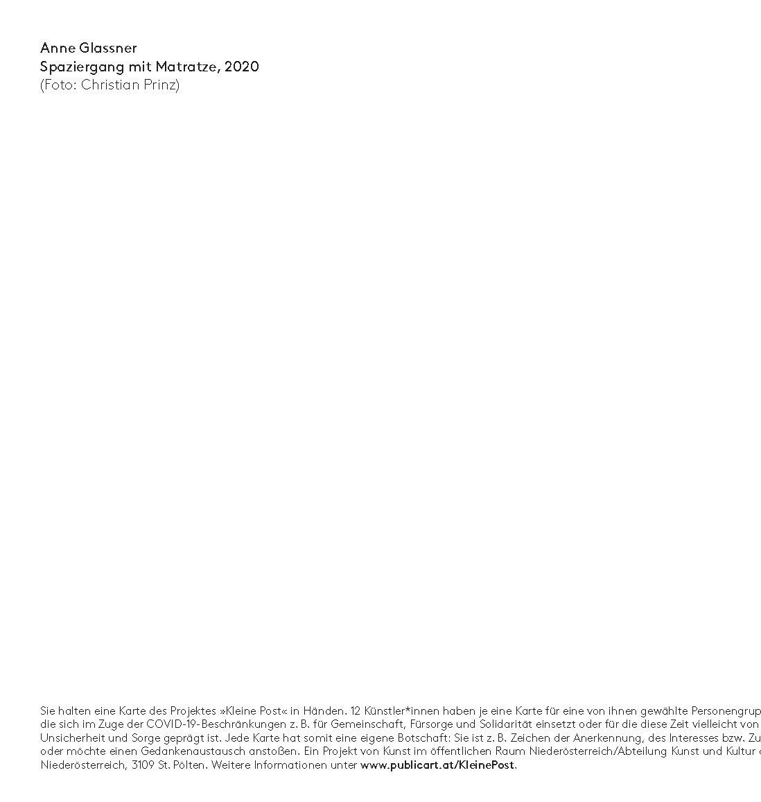 Mit dem Projekt KLEINE POST setzt die Kunst in öffentlichen Raum Niederösterreich ein Zeichen der Solidarität für all jene, die in der Zeit der Pandemie besondere Herausforderungen zu meistern haben. Die KLEINE POST möchte stellvertretend für die vielen Einzelnen einen Teil der in Niederösterreich lebenden und tätigen Menschen mit einem Zeichen der Aufmerksamkeit und Wertschätzung erreichen.
