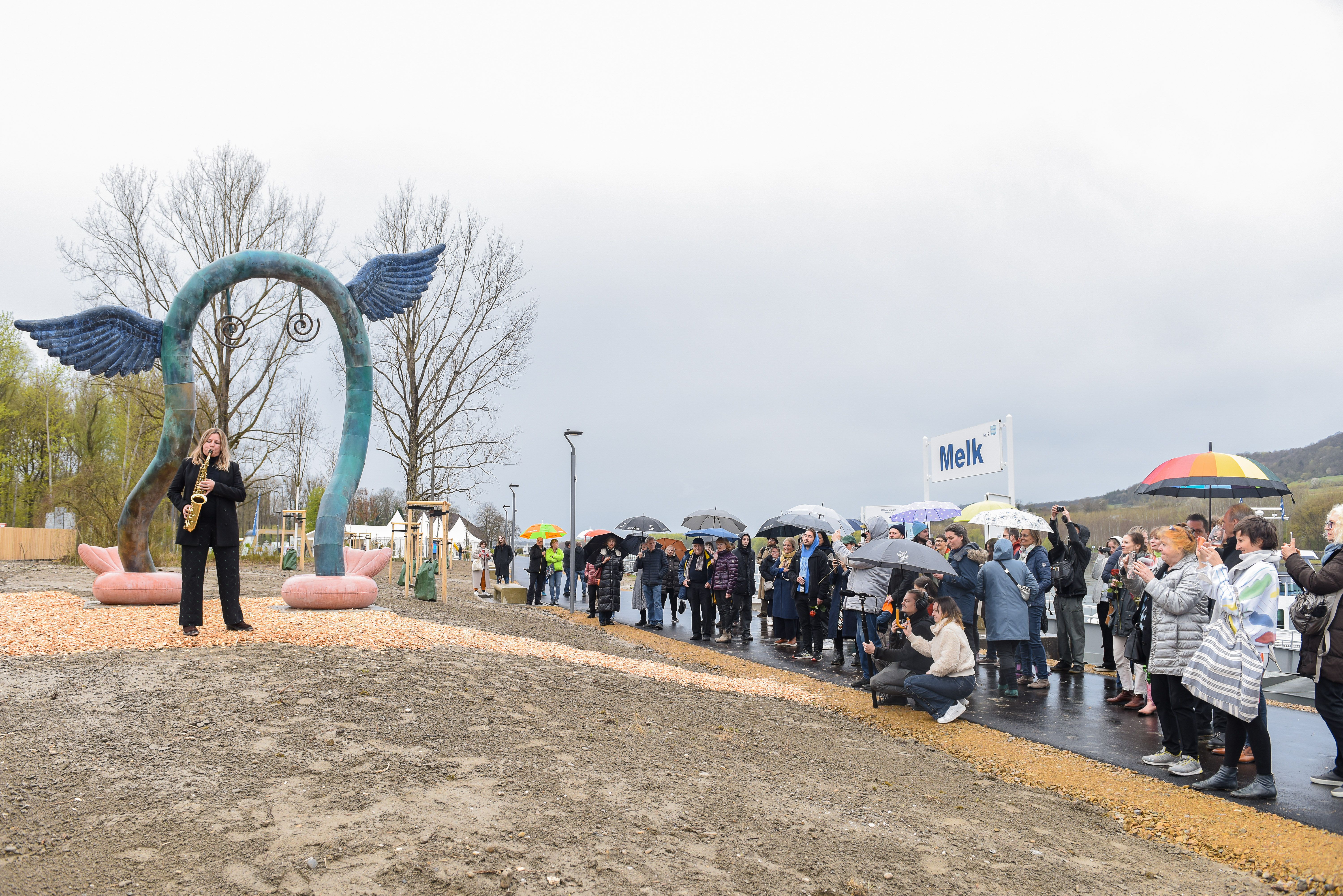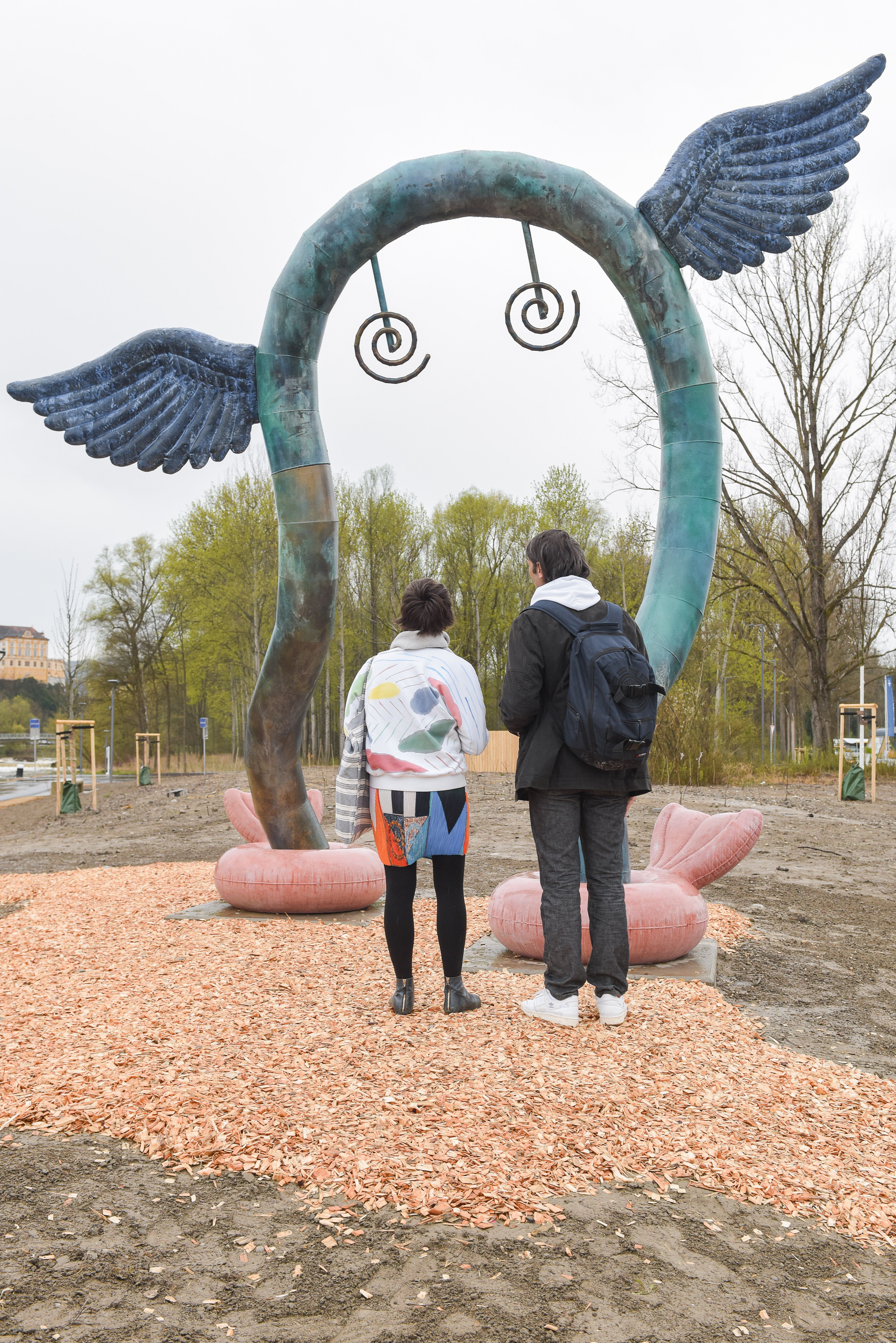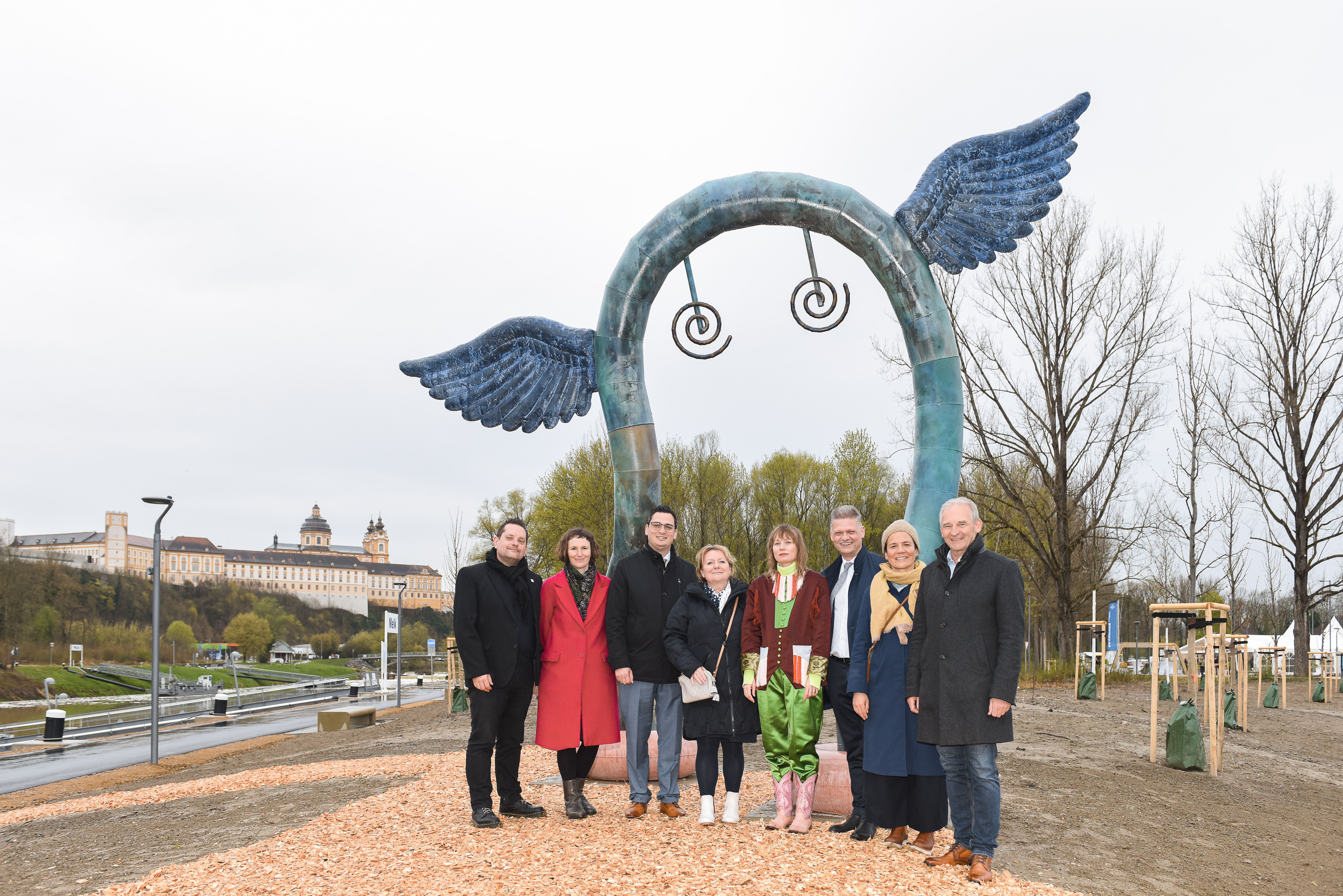 DOORA, ein geflügeltes Objekt, dessen Köper einem Tor ähnelt und Fischflossen an Schwimmreifen zu ihren Füßen trägt, vereint in Form und Materialität phantasievoll vielfältige Aspekte dieses Ortes: die Donau als Lebensraum für Mensch und Tier und ihre kulturverbindende Kraft, aber auch Melk als Tor zur Wachau, die täglich zahlreiche Menschen willkommen heißt.