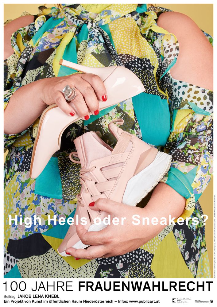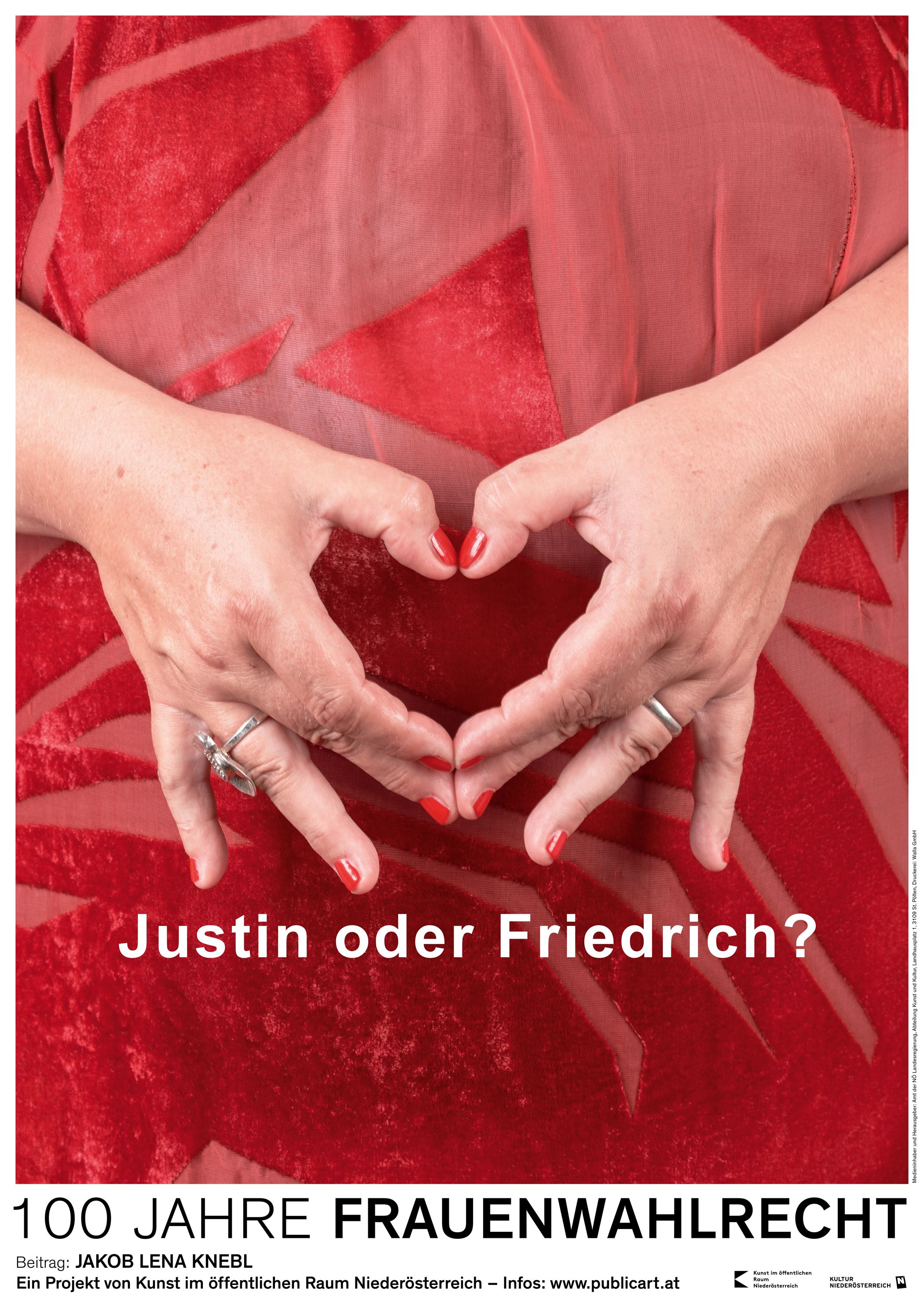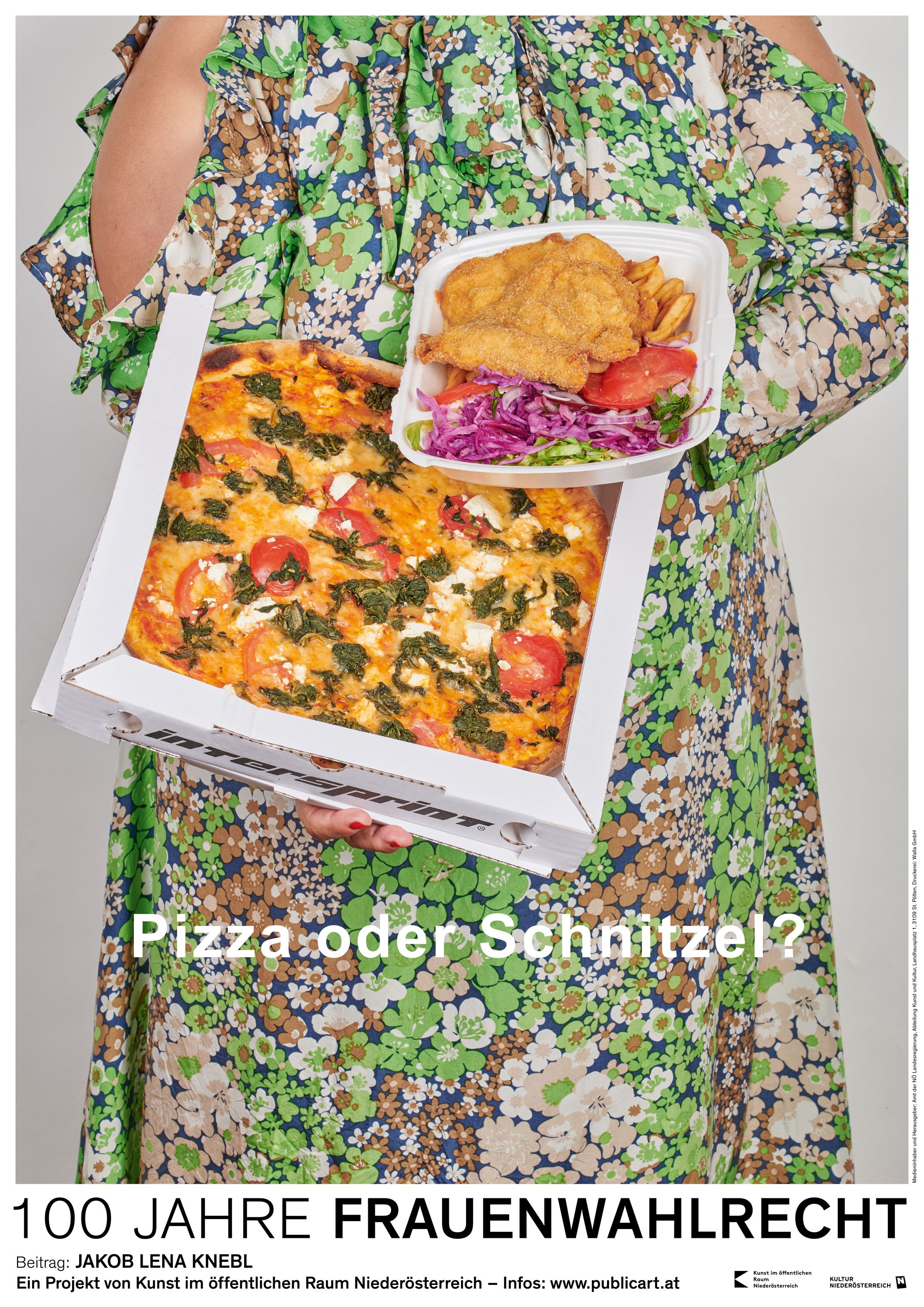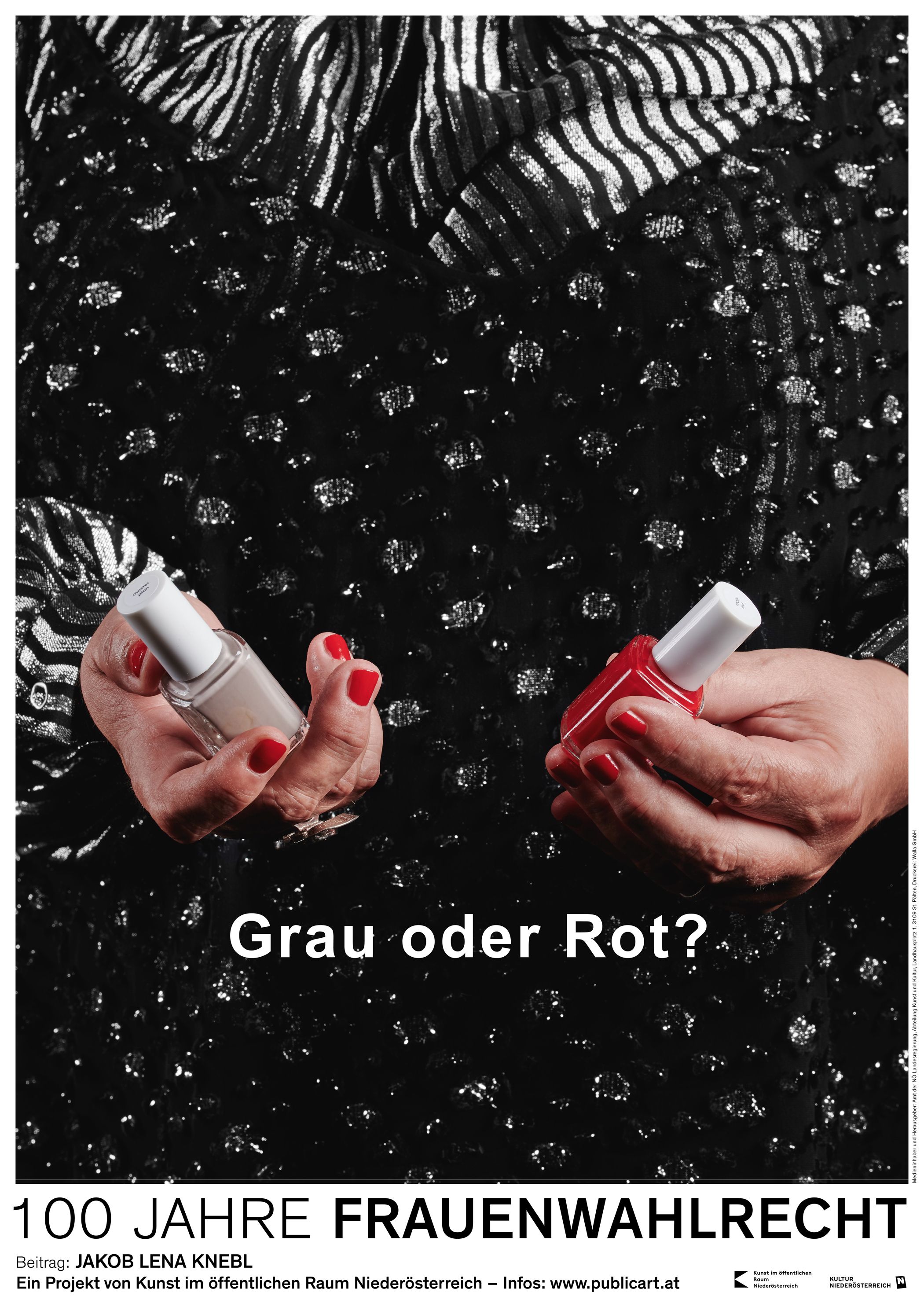 Ist die Wahl der neuesten modischen Accessoires relevanter als jene unserer politischen VertreterInnen? Haben politisches Handeln und der Kampf für Gleichberechtigung angesichts von Konsum und Warenbegehren an Dringlichkeit verloren? Auch wenn das Thema Feminismus heute mehrheitsfähig und zu einem Teil des Mainstreams geworden zu sein scheint, lassen die darüber geführten Diskussionen ein Geschichtsbewusstsein vermissen. Der lange und steinige Weg, den die für das Wahlrecht engagierten Frauen gehen mussten, ist der Mehrheit nicht bekannt. Mit solchen Fragestellungen konfrontiert uns Jakob Lena Knebls Plakatserie zu „100 Jahre Frauenwahlrecht in Österreich“, aber wie so oft begegnet die Künstlerin auch diesem Thema mit dem für ihre Arbeit typischen Humor, um spielerisch einen Blickwechsel zu initiieren. In gemusterten Kleidern inszeniert sie sich betont feminin und scheint vor banale alltägliche Wahlen gestellt, nämlich jene des Nagellacks, der Schuhe, des Partners oder des Menüs. Ganz bewusst nutzt die Künstlerin Waren- und Modeästhetik als Medium für eine gesellschaftskritische Botschaft, um mittels vertrauter plakativer Bildsprache Hemmschwellen zu senken und Aufmerksamkeit für dieses Thema zu wecken. Ihre parodistische Interpretation verdeutlicht unverblümt, welche anderen und gewichtigeren Wahlmöglichkeiten Frauen heute zur Verfügung stehen.