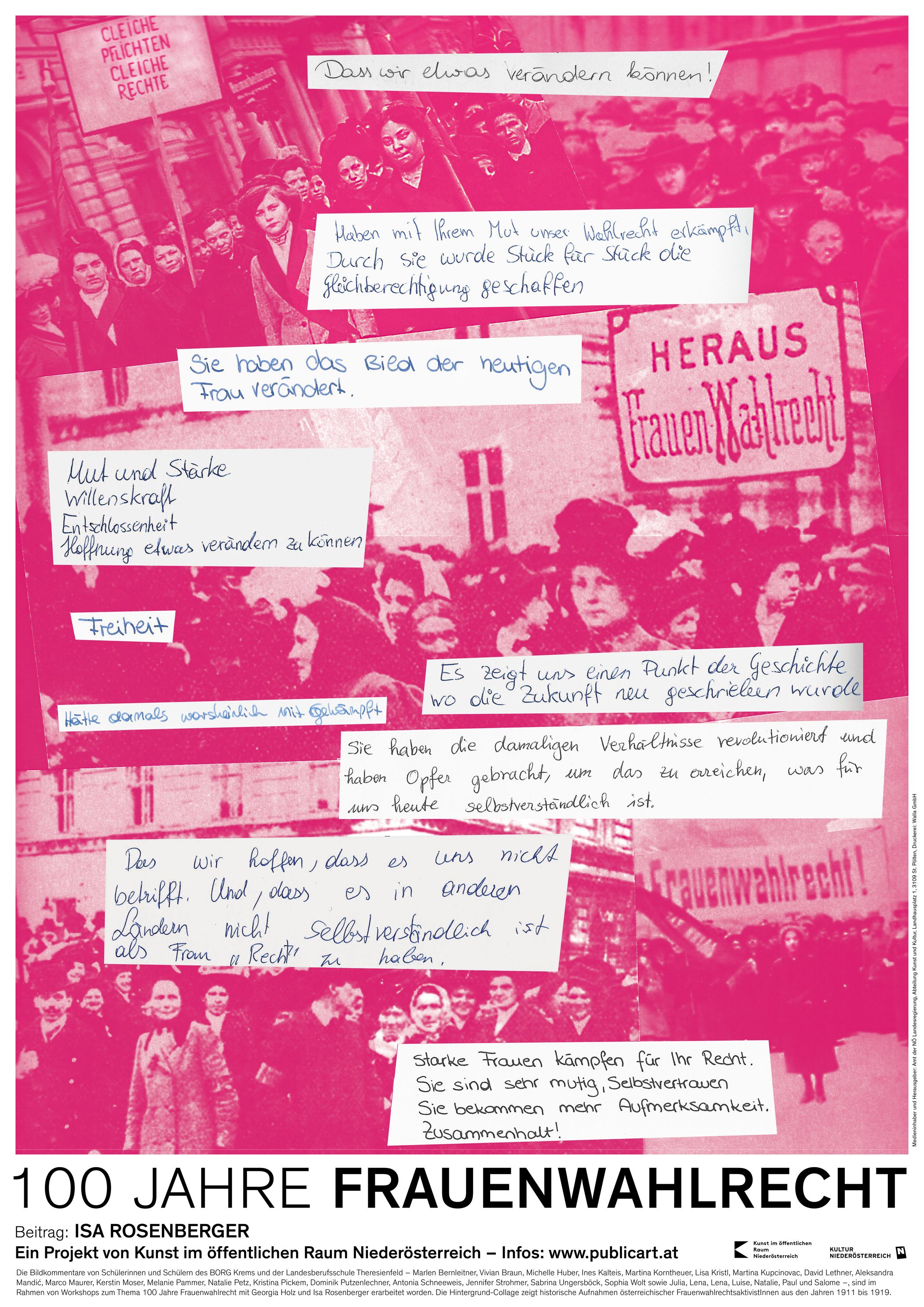 Ein essenzieller Aspekt von Isa Rosenbergers Plakatentwurf ist die Partizipation von Schülerinnen und Schülern, mit denen die Künstlerin im Rahmen von Workshops den Kampf der FrauenwahlrechtsaktivistInnen und die Bedeutung ihrer Errungenschaften für uns heute anhand historischer Fotografien diskutiert hat. Einige der dabei formulierten Kommentare der Jugendlichen bilden die Textebene des Plakats und werden mit den historischen Aufnahmen gleichsam zu einem Dialog zwischen den Generationen verdichtet. Die Fotos zeigen uns „einen Punkt der Geschichte, wo die Zukunft neu geschrieben wurde“, bringt es ein Kommentar der SchülerInnen sehr trefflich auf den Punkt. An Anerkennung der Leistungen der AktivistInnen und an Bewusstsein für die Relevanz des allgemeinen Wahlrechts scheint es der jungen Generation jedenfalls nicht zu mangeln, es stellt sich nur die Frage, welchen Beitrag wir für eine bessere Zukunft leisten können. (Georgia Holz)