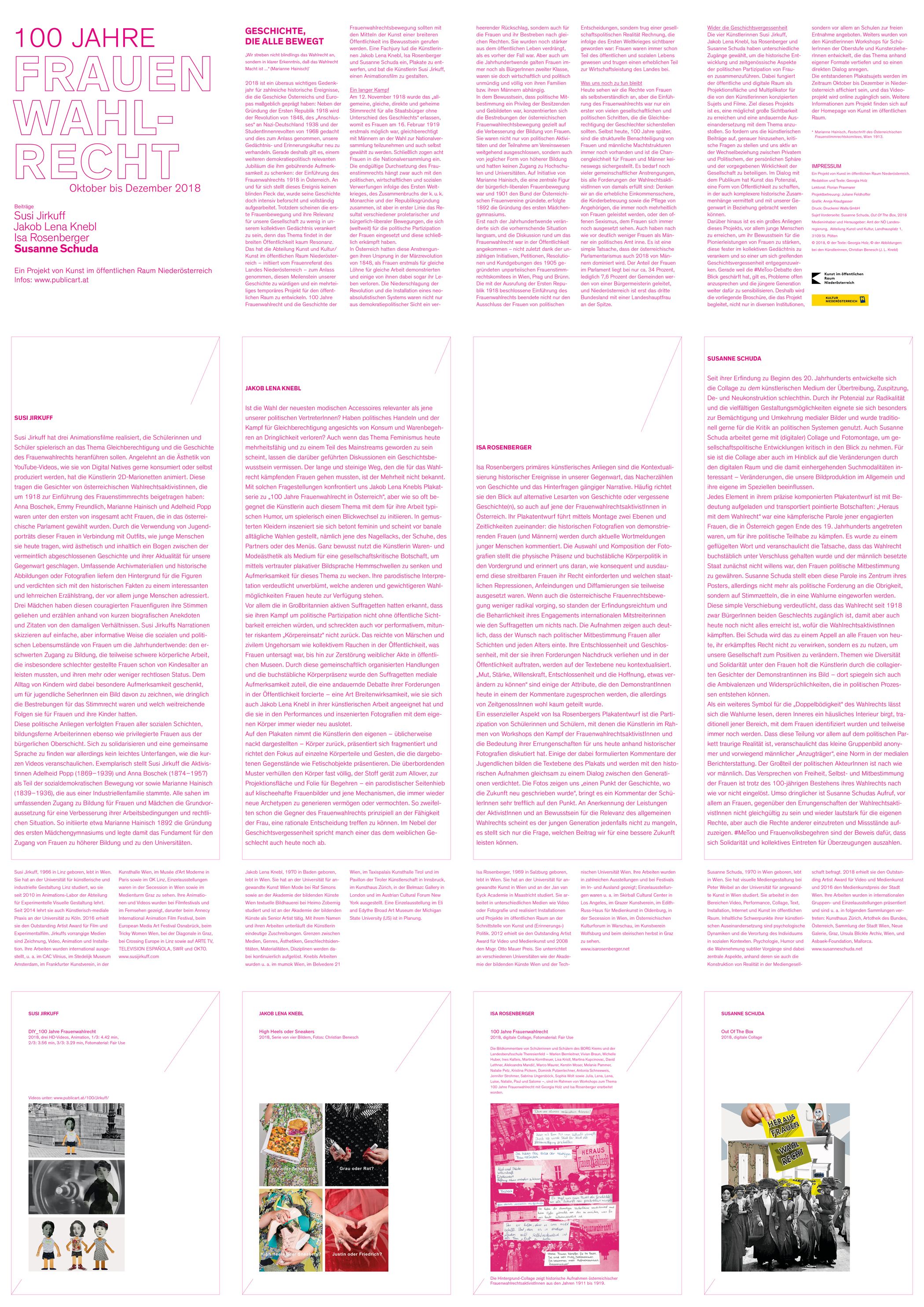 2018 ist ein überaus wichtiges Gedenkjahr für zahlreiche historische Ereignisse, die die Geschicke Österreichs und Europas maßgeblich geprägt haben: Neben der Gründung der Ersten Republik 1918 wird der Revolution von 1848, des „Anschlusses“ an Nazi-Deutschland 1938 und der StudentInnenrevolten von 1968 gedacht und dies zum Anlass genommen, unsere Gedächtnis- und Erinnerungskultur neu zu verhandeln. Gerade deshalb gilt es, einem weiteren demokratiepolitisch relevanten Jubiläum die ihm gebührende Aufmerksamkeit zu schenken: der Einführung des Frauenwahlrechts 1918 in Österreich. An und für sich stellt dieses Ereignis keinen blinden Fleck dar, wurde seine Geschichte doch intensiv beforscht und vollständig aufgearbeitet. Trotzdem scheinen die erste Frauenbewegung und ihre Relevanz für unsere Gesellschaft zu wenig in unserem kollektiven Gedächtnis verankert zu sein, denn das Thema findet in der breiten Öffentlichkeit kaum Resonanz. Das hat die Abteilung Kunst und Kultur/Kunst im öffentlichen Raum Niederösterreich – initiiert vom Frauenreferat des Landes Niederösterreich – zum Anlass genommen, diesen Meilenstein unserer Geschichte zu würdigen und ein mehrteiliges temporäres Projekt für den öffentlichen Raum zu entwickeln. 100 Jahre Frauenwahlrecht und die Geschichte der Frauenwahlrechtsbewegung sollten mit den Mitteln der Kunst einer breiteren Öffentlichkeit ins Bewusstsein gerufen werden. Eine Fachjury lud die Künstlerinnen Jakob Lena Knebl, Isa Rosenberger und Susanne Schuda ein, Plakate zu entwerfen, und bat die Künstlerin Susi Jirkuff, einen Animationsfilm zu gestalten.