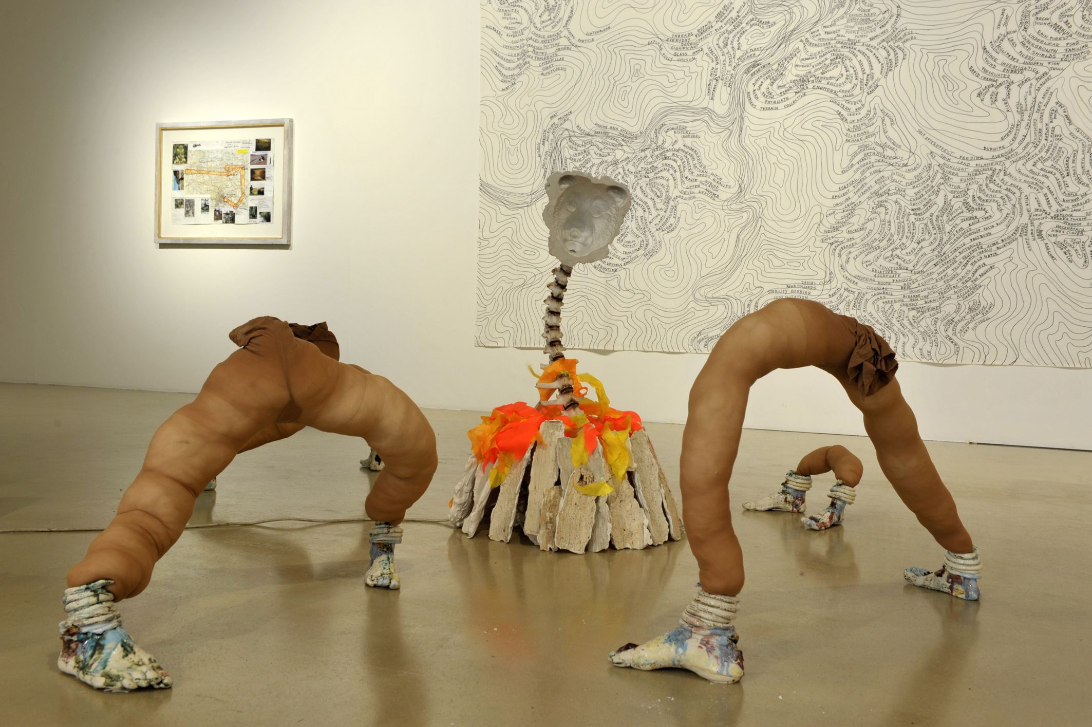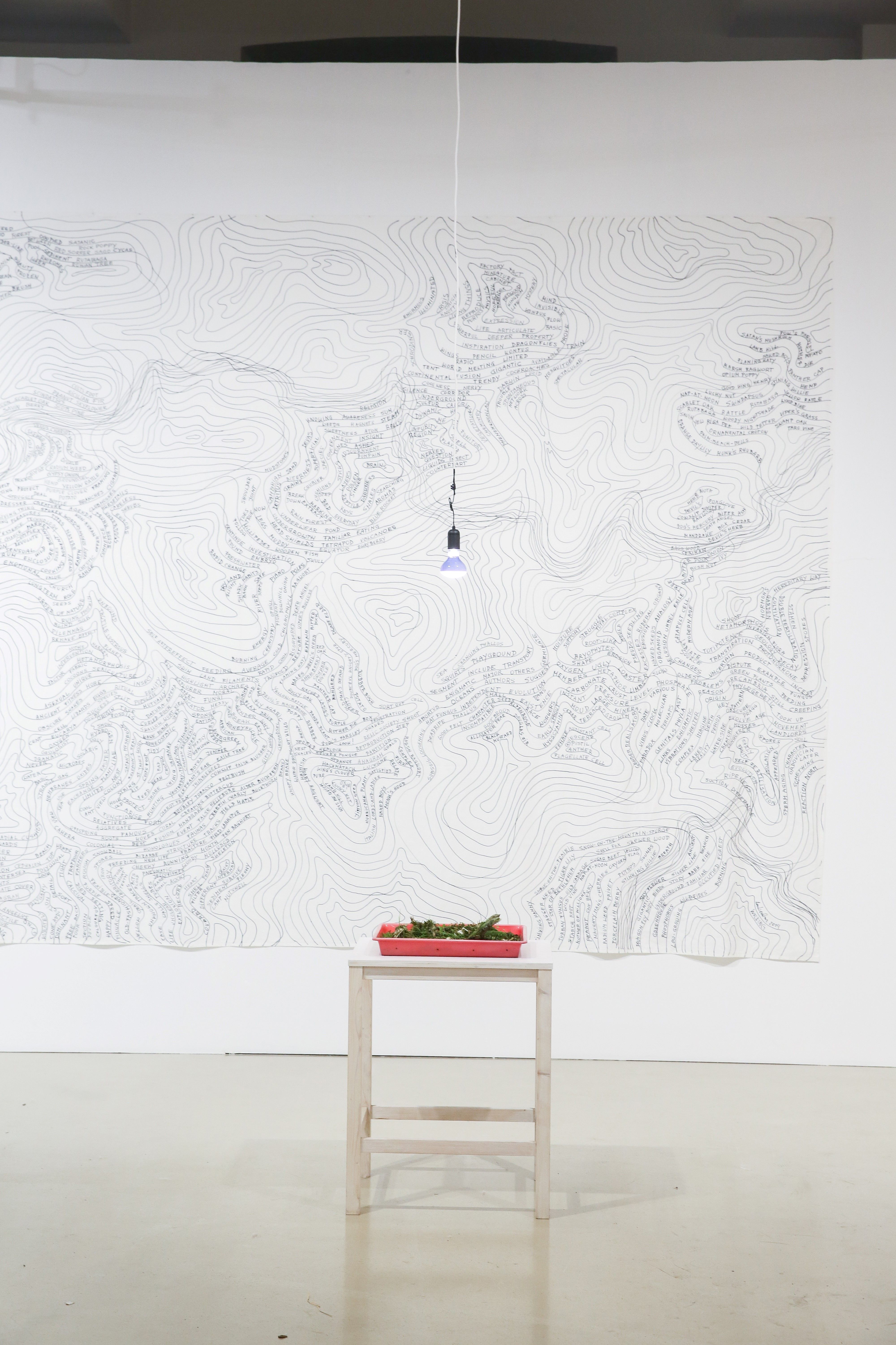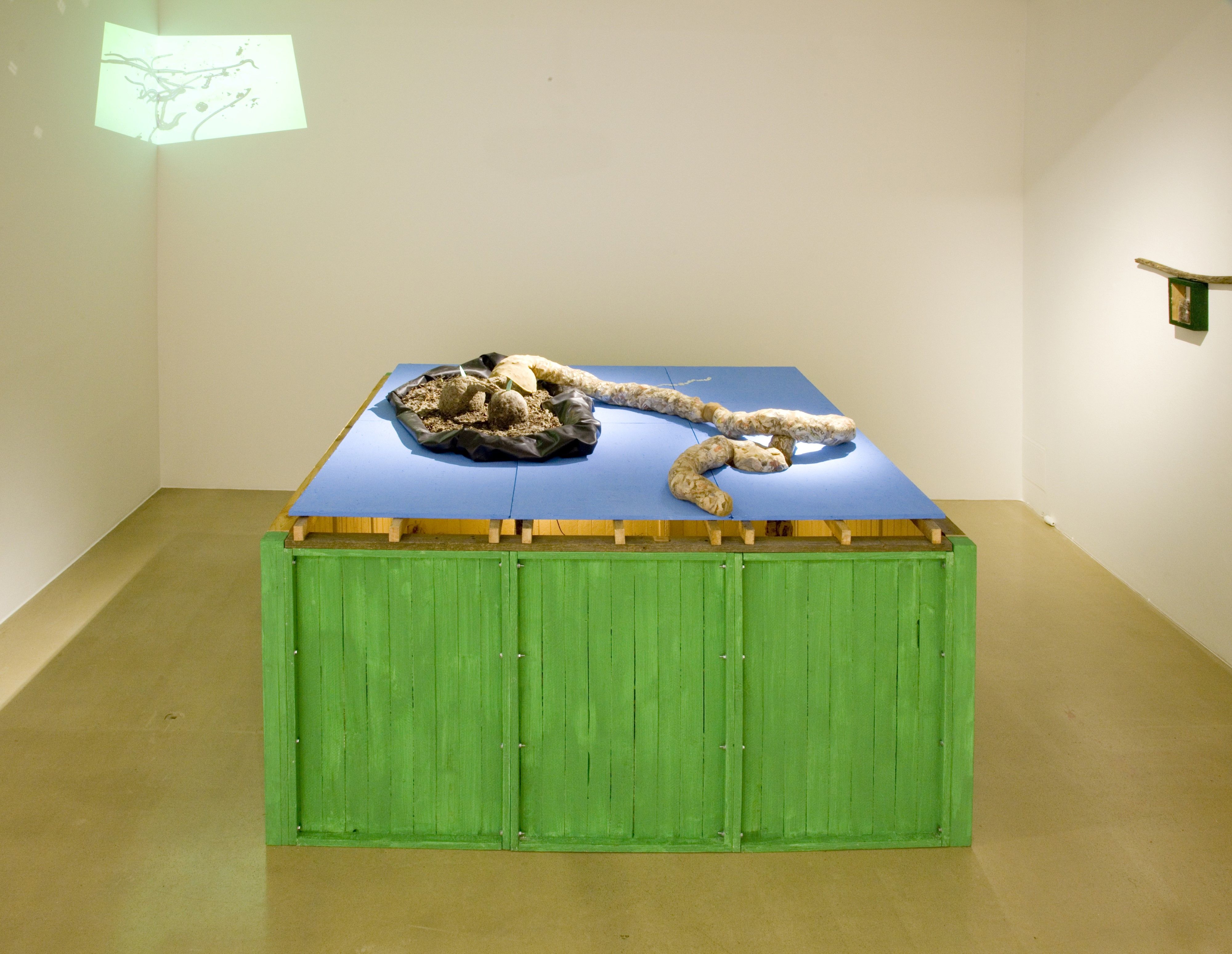 Seit 1988 arbeite ich im Gebiet – so ohne Hecke – in aller Öffentlichkeit/ tausche Böden aus/ beobachte Verhältnisse/ sehe mich nach Brauchbarem um/ die Weltkarte als Brachland.