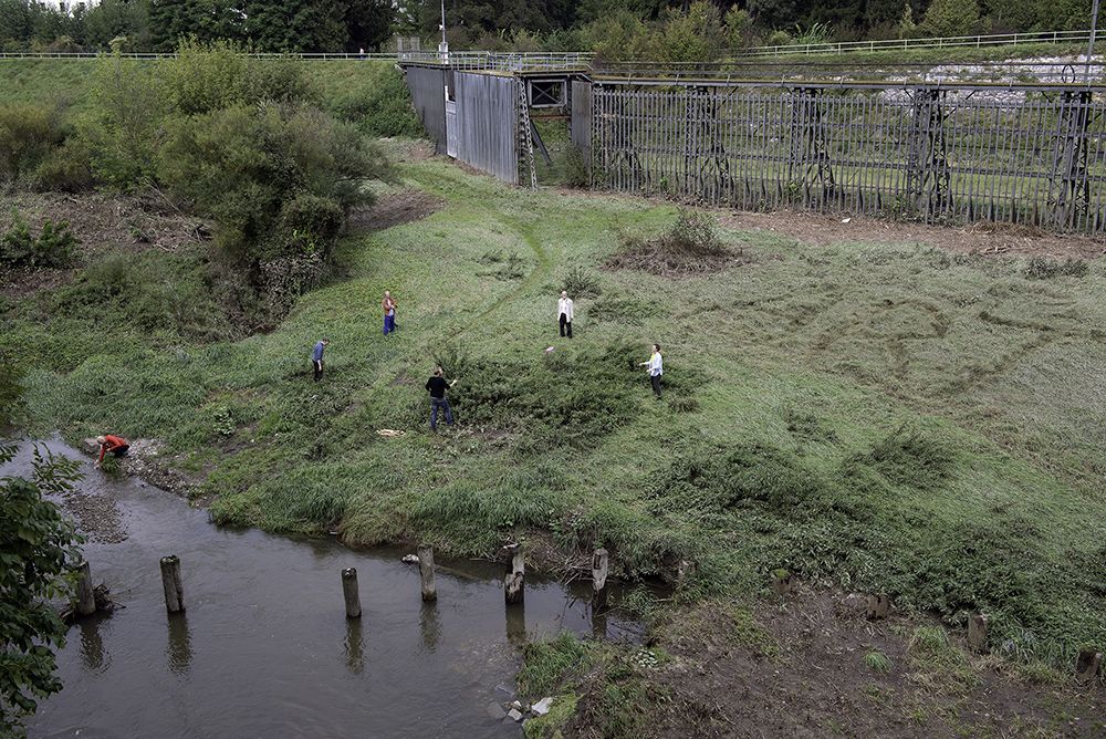 Auf psychogeografische Feldforschung begibt sich Sabine Jelinek entlang des Wienflusses, von Pressbaum bis ins unterirdische Zentrum von Wien, wo eine Metamorphose von Nichts in Etwas oder von Etwas in Nichts passiert, immer begleitet von dem gefundenen und reinszenierten Schriftzug