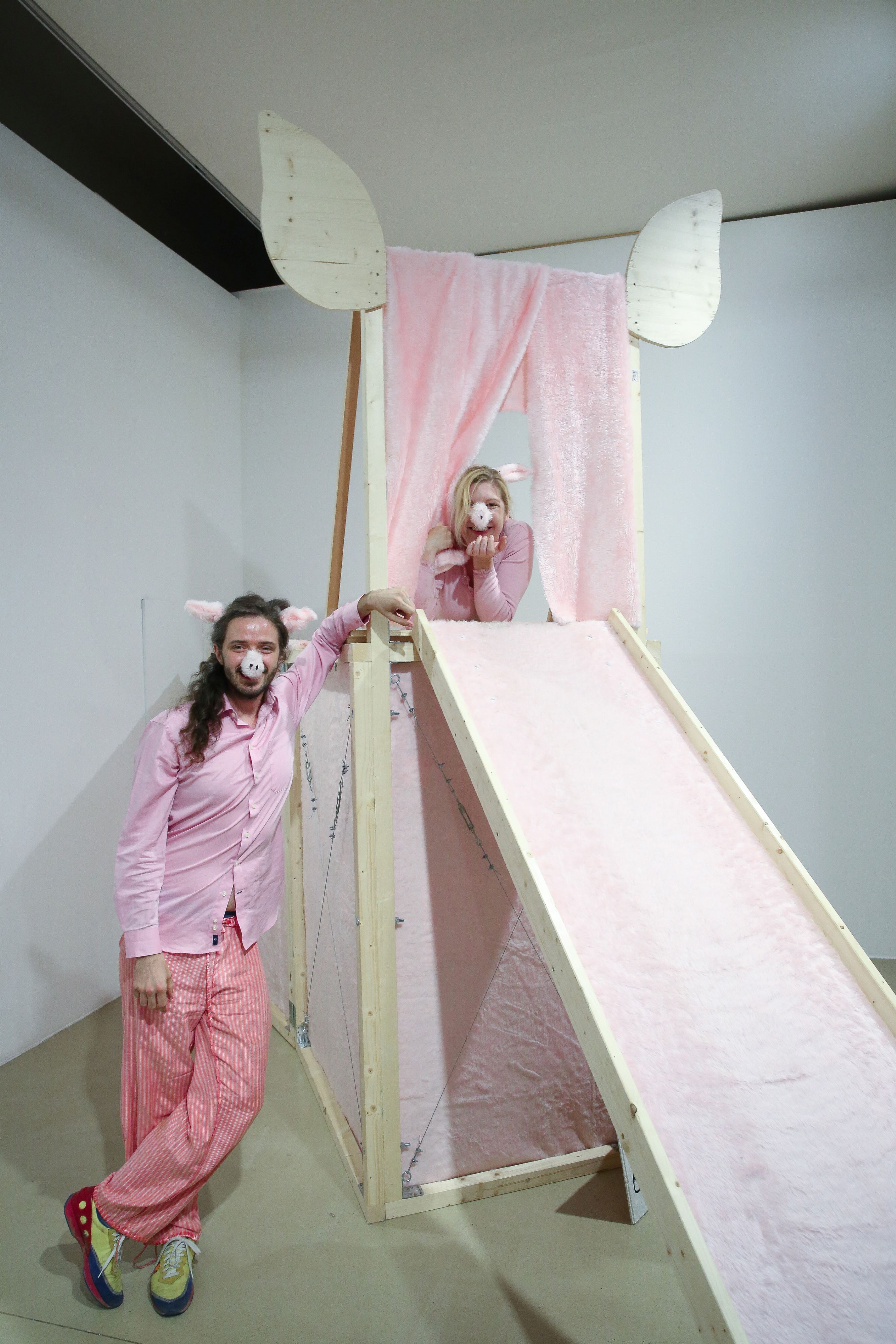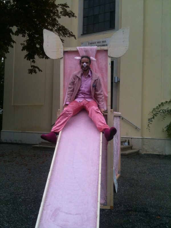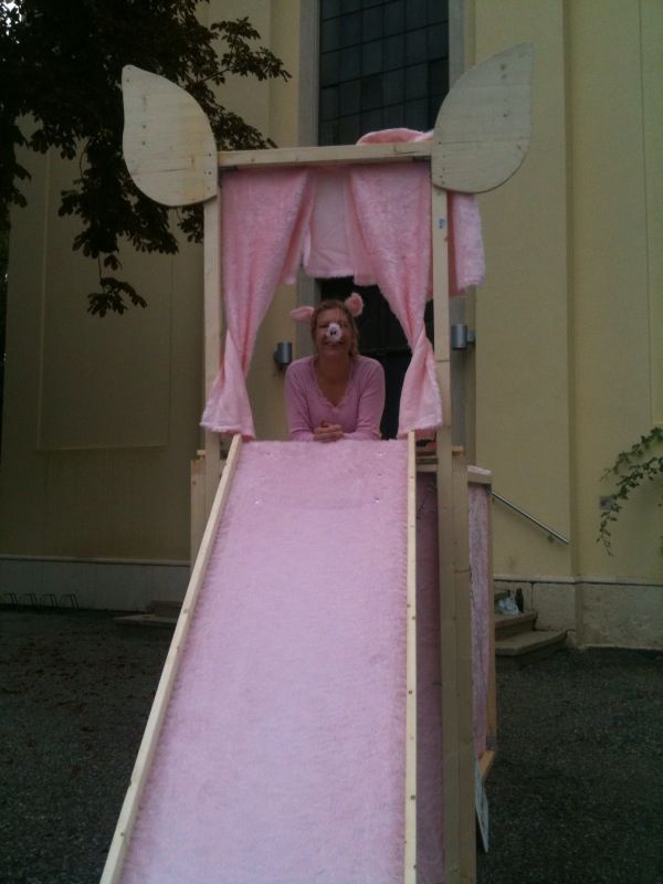 Georg Klüver-Pfandtner und Stephanie Mold bewegen sich im Schweineköstum von Großebersdorf über Maissau in Richtung Wien. Die beiden Schweine schrauben und hämmern ihren mobilen Rüsselpalast live vor Ort zusammen und laden die BesucherInnen zum Glücksmoment durch Rutschpartien ein.