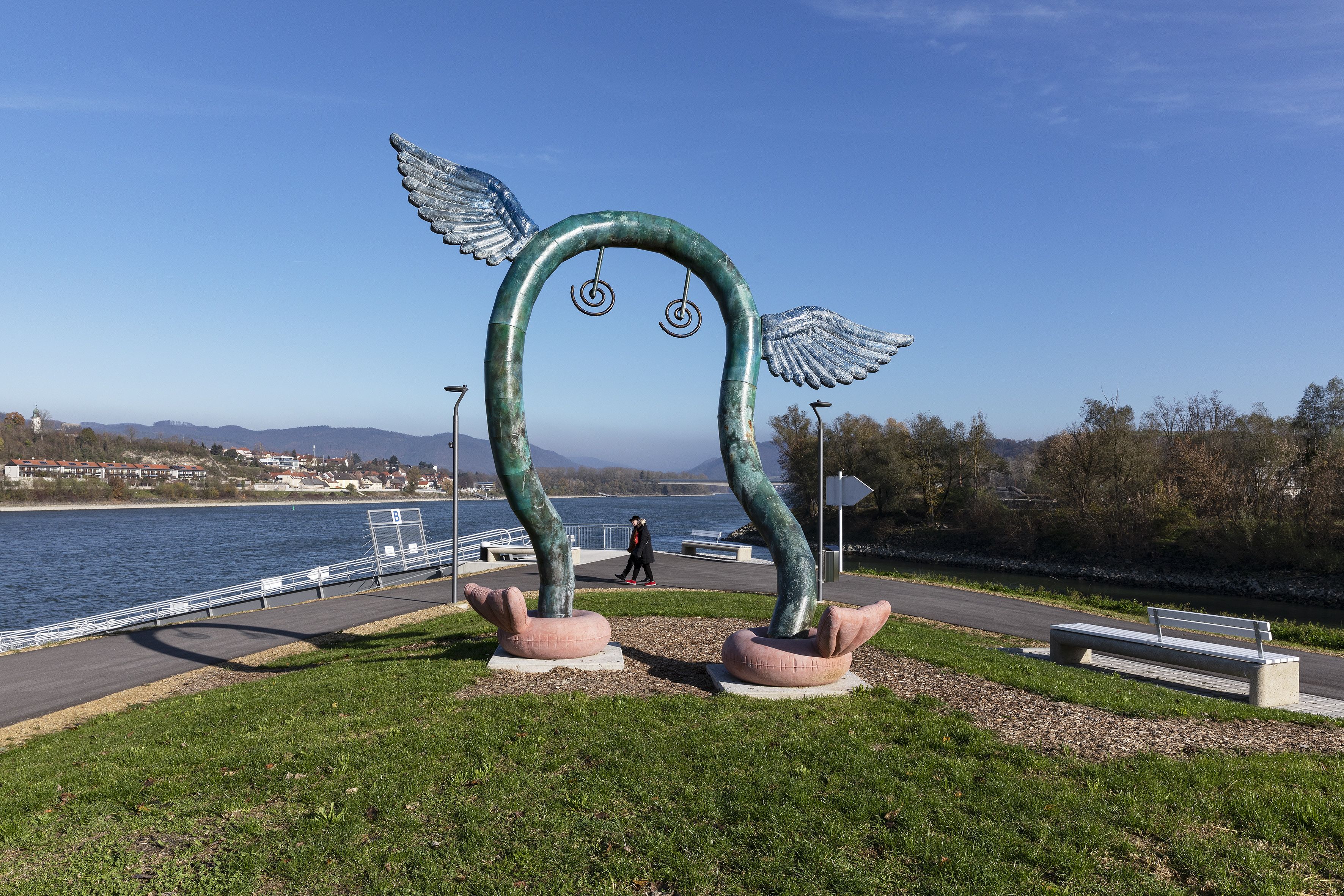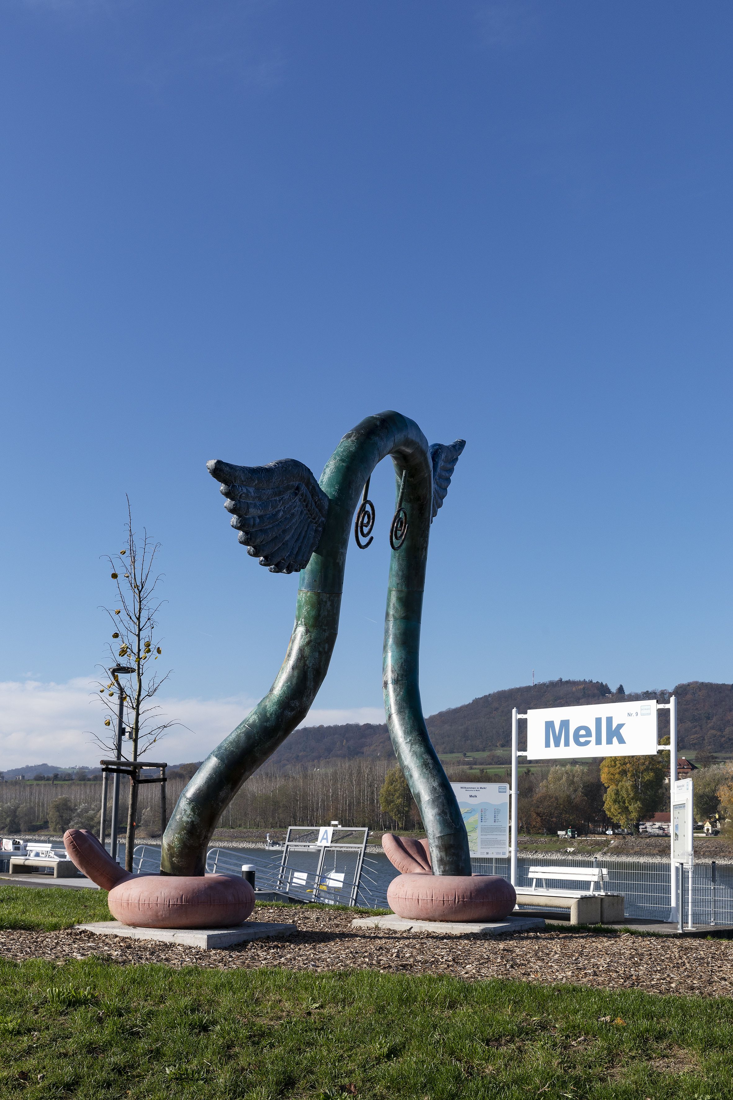 Mit einer überdimensionalen, eigens für den Ort geschaffenen Skulptur bespielt die in Tallin, Estland, und New York lebende Künstlerin Kris Lemsalu (geb. 1985) den Hafenspitz von Melk. In ihrer künstlerischen Praxis verwebt sie Skulpturen, Installationen und Environments zu vielschichtigen Erzählungen, die Geschichte und Gegenwart verbinden; Mythologien, Rituale und Erzählungen verdichtet sie zu neuen Konstellationen. Die Frage, wie sich unterschiedliche Kulturen und Gesellschaftsformen ineinander spiegeln, beleuchtet sie in ihrem skulpturalen Ensemble an der Donau, die zahlreiche kulturelle Räume vernetzt.