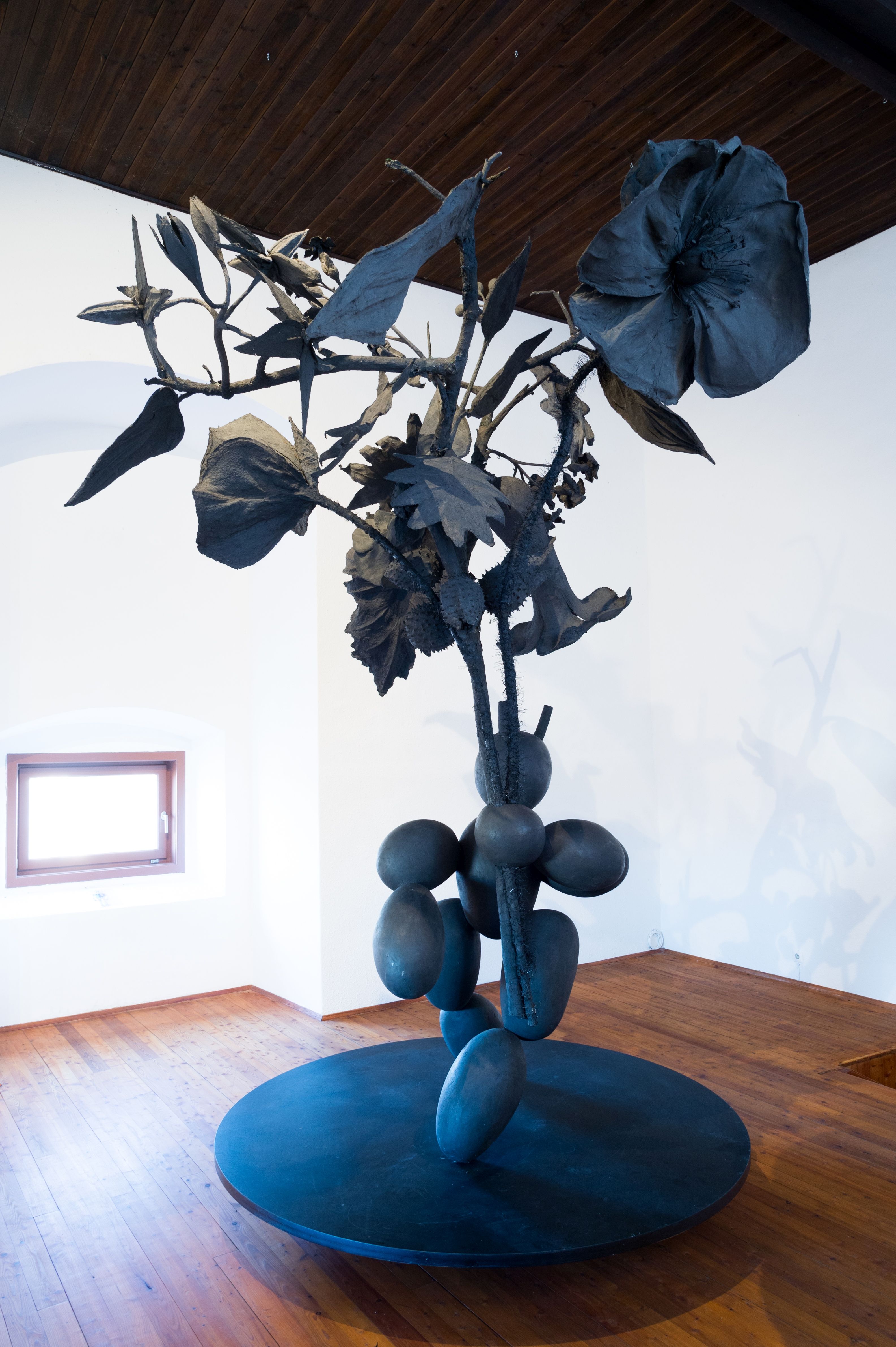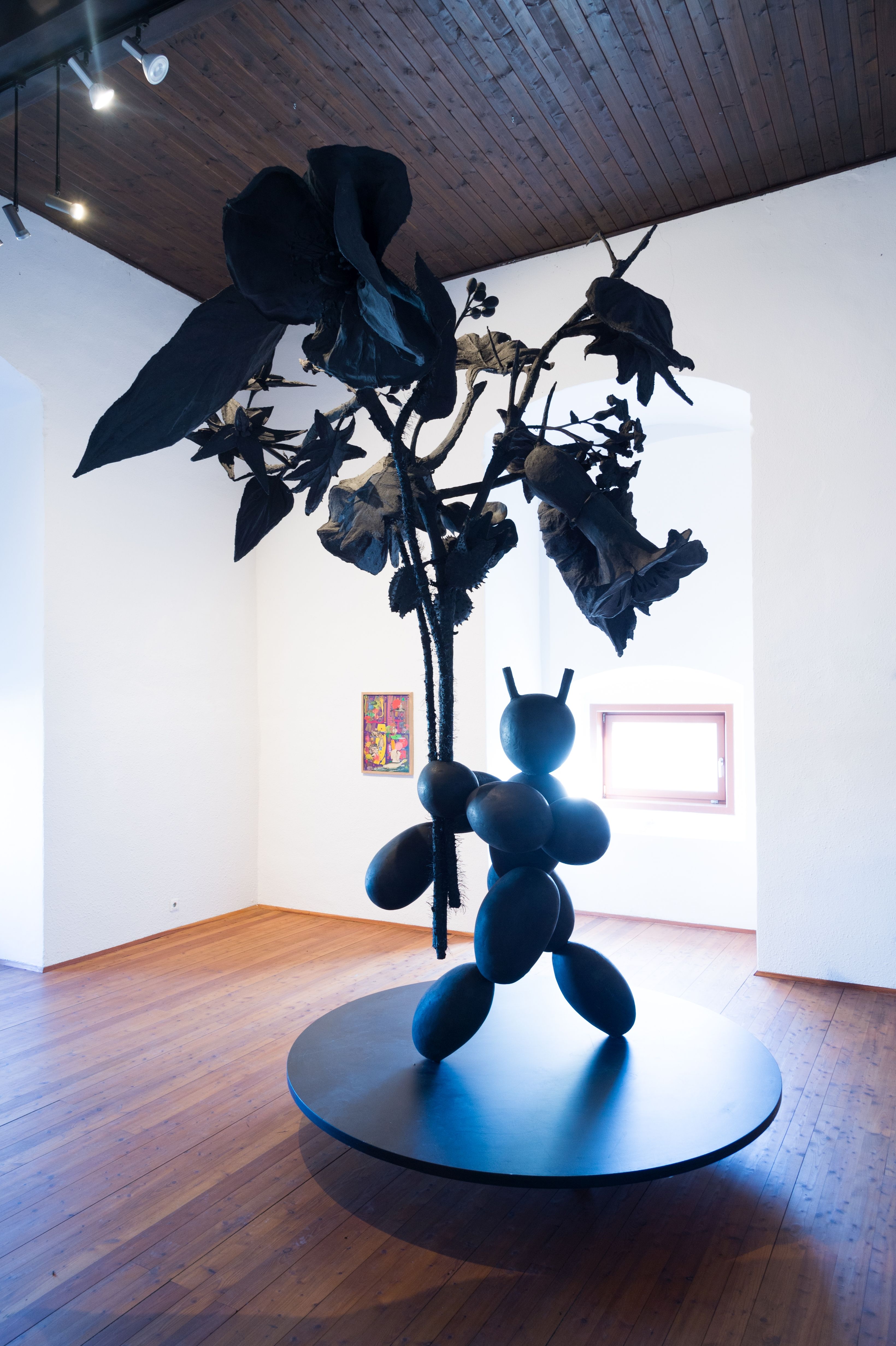 Die beinahe raumfüllende Skulptur Skins im sogenannten „Turmzimmer“, eine „wirkmächtige Monsterblume“ [2] zeigt eine schwarze Figur, ein Ballonmännchen, das einen Teufel darstellt [3], der ein Bouquet mit verschiedenen psychedelischen Pflanzen wie Mohnblumen (Opium), Stechäpfeln, Engelstrompeten oder Yopo in Händen hält. Die Skulptur bezieht sich auf die Zeit der kolonialen Expansion, als einerseits ekstatische Bewusstseinszustände aus den europäischen Gesellschaften verbannt wurden und gleichzeitig der Handel mit Drogen zum Motor und Vorläufer des globalen Handels avancierte. Die Künstlerin spielt mit dieser Arbeit auf die Opiumkriege zwischen Großbritannien und China an: Mit der „Neuen Seidenstraße“ scheint China nun auf der globalen Überholspur.
