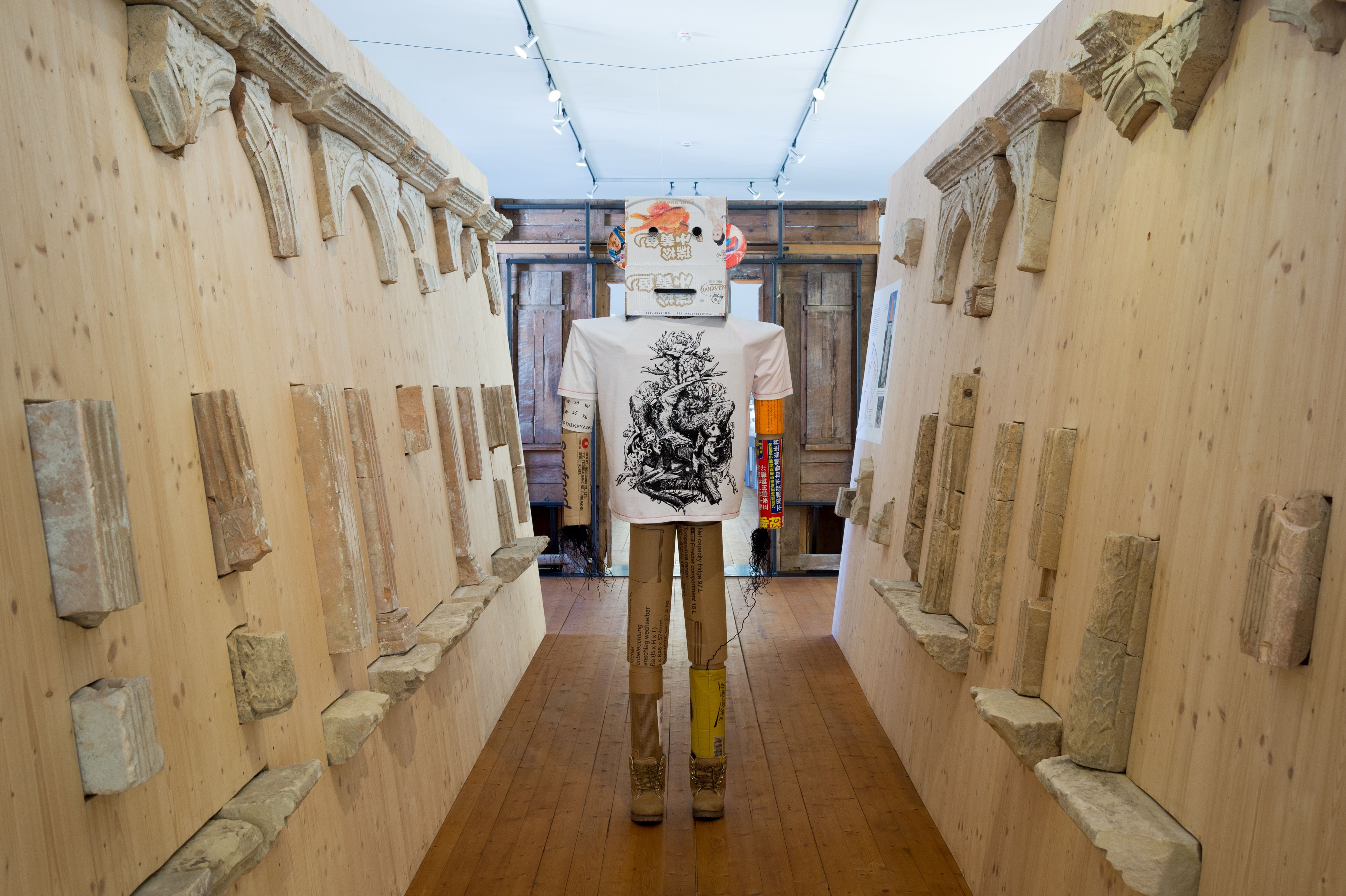 Assoziationen zu temporären Skulpturen von Paraden oder Protestkundgebungen, zu Dada und Nostalgie-Kinderspielzeug lässt die (noch kleine) Armee aus lebensgroßen „Robotern“ aufkommen, die sich unter Exponate der permanenten Sammlung gemischt haben. Aus Kartonverpackungen zusammengesetzt sind die fünf Figuren, deren Rohmaterial aus den Altpapiercontainern Wiens stammt, mit T-Shirts bekleidet, die ein von der Künstlerin entworfenes Wappen ziert. Dieses heraldische Zeichen – von jeher Ausdruck von Macht – kehrt an mehreren Orten in der Ausstellung wieder, so auch auf einer Flagge oder als Allover-Muster auf einem eigens angefertigten Kleid von Doujaks „Modelabel“ Not Dressed For Conquering.