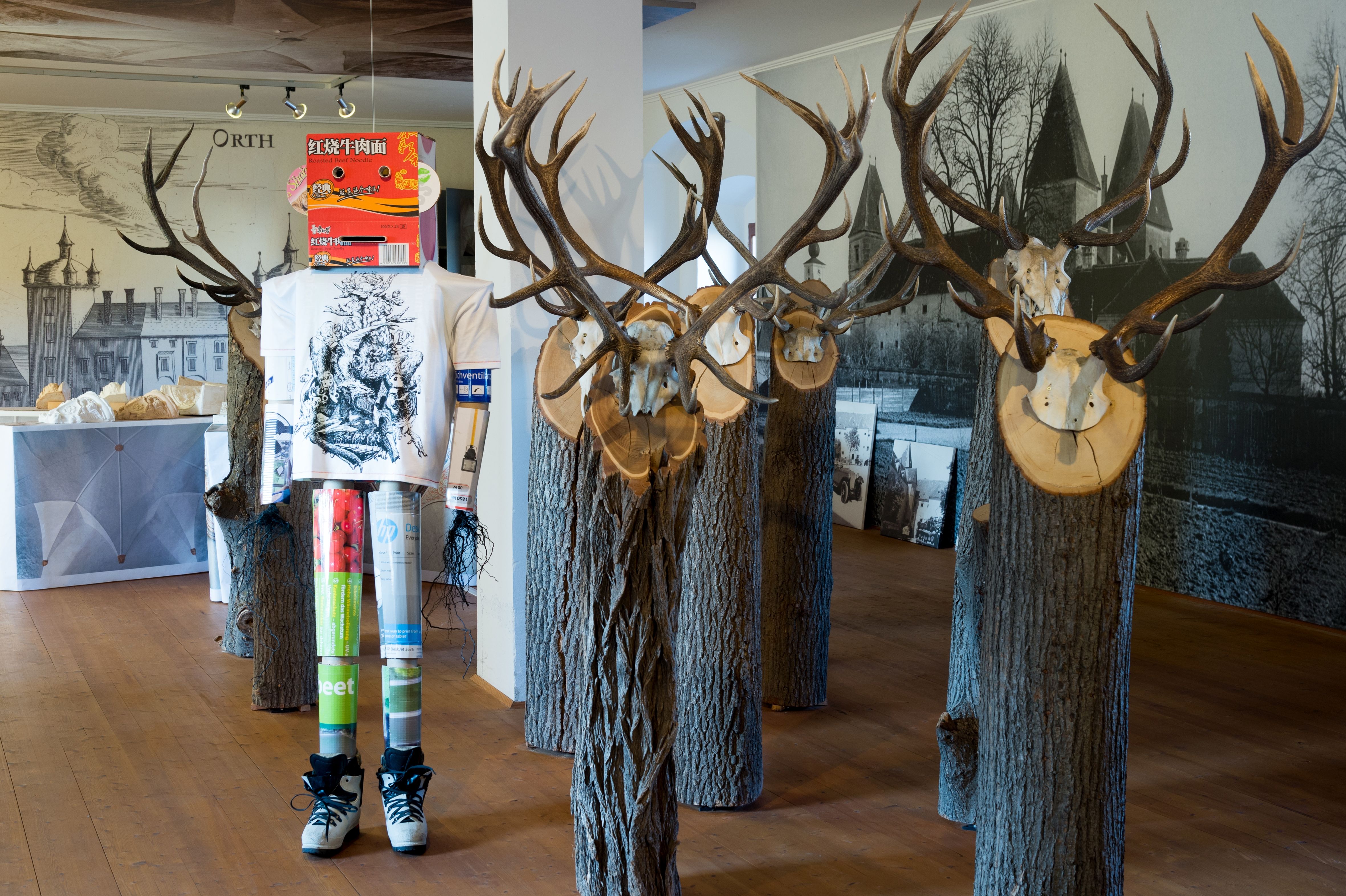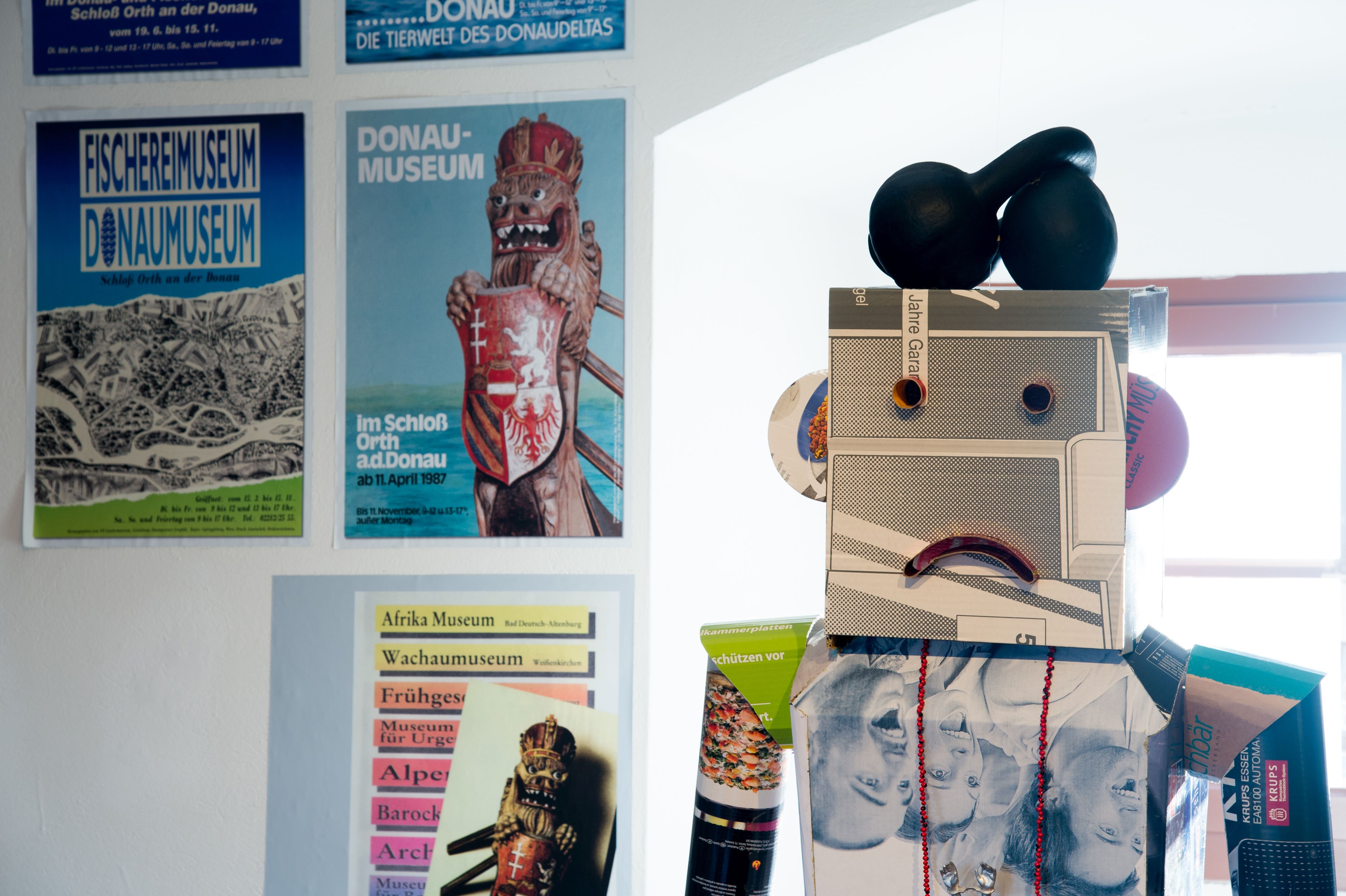 In der Ausstellung Karawanen im museumORTH zeigt Ines Doujak neue, eigens für die Ausstellung produzierte Arbeiten, die sie im Dialog mit der Sammlung alltagskultureller Gegenstände präsentiert – in Verbindung mit einer imposanten Großskulptur im traditionell für die zeitgenössischen Ausstellungen reservierten „Turmzimmer“.