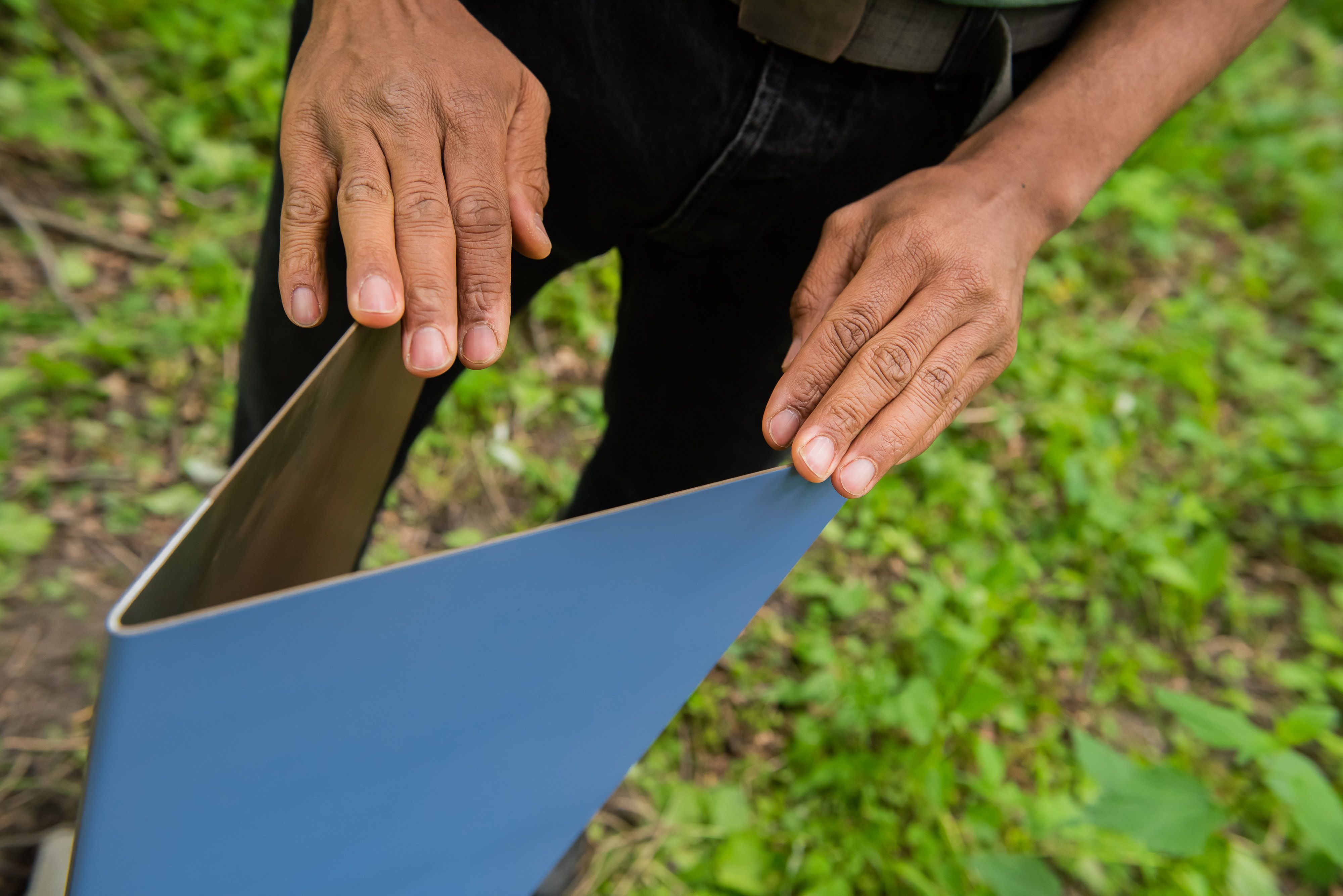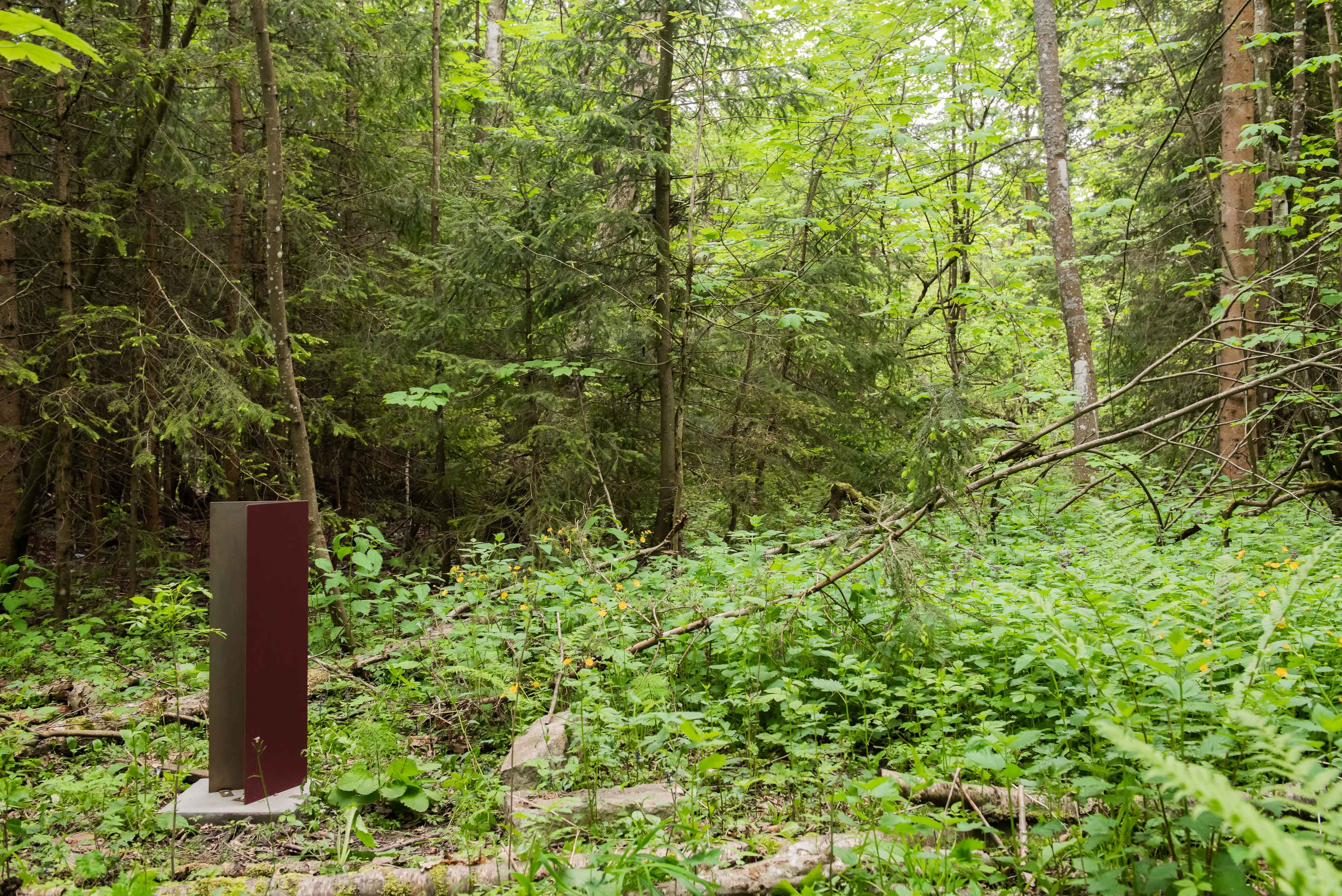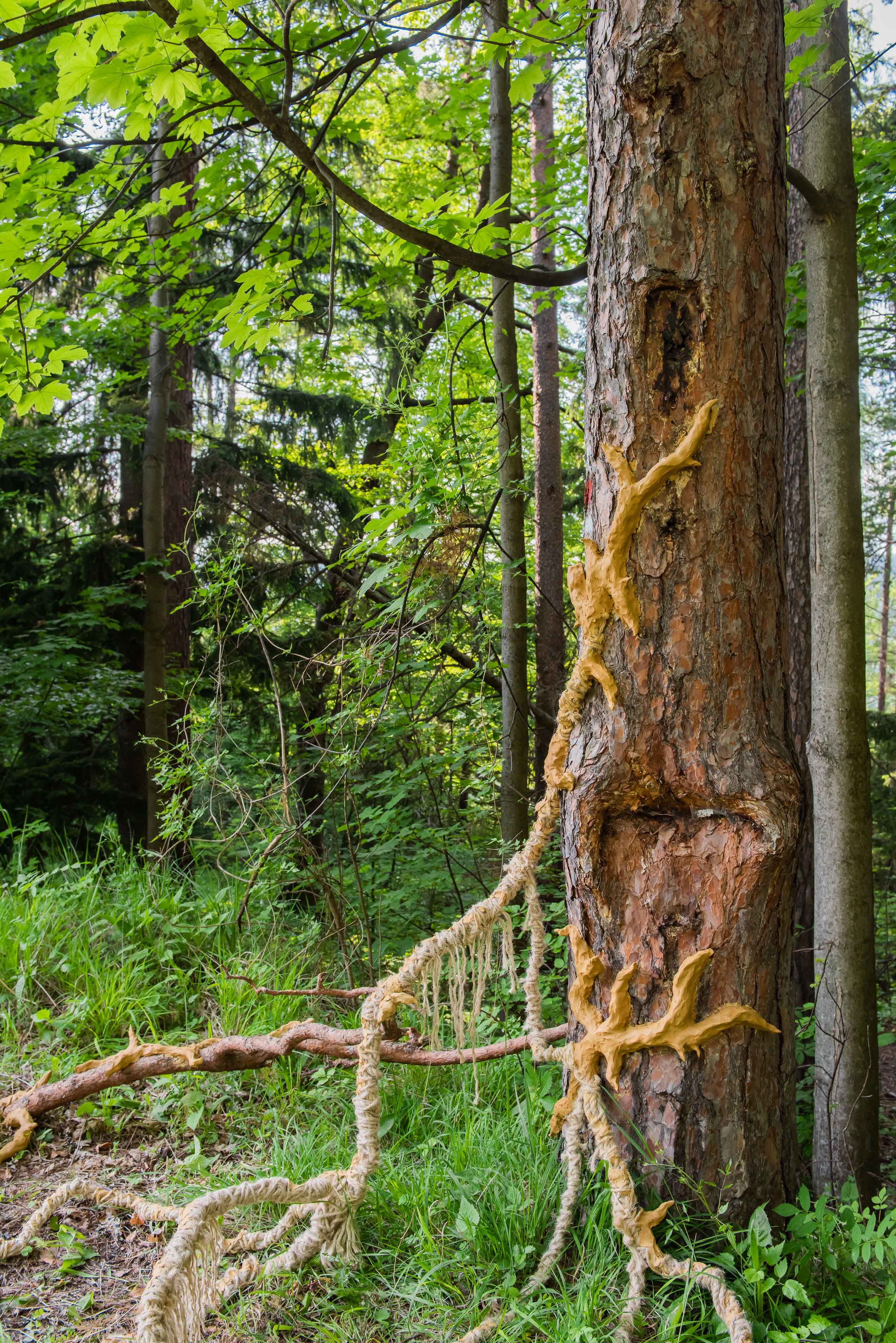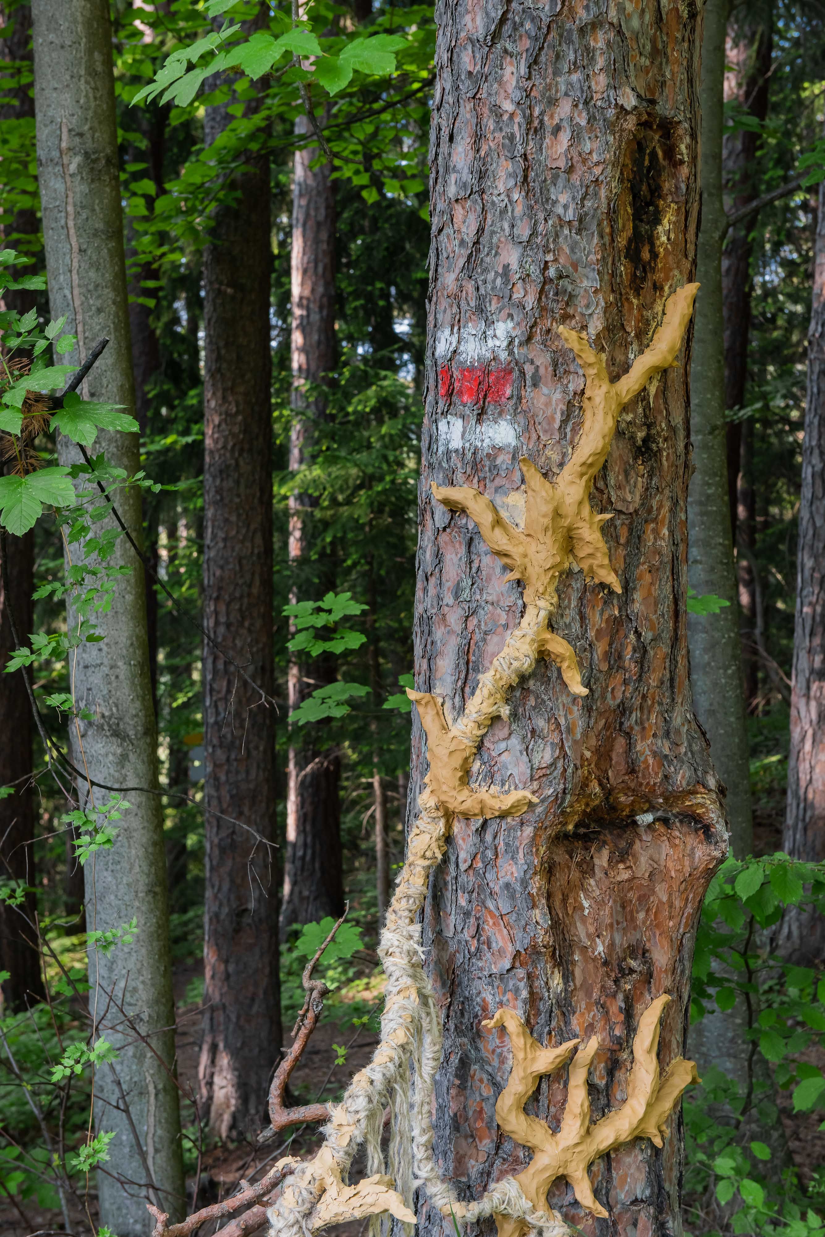 So wie die Natur das Konstruierte umwandelt, werden die Materialien von der Künstlerin zu einem Werk geformt – gleichsam als Hinweis auf das Gebäude des Verfalls, welches als Erstes vom Wald aus zu sehen ist. Die Installation auf der gegenüberliegenden Seite verweist dagegen auf den Pfad, der zum Wald führt, friert den Moment in der Zeit ein und lenkt unsere Aufmerksamkeit auf den unvermeidlichen Prozess der Transformation der Natur.