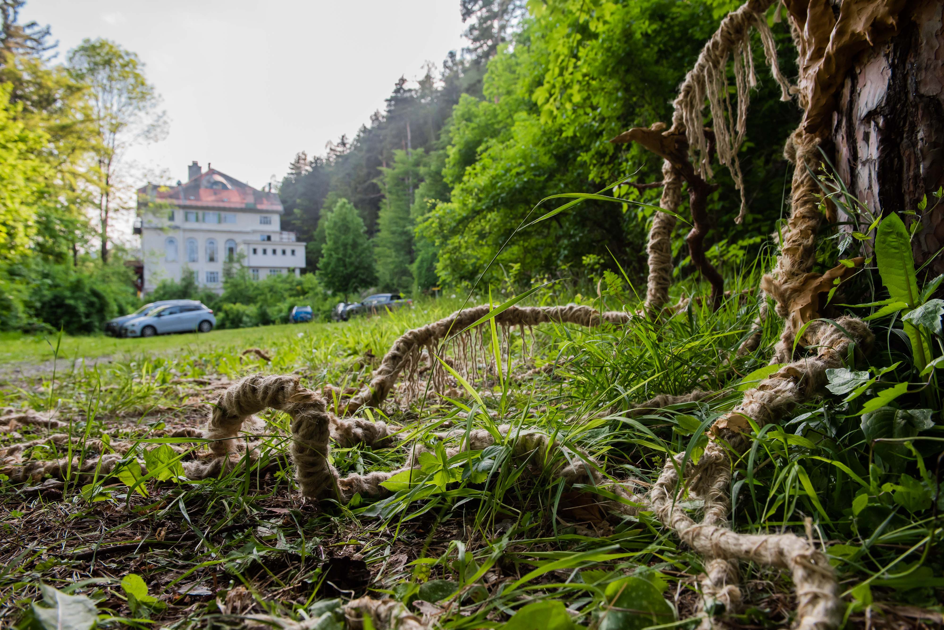 Der einst karge Wald wird von Strukturen bevölkert, die ihm durch menschliche Kraft und Willen eingepflanzt wurden. Olha Horiunovas Werk verweist auf die Verbindung zwischen dem Terrain und den künstlichen, in die Landschaft eingewachsenen Objekten. Da die verfallenen Gebäude nun mit den Steinfelsen verschmolzen sind, wird in Bindung das Phänomen der Verflechtung zum Thema: wie das vom Menschen Geschaffene, das Konstruierte, im Gegensatz zum Entstandenen, die Wege der Natur kreuzt und wie die Natur das vom Menschen Geschaffene allmählich in die Wälder des Semmerings aufnimmt und es auf diese Weise wieder zu einem Teil der Landschaft wird.