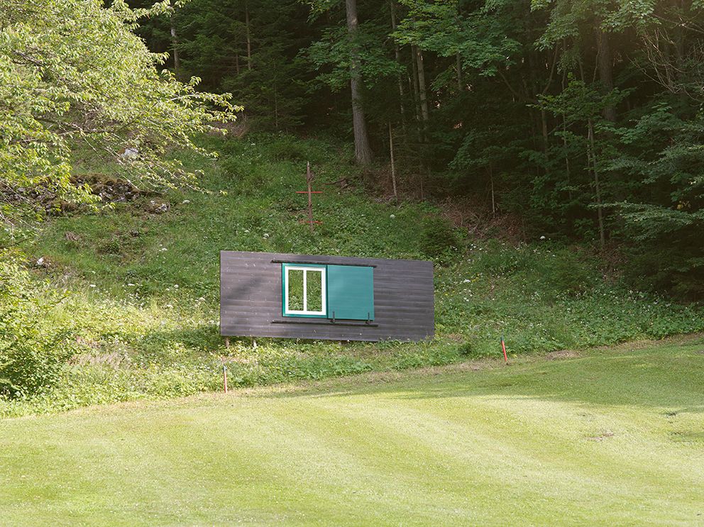 Das Landhaus Khuner im Semmering-Rax-Gebiet ist eine Ausnahme. Als eine der letzten Arbeiten Adolf Loos´ hebt sich das Bauwerk sichtbar von seinem architektonischen Umfeld ab. Loos bahnbrechendes Konzept des »Raumplans«, das Denken in Räumen und Kuben und nicht in Plänen, wurde im Looshaus verwirklicht. Hannes Zebedin verknüpft in seiner Installation am legendären alpinen Golfplatz die Moderne mit den traditionellen Formen. Ein Ausschnitt der Fassade der Villa wurde nachgebaut, wie eine Art Schutzwall steht diese nun im Hang. Das bei Loos gefundene Fensterladensystem reguliert durch seine Bewegung »Ströme«, öffnet und schließt sich wie eine Schleuse. Die industrialisierte Landwirtschaft hat mittlerweile auch alpine bäuerliche Formen der Arbeit zum Verschwinden gebracht. Zebedin erinnert sich ihrer und verwendet eine Formation der vergessenen Heumännchen und Schwedenreitern in strahlenförmiger Anordnung für seine Installation.