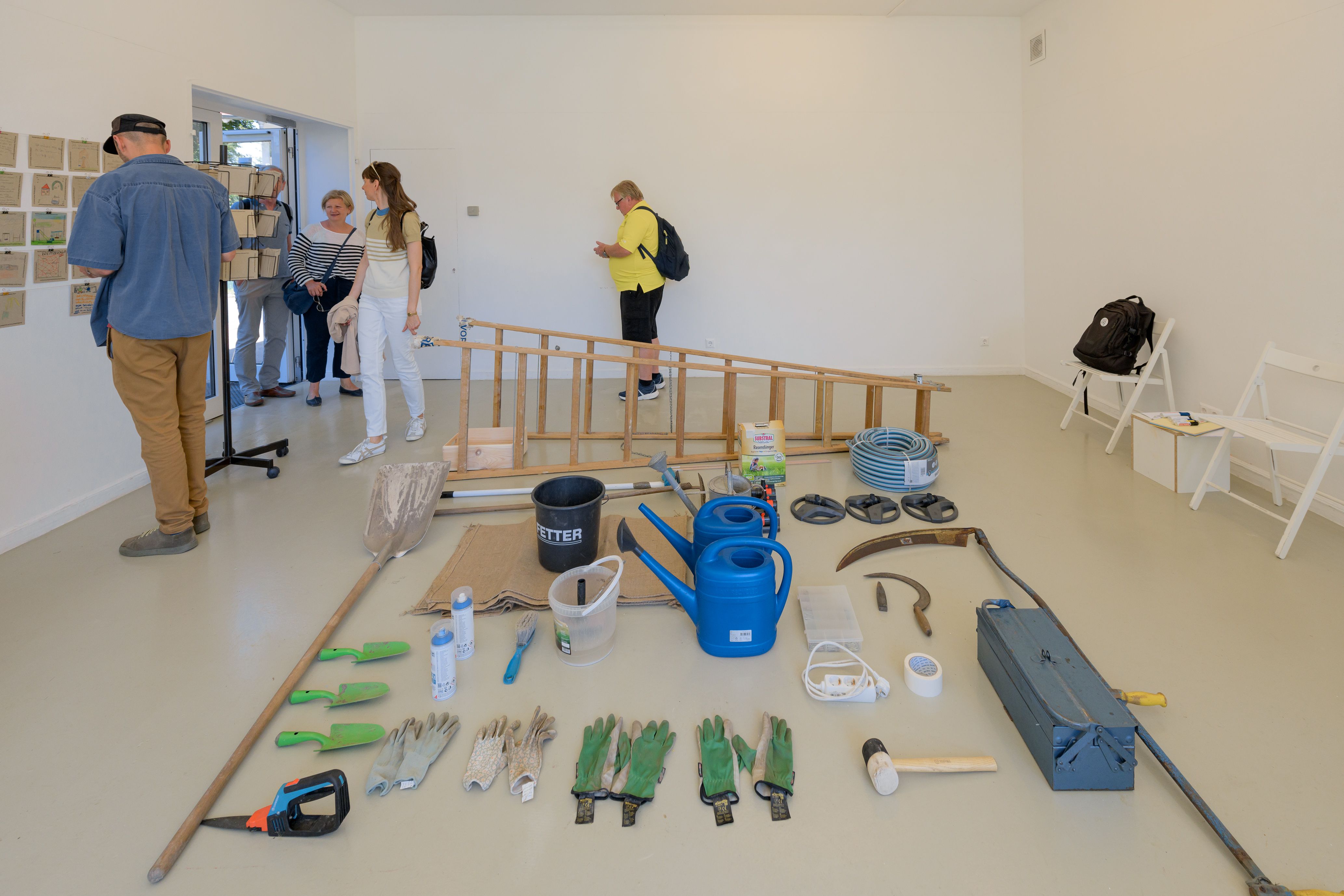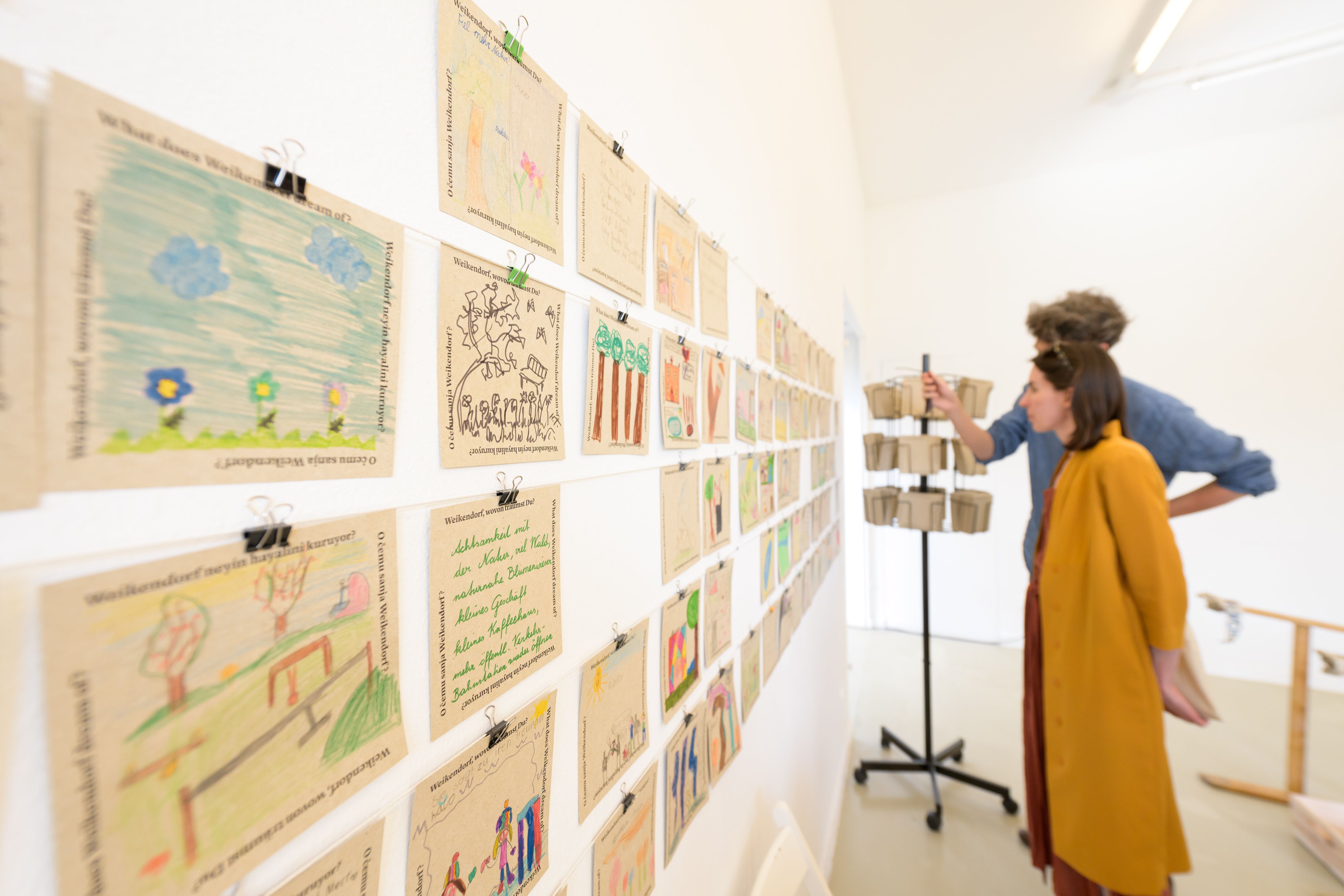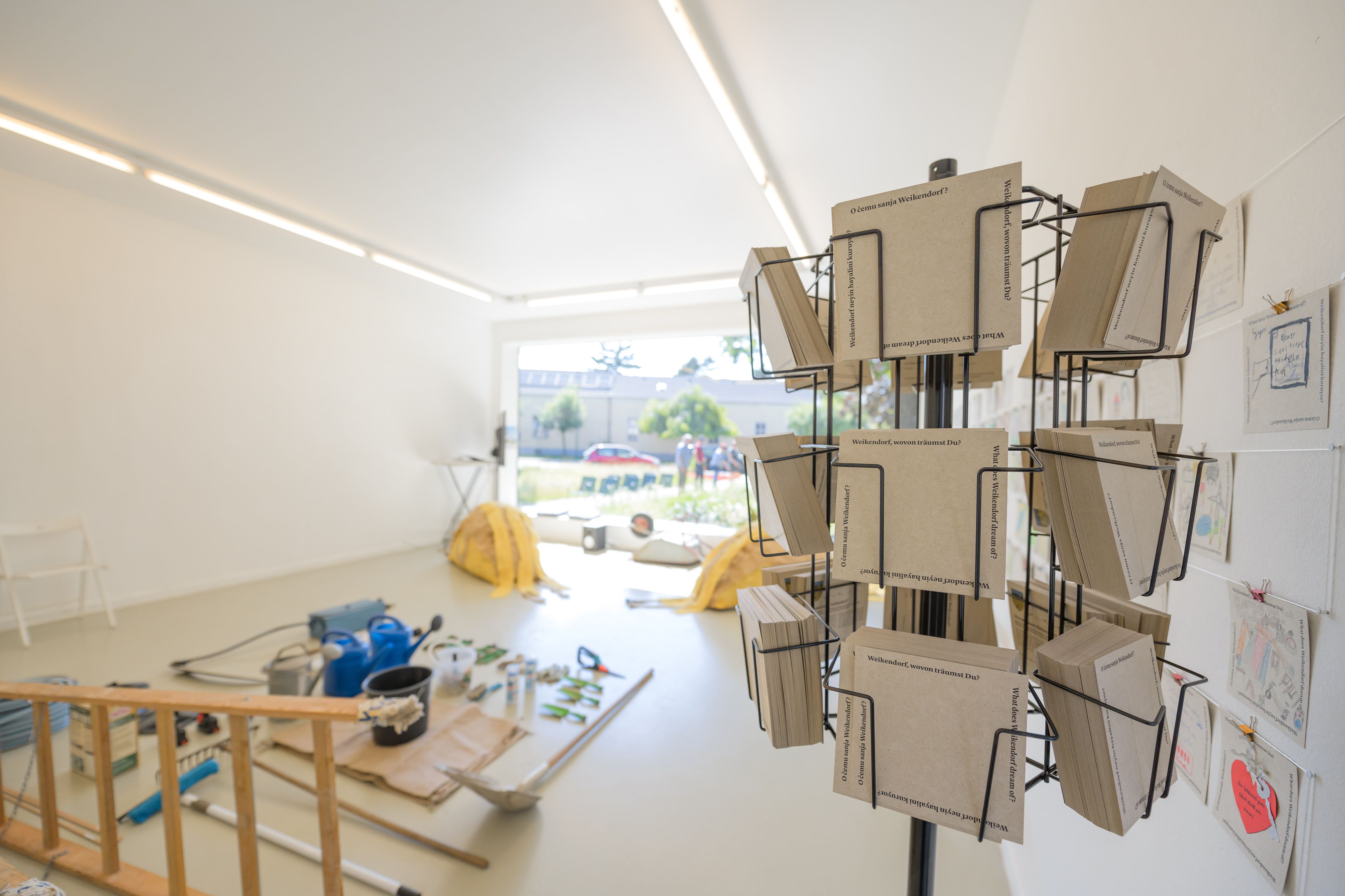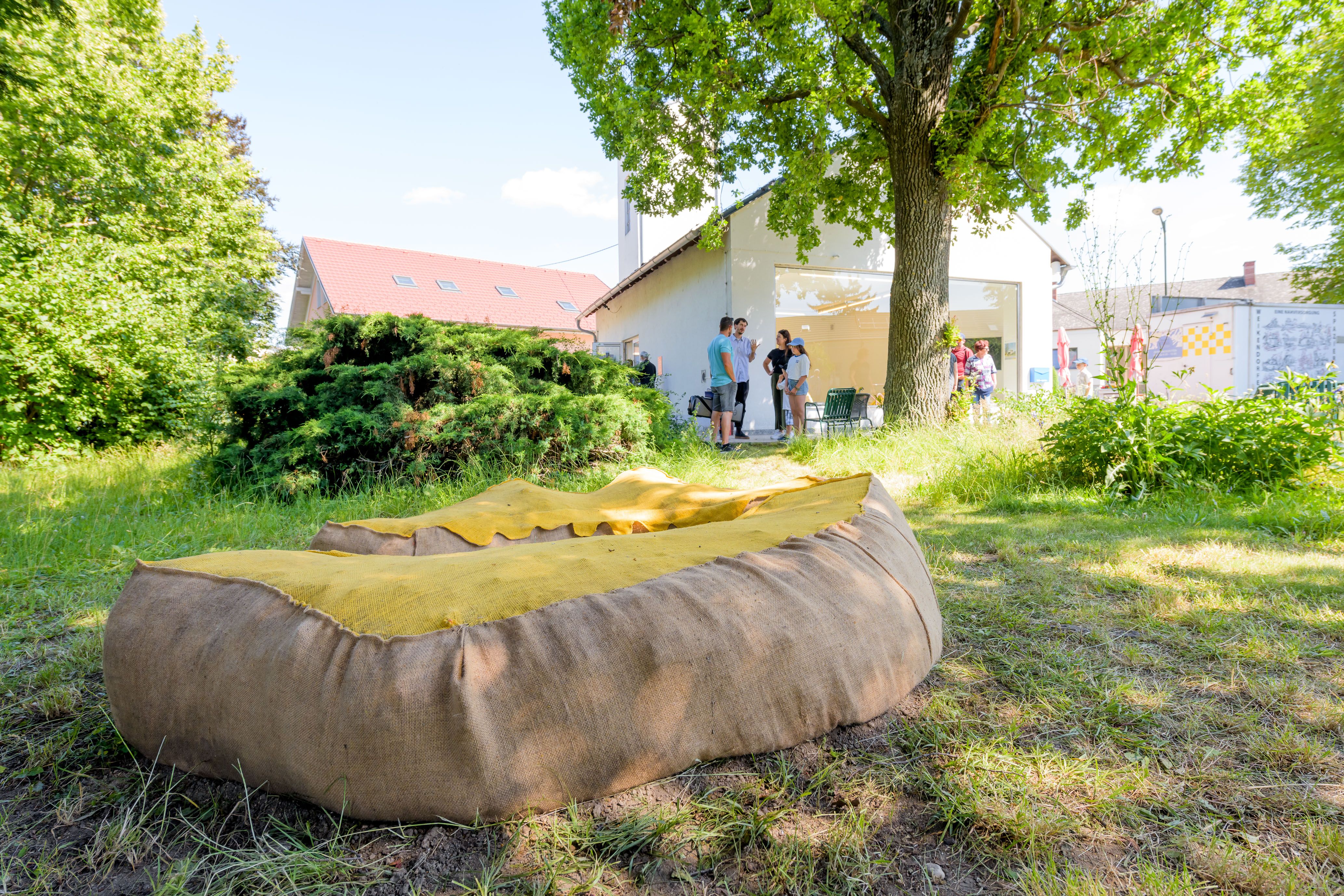Ihre Intervention fand auf zwei Ebenen statt: einerseits mit eigens gestalteten Objekten am Rathausplatz in Weikendorf – sogenannten „geselligen Möbeln“ –, mit denen sie physische Anreize zum Verweilen und Interagieren schufen. Andererseits sammelten sie – gewissermaßen als Metaebene – Geschichten der Dorfbewohnerinnen und -bewohner, verteilten Postkarten mit Fragen und luden zur Dorfversammlung ein. Die gesammelten Stimmen und Geschichten wurden im Kunstraum präsentiert, der zu einem lebendigen Archiv des gemeinsamen Dialogs wurde.