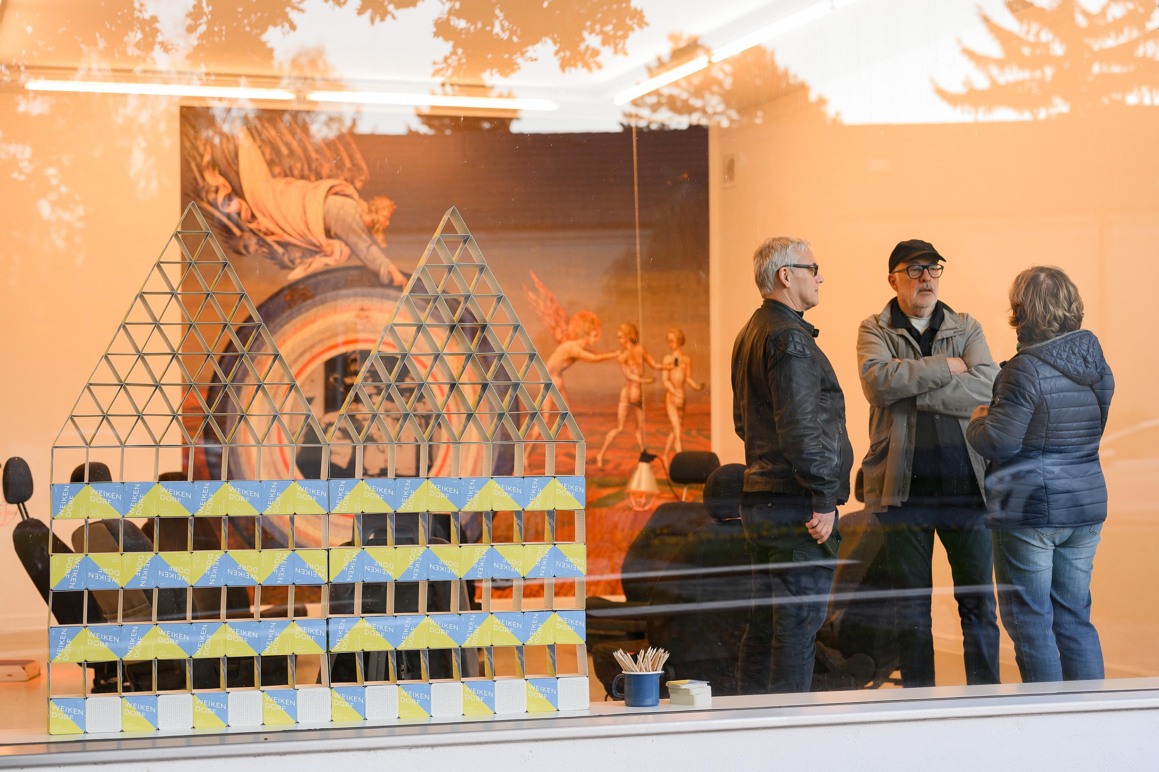 Tsai-Ju Wu, aufgewachsen in einem Dorf in Taiwan und seit 13 Jahren in Wien lebend, nutzt in ihrer Arbeit die Metapher des Kartenhauses, um die Fragilität von Ankommen und Zugehörigkeit sichtbar zu machen. Für das instabile Gebilde, das jederzeit in sich zusammenfallen kann, verwendet sie zahlreiche selbst gestaltete Bierdeckel. Auf deren Vorderseite sind vor gelb-blauem Hintergrund die Postleitzahl und das titelgebende „Engel am Feld“ zu lesen, das wie ein Logo auf das Wappen des Dorfes verweist. Die Rückseiten zeigen ein Durcheinander aus Buchstaben, in dem sich Begriffe wie „Heimat“, „Traktor“, „Gemüse“ oder „Erntezeit“ finden lassen. Diese Schlagworte verbinden lokale Lebensrealität mit individuellen Erfahrungen und verweisen aufgrund ihrer Form als „Buchstabensalat“ auf die frei verfügbare Zeit von Menschen. In einer Gesellschaft, die in einem sehr starken Wandel begriffen ist, verweist das Kartenhaus aber auch darauf, dass Identität nicht statisch ist, sondern immer wieder neu hergestellt werden muss, im Spannungsfeld zwischen Herkunft, sozialem Umfeld und gegenwärtigem Lebensort.