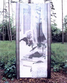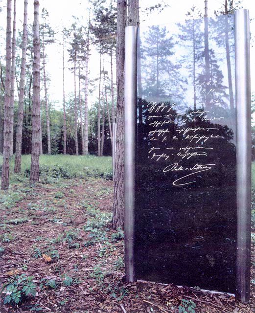 Zwei mit Aussagen, bzw. Textzitaten von Bertha von Suttner bedruckte Glastafeln wurden in einen Föhrenhain des Schloßparks plaziert. Eine dritte stellt die Schriftstellerin bei ihrer Arbeit für den Frieden, an ihrem Schreibtisch sitzend dar.