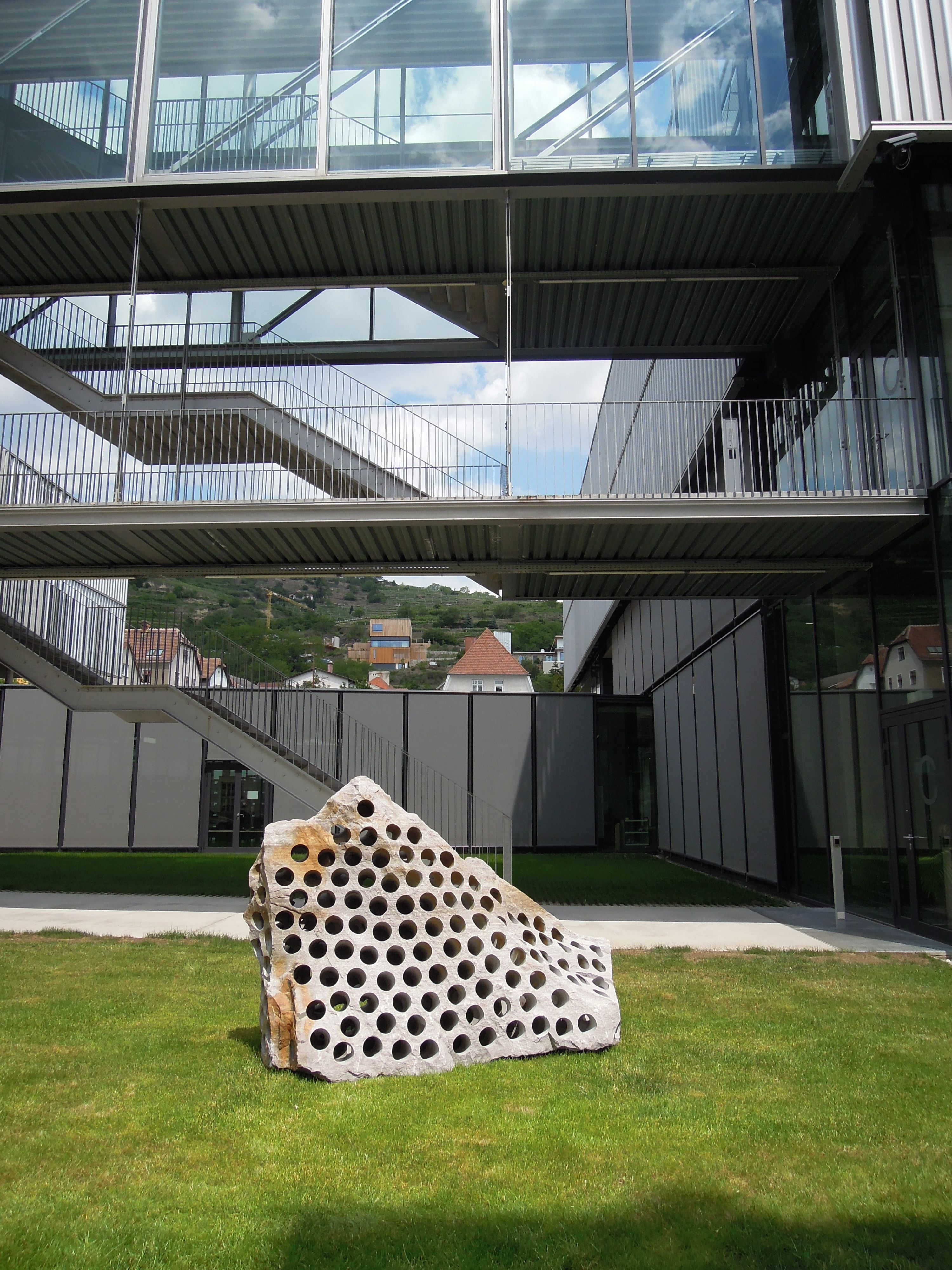 Bei der Arbeit "Kristallmantel" wurde ein Kalkstein aus einem Steinbruch bei Krems systematisch durchbohrt. Unter Beibehaltung der äußeren Kontur entstand durch einen für Tony Cragg typischen künstlerischen Eingriff in vorgefundene Materie eine Struktur, die neue Einblicke und Zugänge freigelegt.