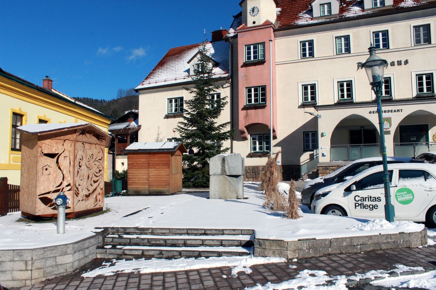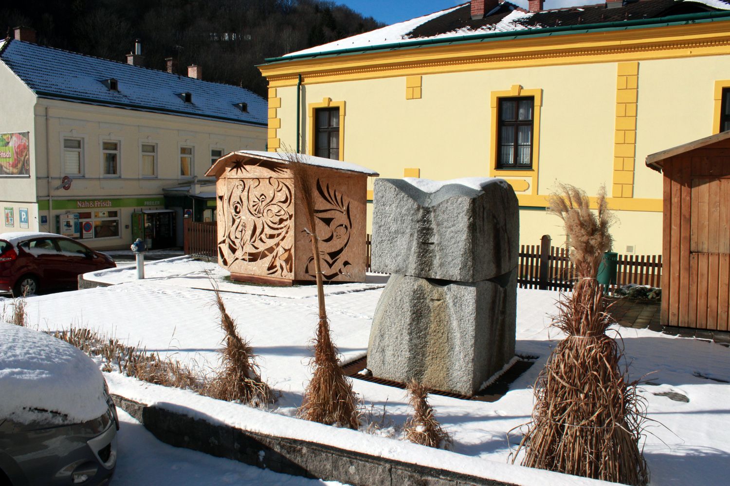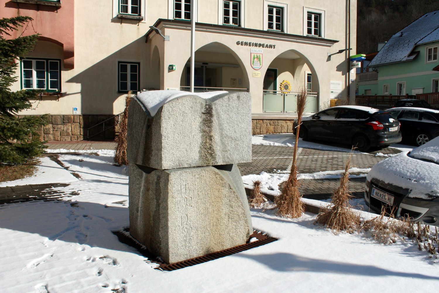 Die Brunnenskulptur auf dem Marktplatz von Edlitz besteht aus zwei übereinander geschichteten Steinblöcken. Teils sind ihre Oberflächen fein geschliffen, teils sind sie roh belassen. Das Wasser rinnt aus dem Raum zwischen den beiden Steinen über kleine Vertiefungen in der Oberfläche ins Freie.