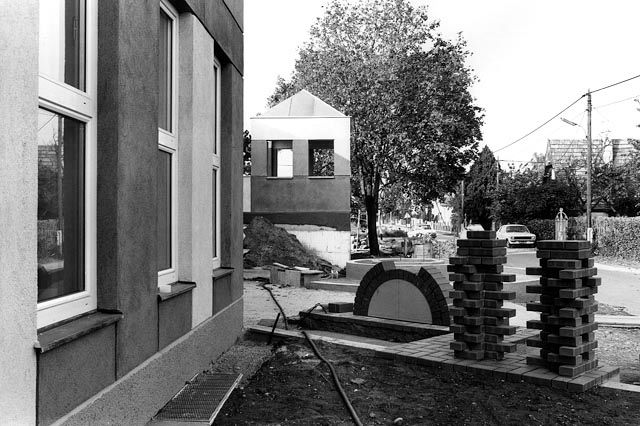 Die Objektgruppen nehmen die Intentionen und den Rhythmus der dahinter liegenden Baukörpergliederung auf, überhöhen und kontrapunktieren sie. Diese Gliederung setzt sich fort in den Abgrenzungslinien und Abtreppungen zur Straße hin, wobei eine platzförmige Öffnung vor dem Eingang zum Kindergarten eine geschützte Übergangszone schafft. Die feinen Farbkompositionen der Fassade finden in den Materialfarben des erdigen Rot der Klinkerziegel und des Rostbraun des Eisens eine Fortsetzung und Akzentuierung.