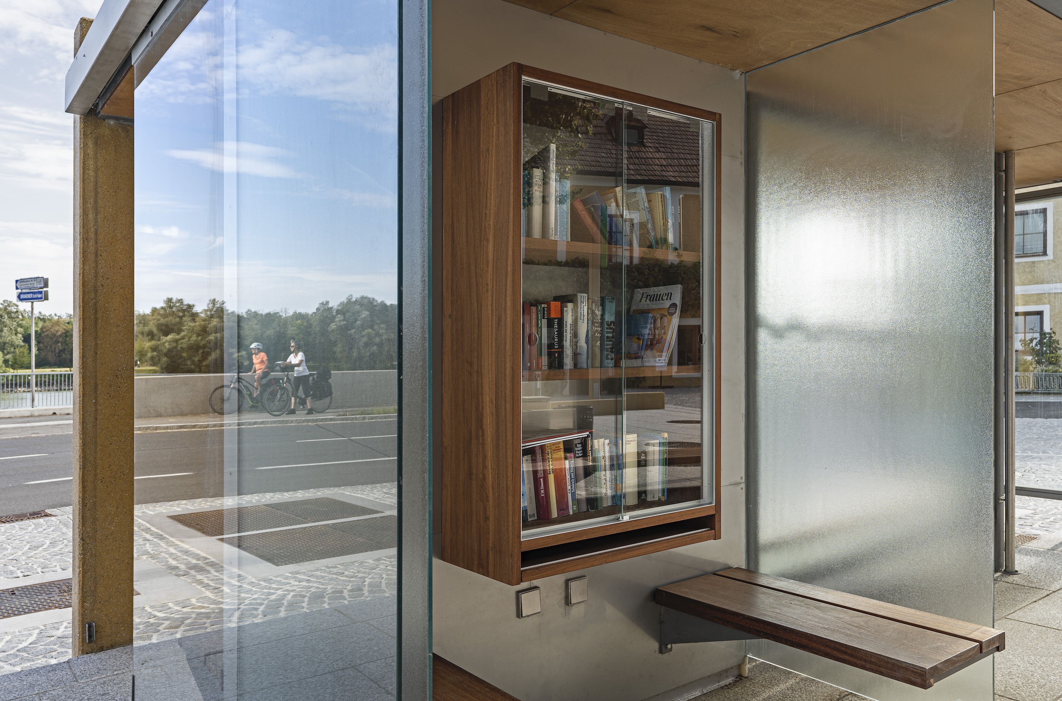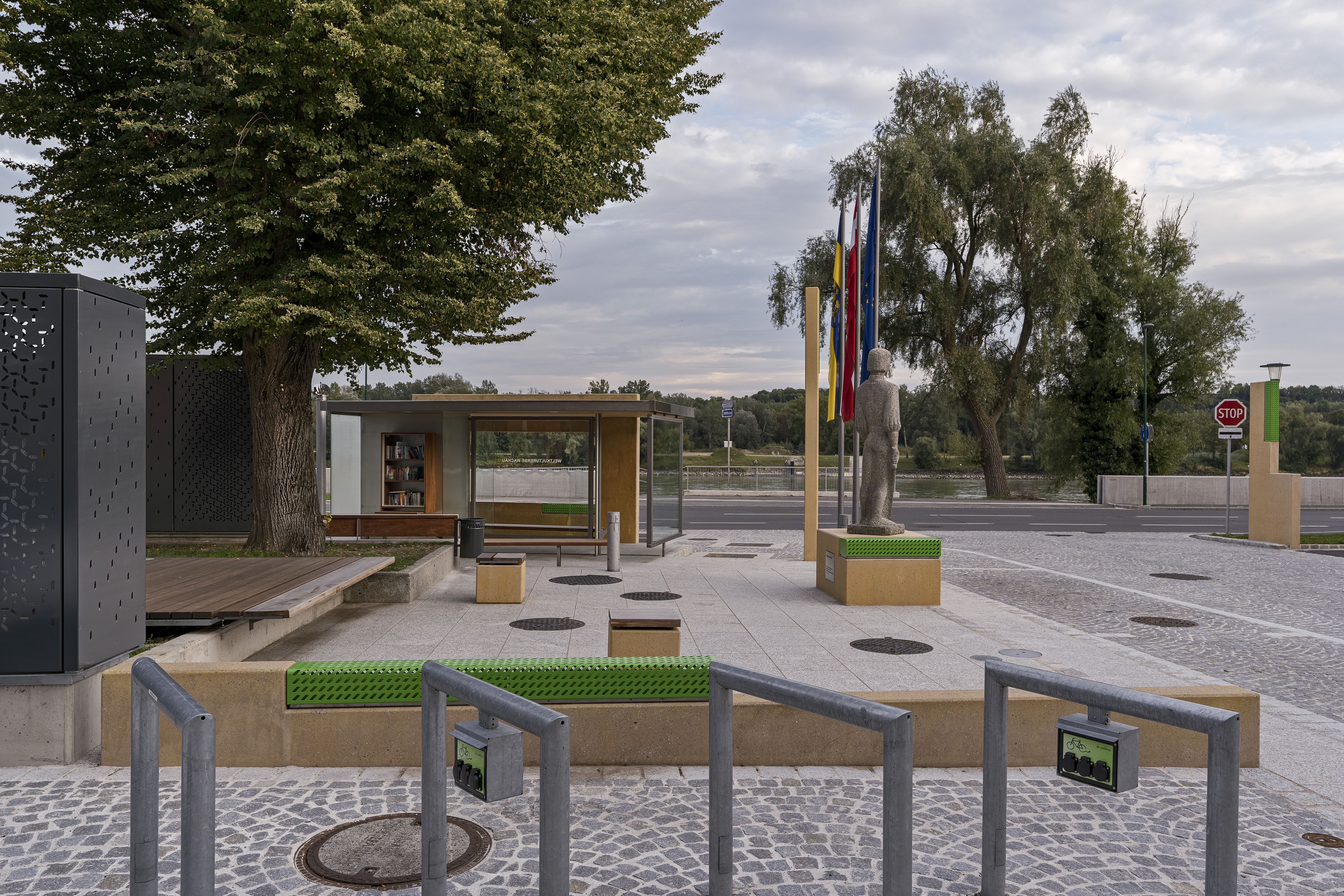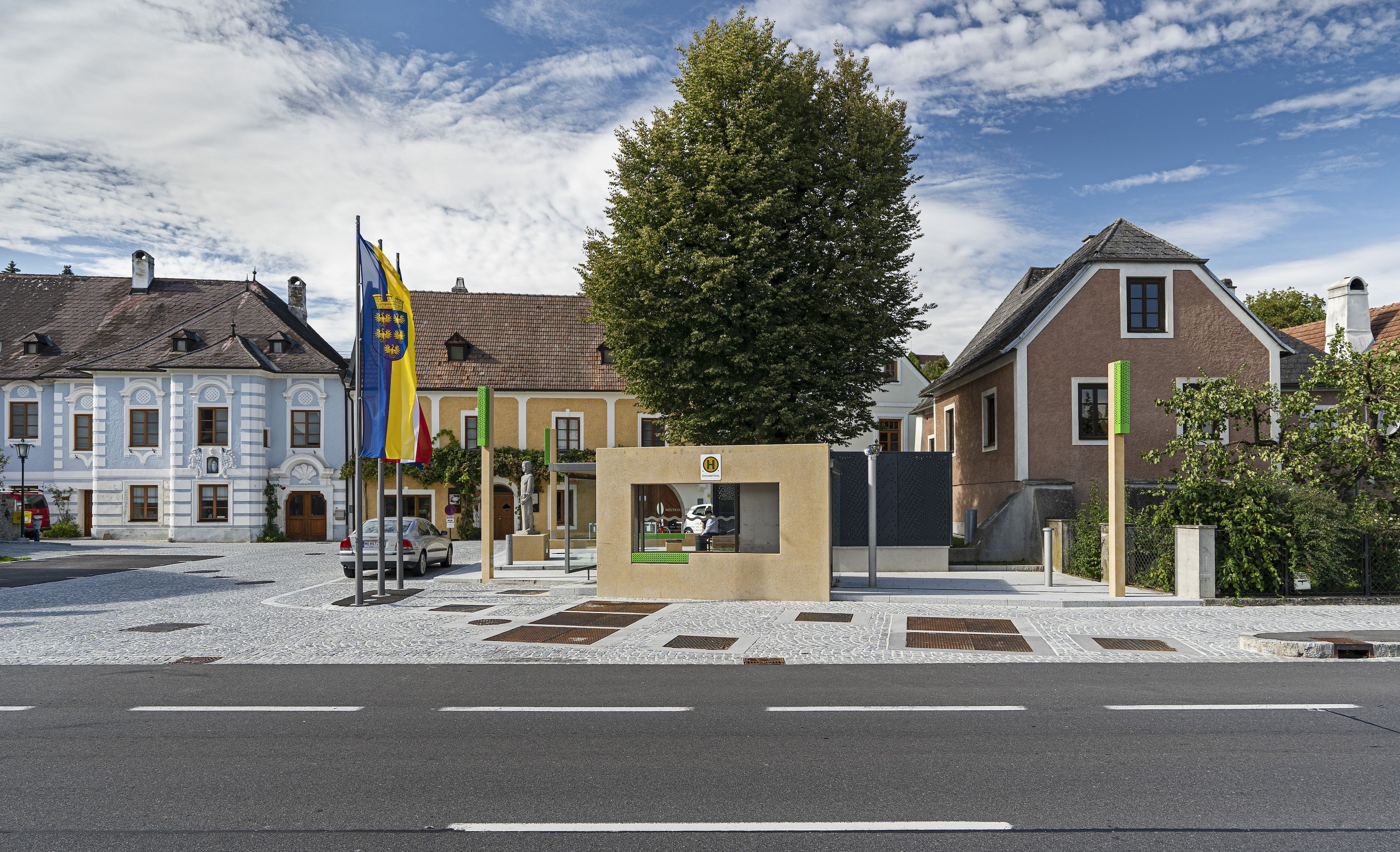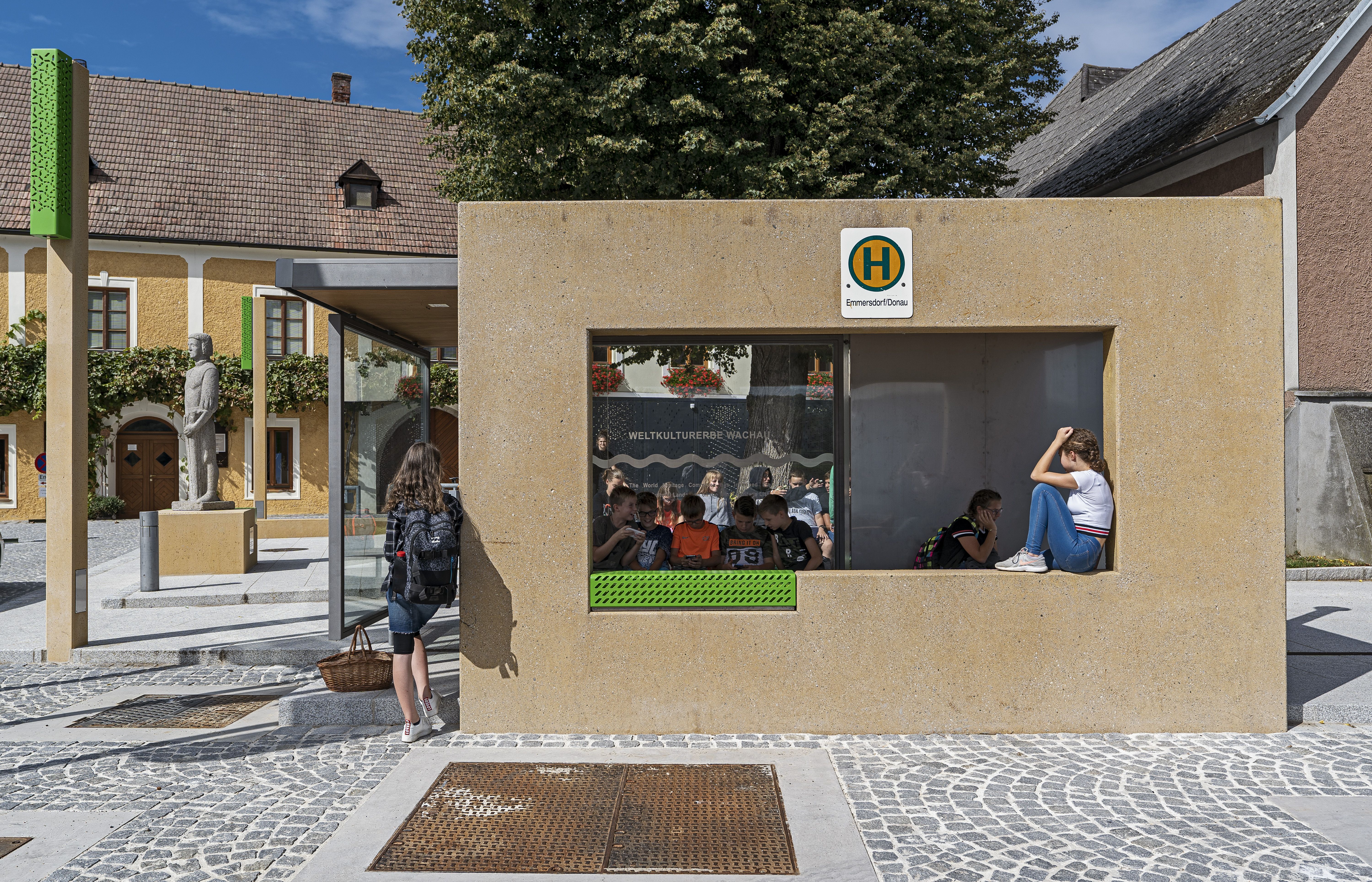 Die Neugestaltung des Georg-Prunner-Platzes an der Donauuferstraße mit einem Buswartehäuschen stellt ein komplexes architektonisches Konzept dar, das auf der einen Seite die einzelnen Funktionsbereiche für Fußgänger, Auto- und Radfahrer durch ein Lichtleitsystem klar abtrennt, auf der anderen Seite den Platz an die zentrale Fußgängerzone optisch und akustisch anbindet. Der Architekt Franz Sam installierte vier Lichtobjekte. Eines, gleichzeitig lichtdurchlässiges Wartehäuschen mit Flugdach, bietet Informationstafeln und Telefonzellen an. Zwei weitere signalisieren die Grenze zwischen Platz und Straße und weisen in den Ort. Die zweite Achse bilden drei Klangobjekte. Nach Passieren eines Bewegungsmelders ertönen auf Emmersdorf bezogene, von Roman Holzmayr gestaltete Klangszenarien wie "Sturmwetter" oder "Nachtfluss". Neben der funktionalen Klarheit liegt die Qualität der Gestaltung in der Verbindung alter und neuer architektonischer Elemente, wie etwa in der Integration eines Lichtobjektes in den im Zuge der Neugestaltung erhöhten Sockel der Skulptur des Widerstandskämpfers Prunner. Das Zusammenspiel von Architektur, Licht und Klang regt die Wahrnehmung an und schärft den Blick.