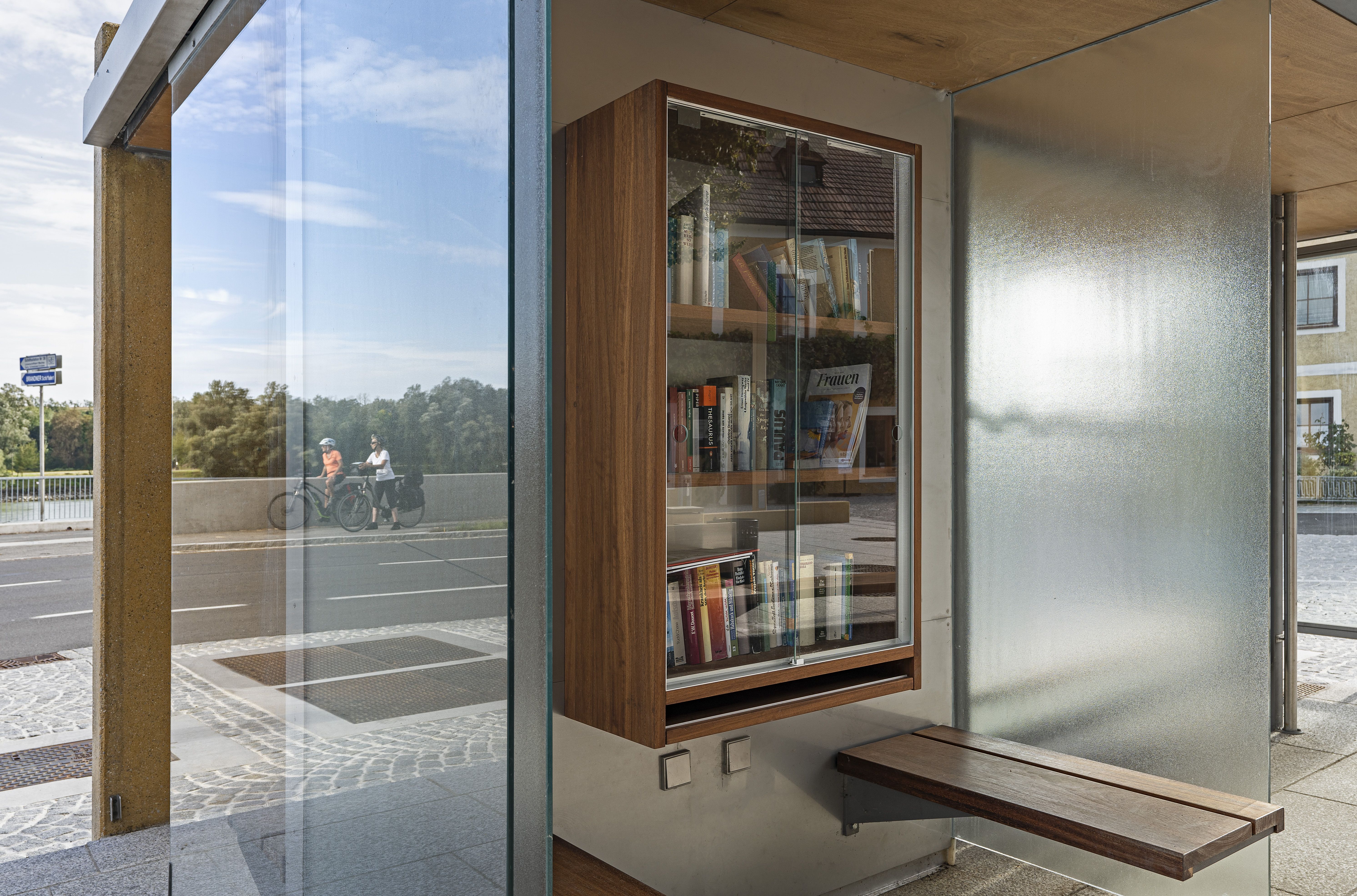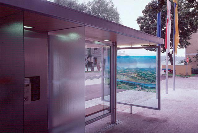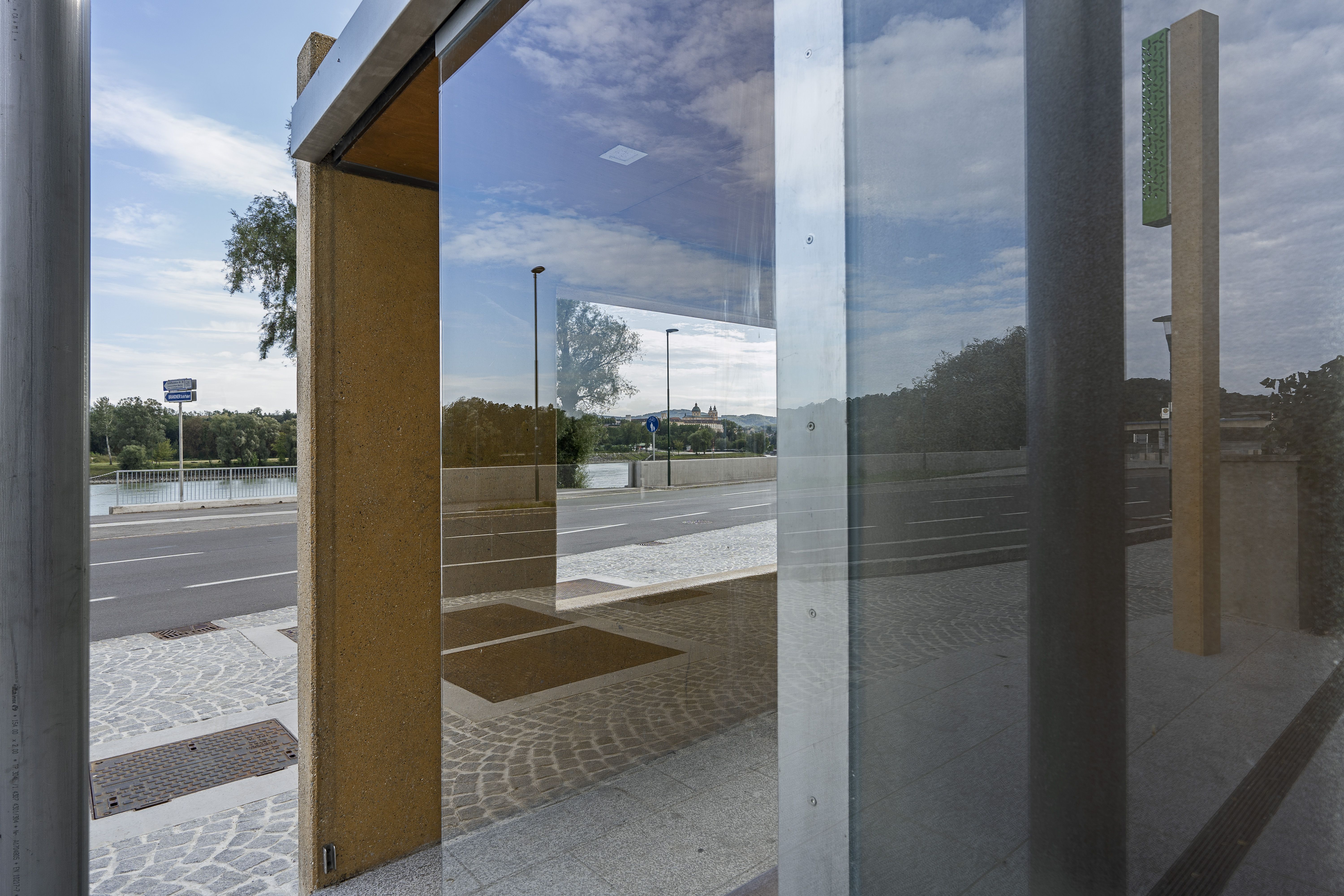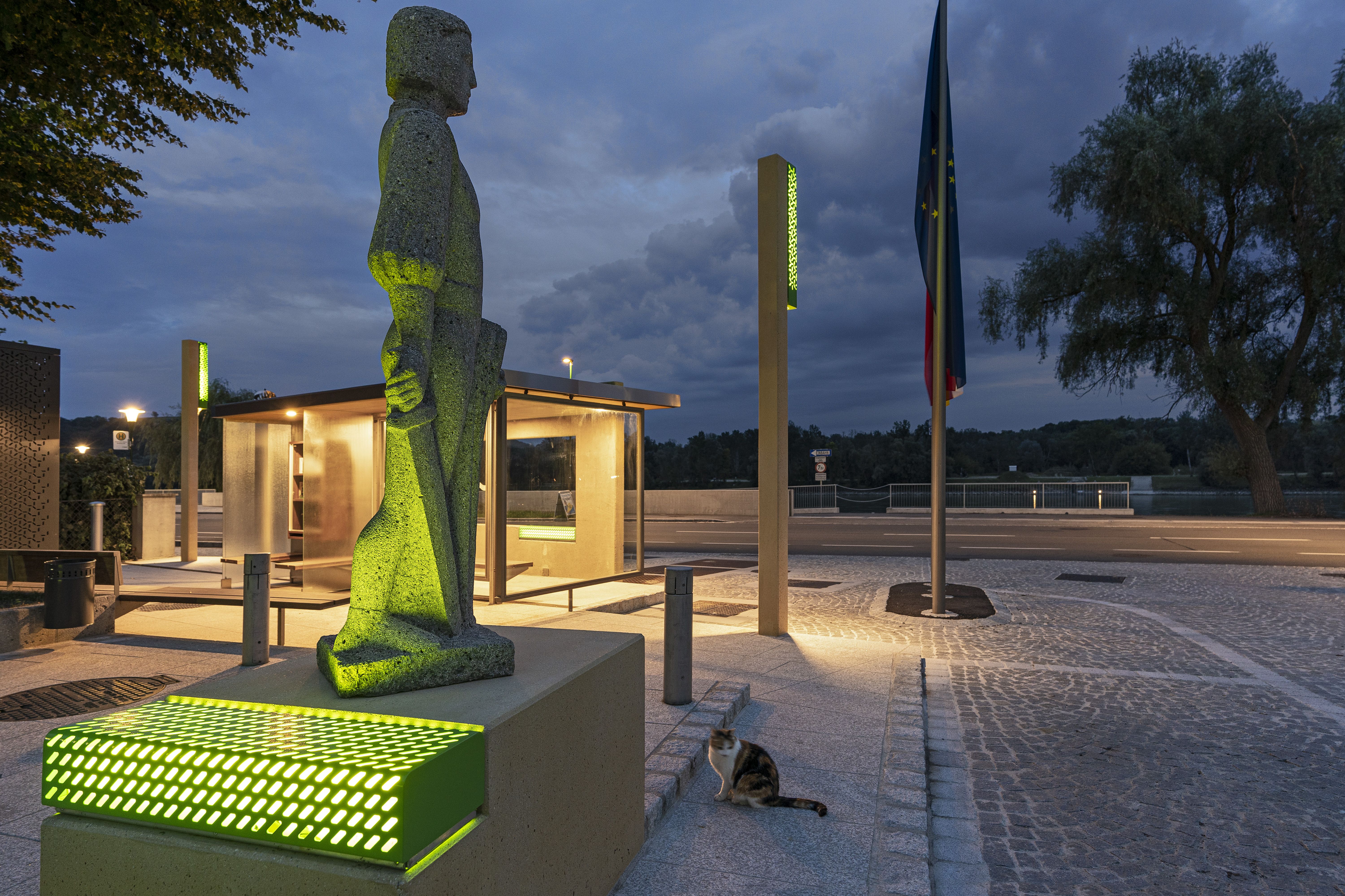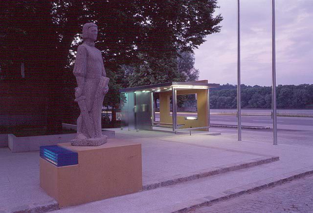 Das komplexe Konzept für die Neugestaltung des Georg-Prunner-Platzes an der Donauuferstraße umfasst ein Buswartehäuschen mit Informationstafeln und Telefonzellen, mehrer Lichtobjekte sowie drei Klangobjekte mit von Roman Holzmayr gestalteten Klangszenarien wie "Sturmwetter" oder "Nachtfluss".---