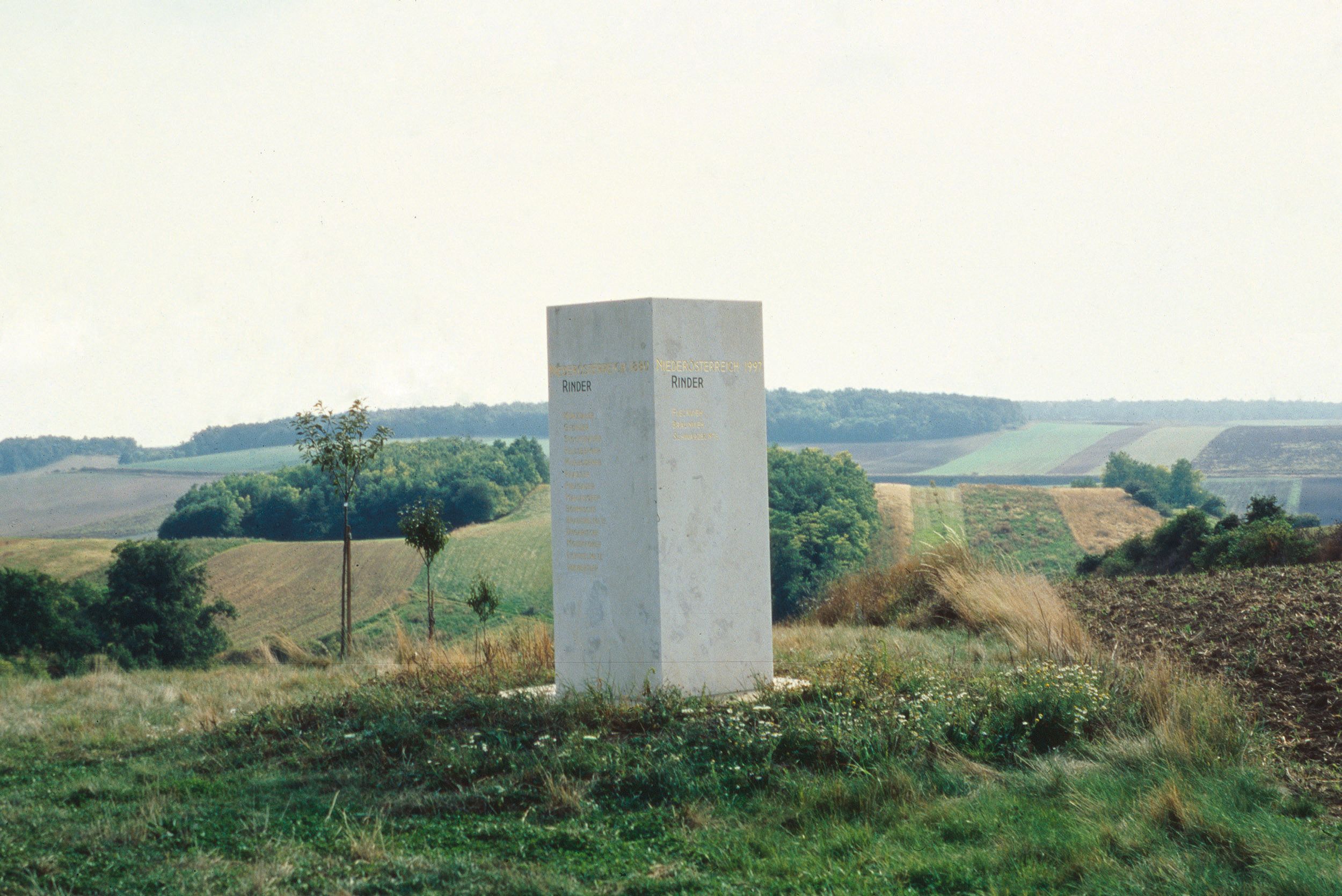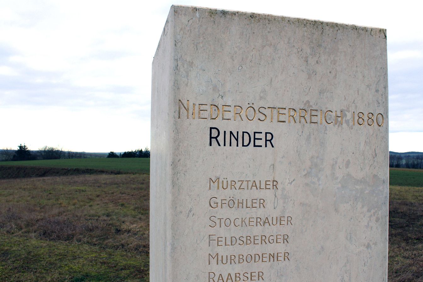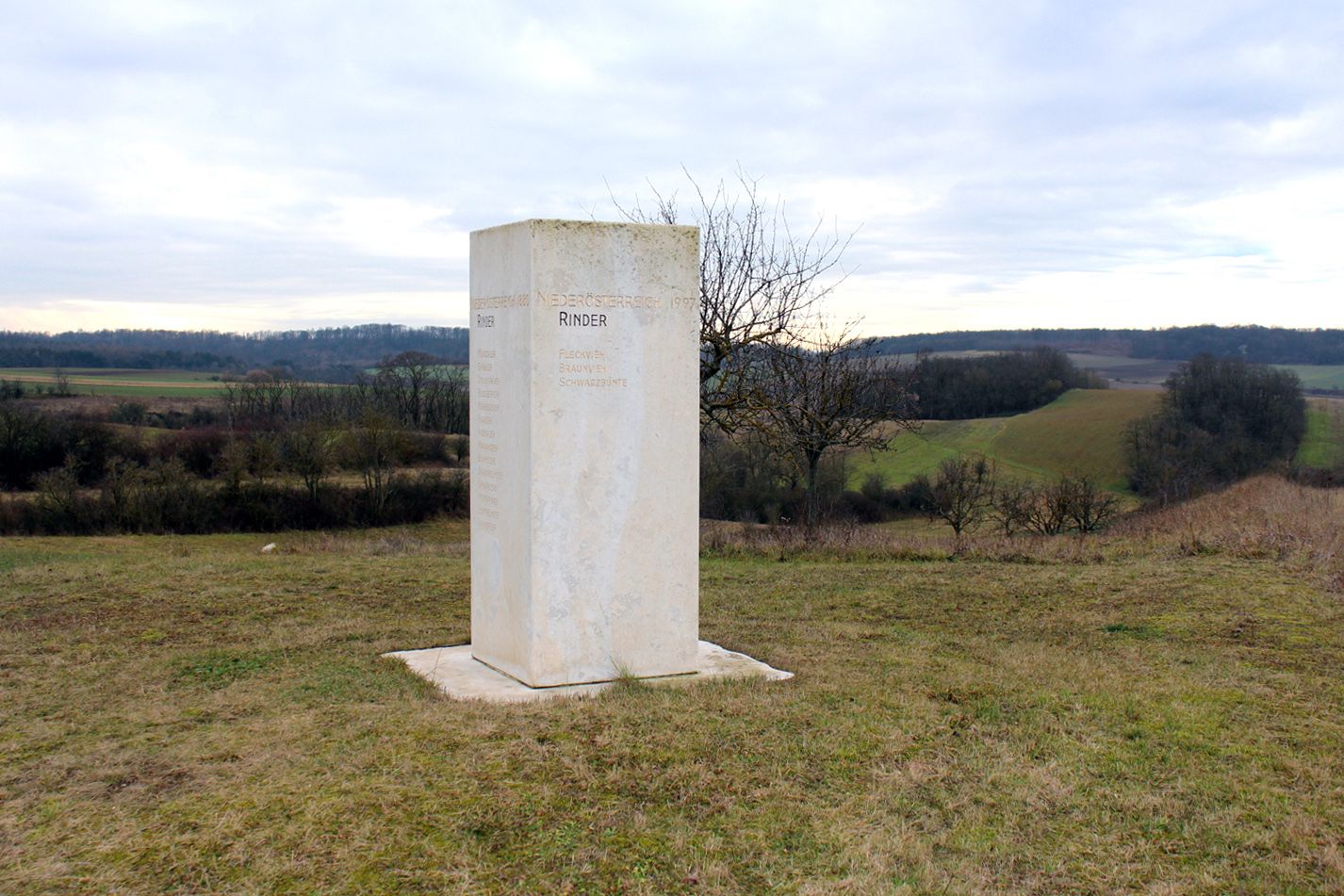 Das zwei Meter hohe Monument thematisiert den Verlust von Vielfalt und lokaler Eigenständigkeit am Beispiel der Rinderhaltung. Der schlichte, glatt polierte Kubus wurde aus Donaukalkstein errichtet. Eine in den Stein gemeißelte Schrift nennt die zu verschiedenen Zeiten gehaltenen Rinderarten.