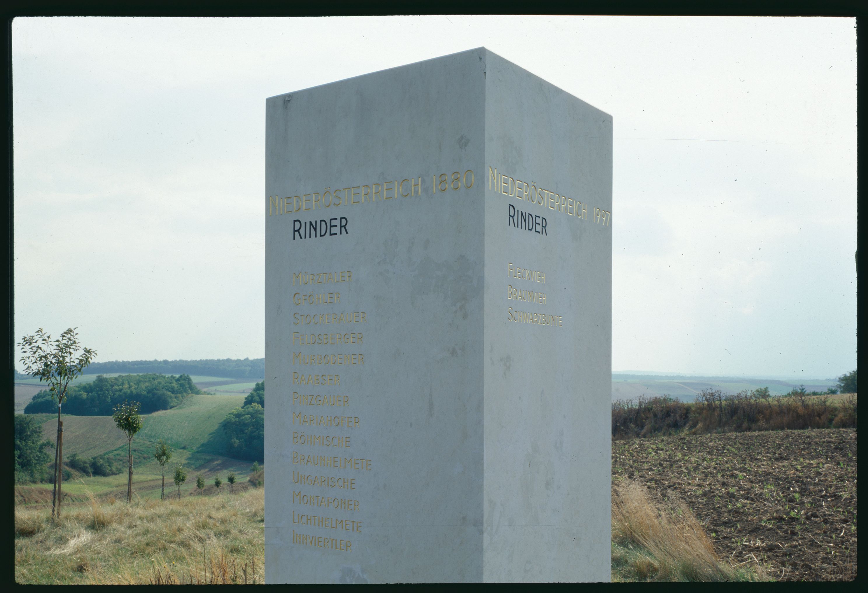Als drittes der Projektreihe "Kulturlandschaft Paasdorf" entstand das durch den hellen Stein weithin sichtbare "Mahnmal für verlorengegangene Artenvielfalt", das den Verlust von Vielfalt und lokaler Eigenständigkeit am Beispiel der Rinderhaltung thematisiert. Das zwei Meter hohe Monument wurde aus Donaukalkstein aus dem Steinbruch Ernstbrunn errichtet und ist ein schlichter Kubus/Obelisk, glatt poliert, in einen an den Rändern unbearbeiteten, natürlich gebrochenen Sockel gesetzt und mit einem in den Boden versenkten Betonfundament gefestigt. Der Text ist in Antiquaschrift in den Stein gemeißelt und mit Gold ausgelegt und lautet: Rinder 1880: Mürztaler, Gföhler, Stockerauer, Feldsberger, Murbodener, Raabser, Pinzgauer, Mariahofer, Böhmische, Braunhelmete, Ungarische, Montafoner, Lichthelmete, Innviertler. Rinder 1996: Fleckvieh, Braunvieh, Schwarzbunte.