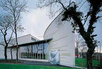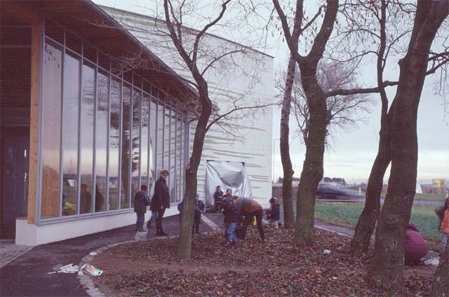 Als meine Zusammenarbeit mit dem Architekturbüro Mrazek begann, war das Bauprojekt Volksschule Seyring in seiner Planung zwar abgeschlossen, ließ aber genügend Spielraum für Interventionen offen. Zur Diskussion standen in erster Linie die beiden Eingangsbereiche des Gebäudes, die durch eine acht Meter hohe Mauer getrennt sind. Die sanfte Krümmung der Mauer ist für den gesamten vorderen Teil des Gebäudes schwung- und formgebend und setzt sich auch im Innenteil in Form einer mehrmals durchbrochenen Scheibe fort. Das Grundkonzept war, die Scheibe im Übergangsbereich Innen-Außen zu durchbrechen und mit einem weichen Mauerteil zu füllen. Ich wollte in erster Linie die Autorität der Mauer verunsichern und verwandeln und entschied den vorerst unlogischen Schritt, die Mächtigkeit der Mauerscheibe zu vergrößern und diese noch um einige Meter nach außen hin zu verlängern. Mit leicht aus der Horizontalen gedrehten schwungvollen Linien und Streifen wird die vertikale Mächtigkeit der Scheibe in Bewegung gesetzt. Die grünen Linien und Streifen sind in Sgraffito-Technik ausgeführt. Der weiche Punkt in der Architektur des Gebäudes ist so etwas wie das sensible Zentrum. Es reagiert auf jede Berührung; drückt man von der einen Seite, kann man diese Bewegung von der anderen Seite sehen. Trotz der relativ großen Stabilität des Materials bleibt die Blase ein empfindlicher Punkt. Verletzlich letztendlich, weil das Ding in der Mauer versucht, auf möglichst vielen Ebenen kommunikationsfähig zu bleiben.