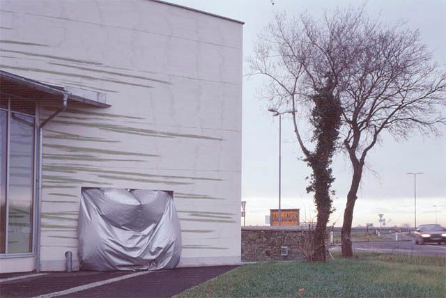 Martin Walde deutet mit leicht aus der Horizontalen gedrehten, schwungvollen grünen Linien auf der Mauer einer Vergrößerung der Scheibe an und setzt ihre prägnante Vertikalität in Bewegung. Mit einer Blase aus Plastik in einem Mauerdurchbruch verleiht er der Architektur einen weichen Punkt.