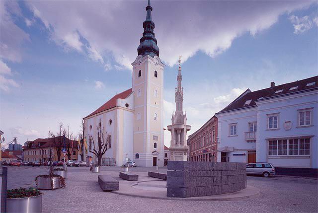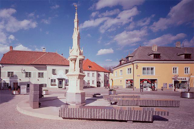 Dem Architekten gelang es, bei der Platzgestaltung in Gföhl eine komplexe Aufgabenstellung zu meistern: Verkehrs- und Fußgängerbereiche, Brunnen, Bushaltestelle, Veranstaltungs- und Marktflächen wurden zusammengefasst und trotzdem ihrer unterschiedlichen funktionalen Widmung entsprechend, gestaltet.
