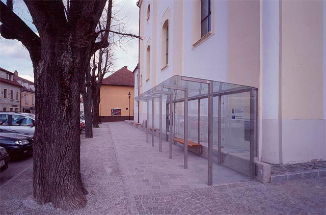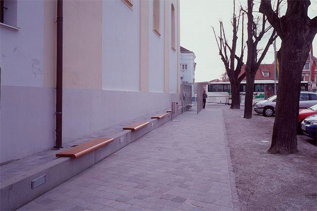 Die Anforderungen an die sich zur Fläche weitenden Straßenschluchten, an den Platz, den Hauptplatz, sind komplex: verdichtete Verkehrsströme, verkehrsberuhigte Fußgängerbereiche, Veranstaltungs- und Marktflächen – klar definierte Bereiche der Alltagsnutzung einerseits und freie Spielflächen für Sondernutzungen andererseits. Das Grundkonzept der Gestaltung ist die leere Fläche, ein idealisiertes Rechteck, eingeschrieben in die organische Aufweitung der Häuserzeilen und dargestellt als Granitkopfsteinpflasterfläche auf dem Asphalt. Der Layer des Autoverkehrs ist definiert durch geschnittenen und sandgestrahlten Stein, der die Abrollgeräusche mindert, nur minimal gerahmt durch schräg gestellte oder flächenbündige Randleisten. Der Brunnen, ein profanes Gegenstück zur Kirche und wie diese ein Solitär, einst zentraler kommunaler Wasserspender, Löschteich und Viehtränke, wird durch die Restaurierung zum offenen Platz und damit zu einer geschützten, begehbaren Fläche im Verkehrsbereich. Die hohe, kleeblattförmige gemauerte Schale um die historisierende Säule wird ersetzt durch ein gekrümmtes Wandsegment und gestreute liegende monolithische Granitblöcke: Granithalbrohlinge, mit Distanzfugen verlegt, gebohrt, geschnitten und poliert. Reinste gestalterische Zurückhaltung schließlich in der Bushaltestelle seitlich vor der Kirche: ein Pavillon aus Nirostastahl und Glas.