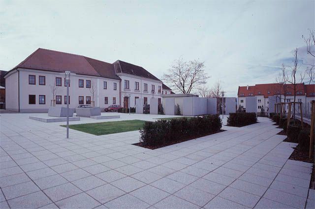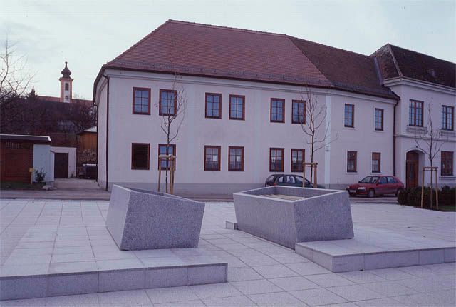 Willi Kopf hat in Brunnkirchen bei Krems den Dorfplatz mit zwei Brunnenbecken gestaltet. Die Oberfläche der reduzierten Platzgestaltung aus Granit nimmt die Glätte der Wasseroberflächen auf und führt sie weiter.