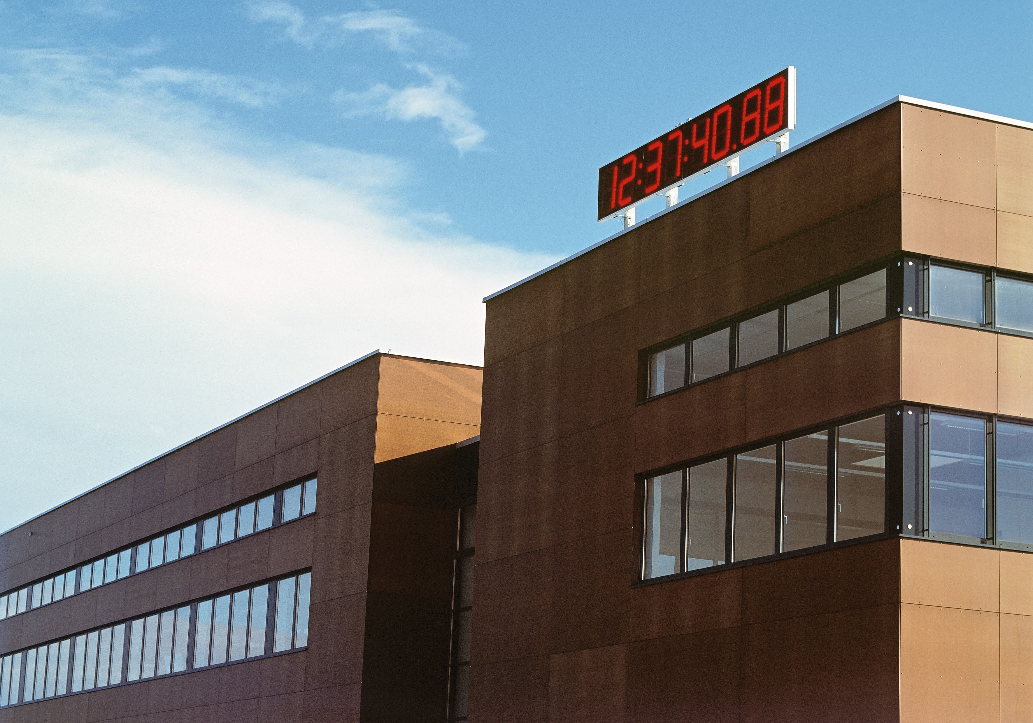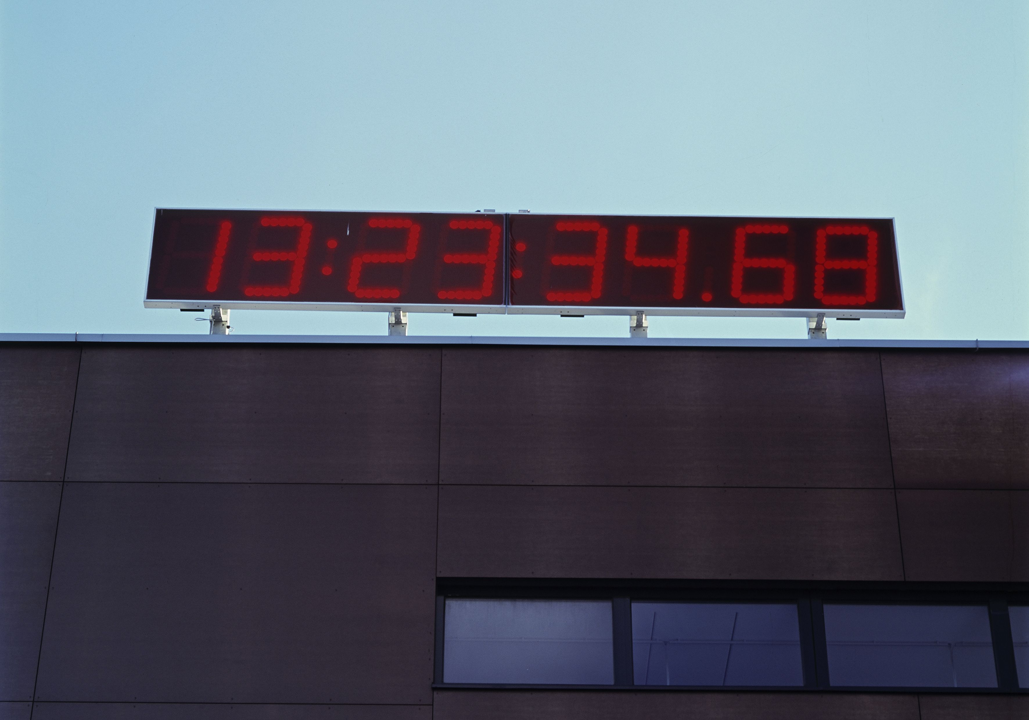 Die sechs Meter lange und ein Meter hohe Uhr mit achtstelliger digitaler Anzeige auf dem Dach der Landesberufsschule gibt die Zeit bis zu Hundertstelsekunden an. Damit spielt der Künstler auf die Möglichkeit der Darstellung von immer kleineren Maßeineinheiten und der gegenläufigen Fähigkeit des Menschen diese unmittelbar wahrzunehmen an.