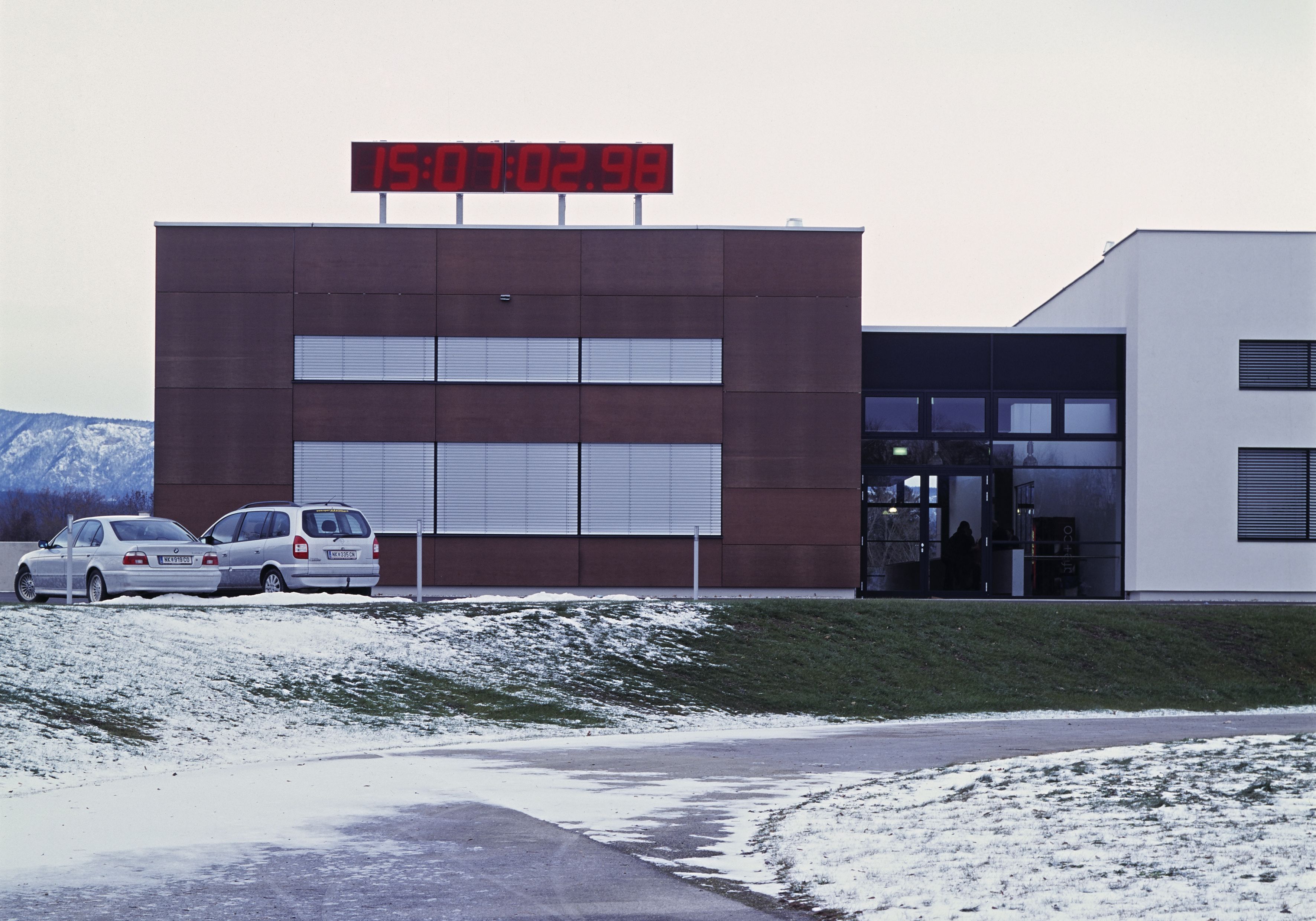 Auf dem Dach des Neubaus der Landesberufsschule Neunkirchen wurden zwei idente sechs Meter lange und einen Meter hohe Schuluhren mit digitaler, achtstelliger Anzeige installiert. Die Uhr sprengt die Erwartungen, die man gemeinhin an eine solche stellt, und misst die Zeit auf höchst genaue Weise: Auch die Zehntelsekunden und Hundertstelsekunden werden dargestellt. So pragmatisch, funktional und beiläufig der Zeitmesser mit seinen digital angezeigten Zahlen und dem Aluminiumgehäuse daherzukommen scheint, so unerbittlich gnadenlos ist seine Aussage: Hier rennt einem bildlich die Zeit davon – und das umso mehr, je genauer man diese messen und sehen kann. Lakonisch gibt der Künstler eine naturwissenschaftliche Erklärung der Symbolik der rasenden LED-Anzeigen. Die Darstellungen von Maßeinheiten, die in gewissen unterrichteten Fächern in der Schule notwendig sind, seien nicht mehr an die „unmittelbare“ Dimension der menschlichen Wahrnehmung gebunden. Dies wiederum wirke sich – besonders signifikant sichtbar in Schulen – auf die Konditionierung der Wahrnehmung selbst aus. Olaf Nicolai ist bekannt dafür, Fragen der Naturwissenschaft mit zivilisatorischen zu verbinden. Hier umreißt er die gesamte Paradoxie, der die heutige Beschleunigungsgesellschaft unterliegt, beherrscht von der Zeit, die von ihr selber so schnell gemacht wurde, und unfähig, diese wahrzunehmen.