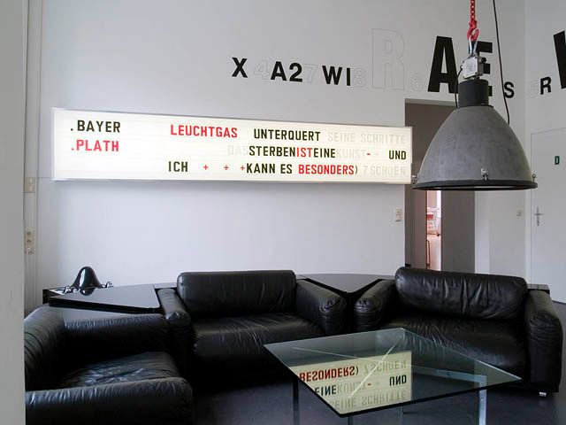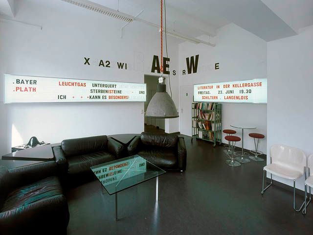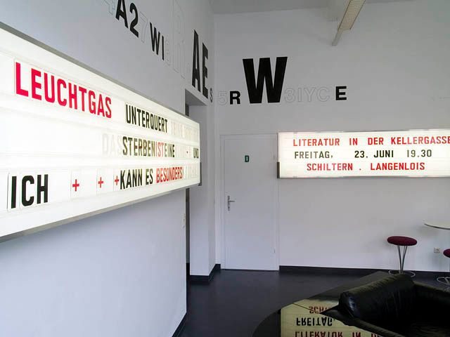 "Das Sprechen ist eine Form." Für Franz Graf manifestiert sich die Sprache unter anderem auch in Möbeln, die er gezielt für die Lounge zusammengestellt hat. Diese stammen allesamt von Altwarenhändlern und sind Sammlerstücke. Als feste Form sind sie wiederum gleichzeitig Ausgangspunkt für Geschichten und Erzählungen, die an keinen fixen Ort gebunden sind. Auf die Bauweise der Sprache, die sich aus Buchstaben und Wörtern zusammensetzt und somit ein unendliches Potential an Kombinationen beinhaltet, nimmt das Ankündigungs-Billboard an der Wand Bezug. In Anlehnung an die Leuchtboards an der Außenseite von Kinos in den 30er Jahren können die Ankündigungen der Veranstaltungen aus einzelnen Buchstaben immer wieder von Neuem zusammensetzt werden.