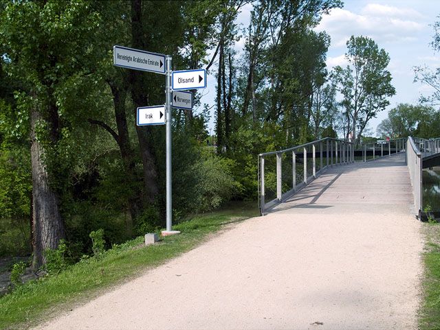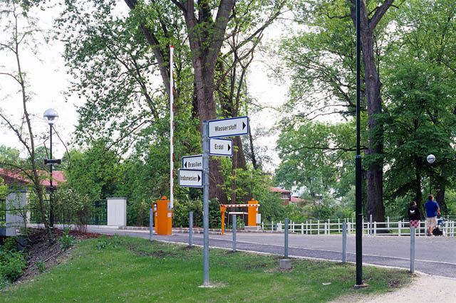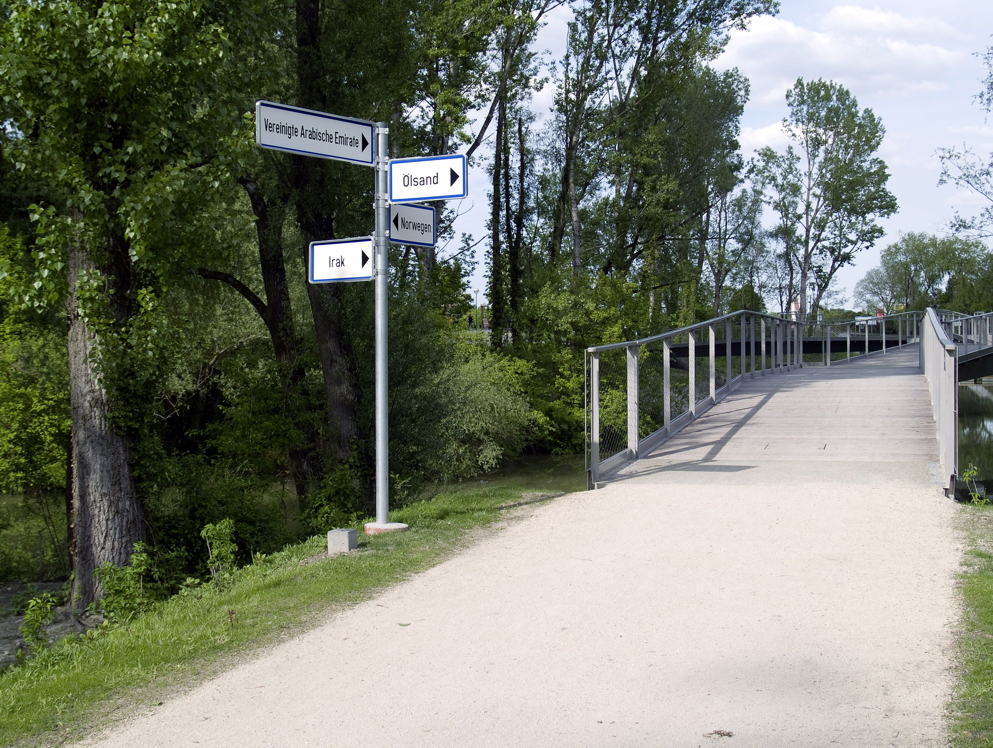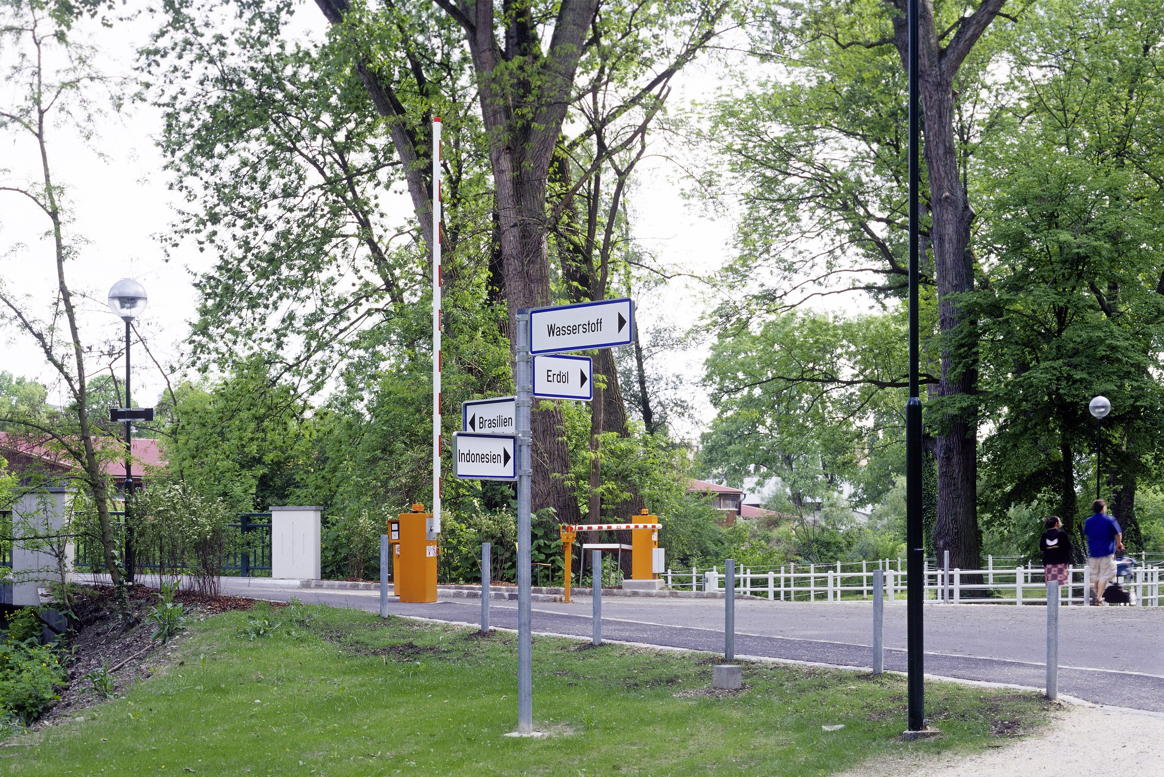 Die Skulpturen, die der britische Künstler Nils Norman für die Gartenschau Tulln entwickelt hat, tarnen sich als Leitsystem, als harmlose Verkehrstafeln, die an Wegkreuzungen in verschiedene Richtungen weisen. Rein optisch unterscheiden sie sich kaum von behördlichen Schildern in der Umgebung. Interessant wird es, wenn man die Aufschriften zu lesen beginnt: Ein Pfeil zeigt in Richtung Atomkraft, der andere in Richtung Iran, hier geht’s zur Wasserkraft, dort nach Brasilien, und hinter den Arabischen Emiraten liegt die Erdwärme.