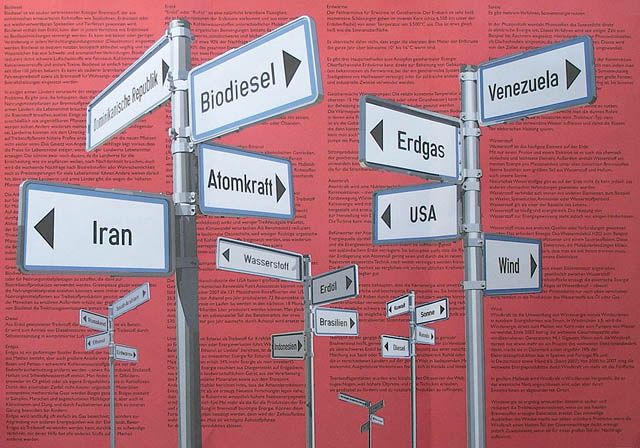 "From Gasoline to Sugar Beet" heißt die Installation des britischen Künstlers, mit der er auf die weltweite Krise in Bezug auf Energiegewinnung verweist. Etliche Wegweiser mit Aufschriften wie "Atomkraft", "Iran", "Wasserstoff", "Brasilien", "Arabischen Emiraten" oder "Erdwärme" wurden an verschiedenen Wegkreuzungen installiert.