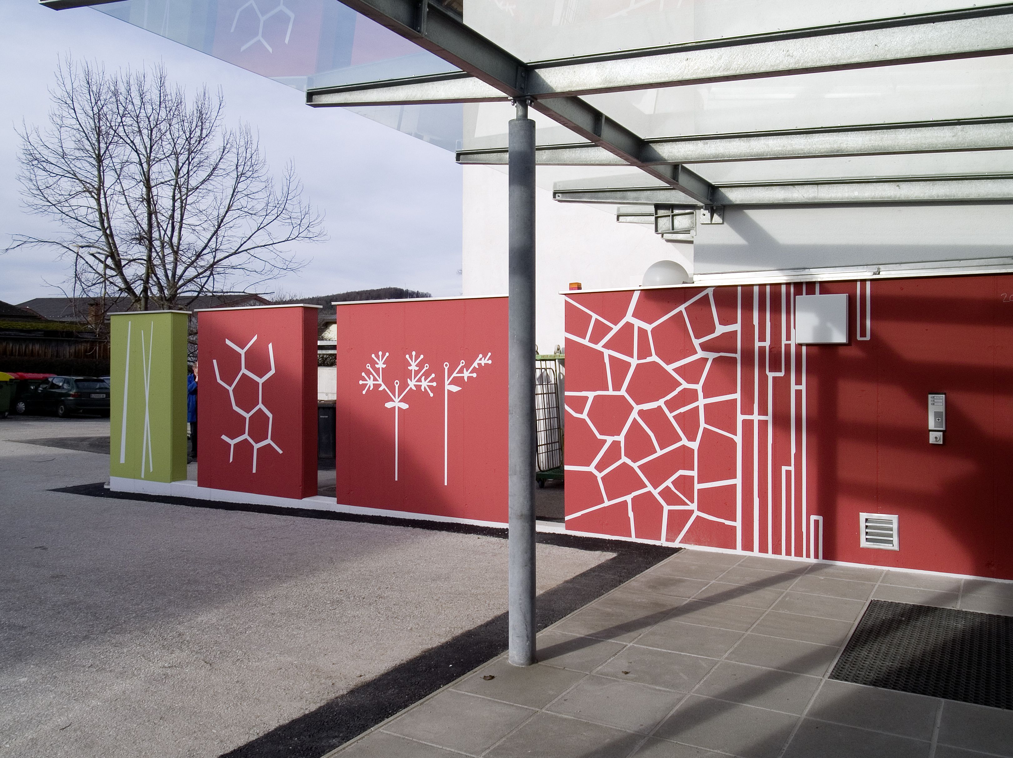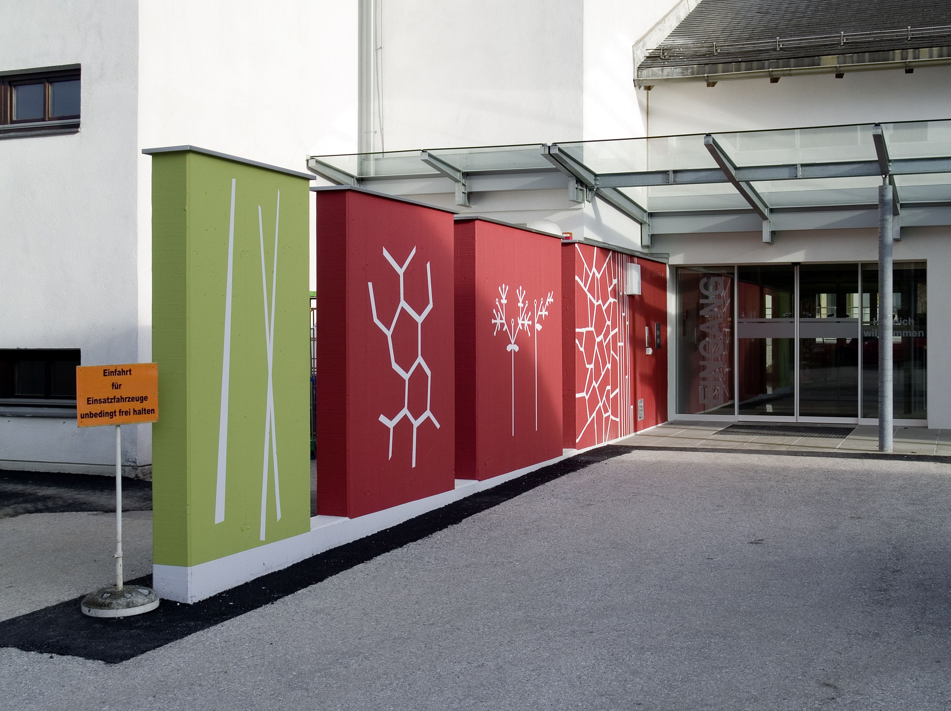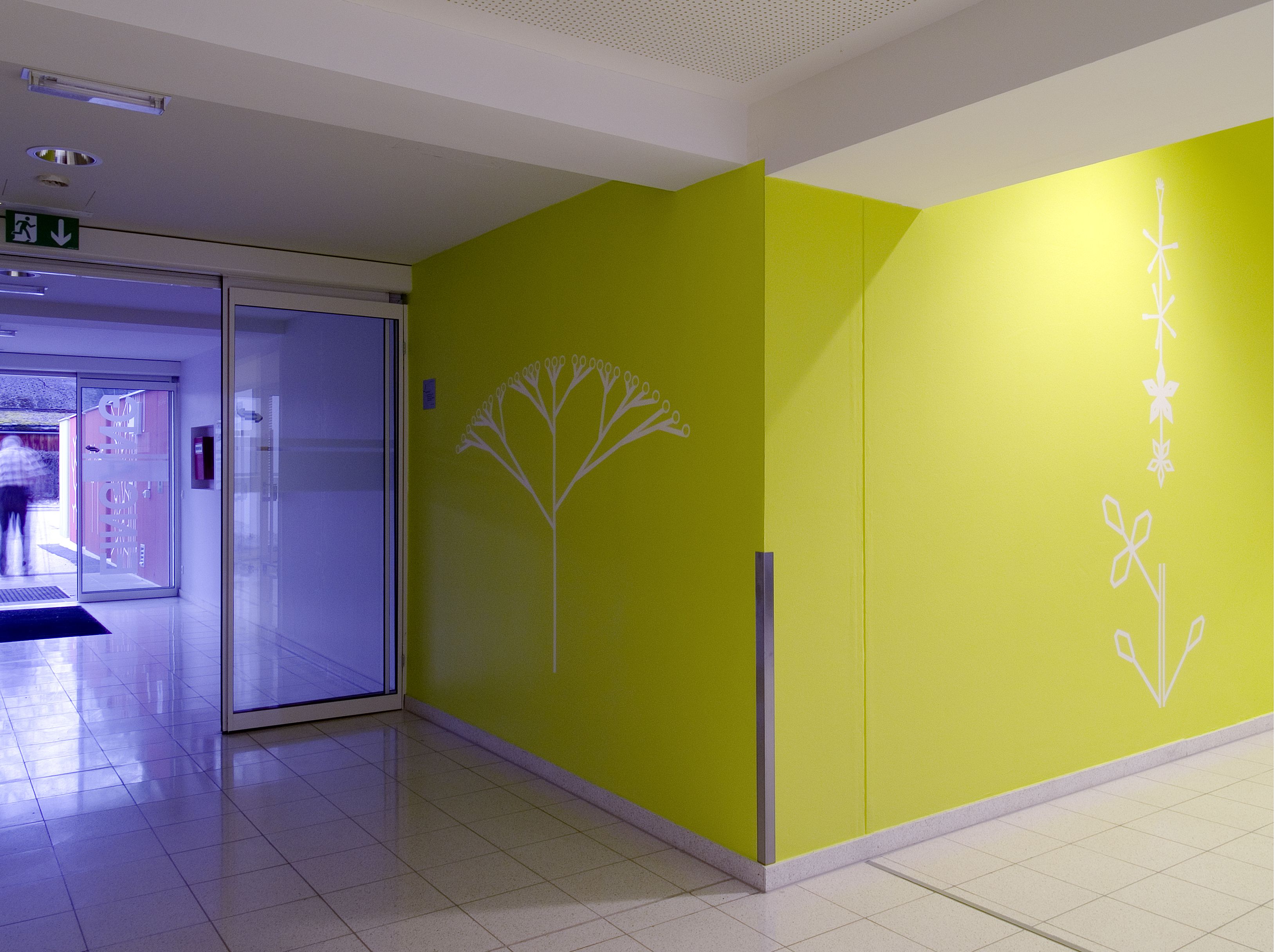 In dieser raumbezogenen Arbeit werden die objektiven Bilder der Naturwissenschaft dem subjektiven Erinnern und Wahrnehmen gegenübergestellt. Morphologische Zeichnungen und Zeichen der Botanik in reduziert oder verdichtet angeordneten weißen Linien führen vom Botanischen Zaun im Eingangsbereich in den Innenraum des neu gestalteten Landespensionisten- und Pflegeheims Hainfeld. Die gelb-grüne Wandarbeit in der Halle leitet den Blick weiter in den realen Garten im Innenhof der Anlage. Der Botanische Zaun trennt also den Außenraum vom Inneren, gibt aber auch die Blicke frei auf das, was dahinter liegt. Wie könnten diese vereinfachten Zeichen einer Pflanzendarstellung nun die Zeitlichkeit eines Blütenstandes oder die Form der Scheindolde bezeichnen, ohne der Wahrnehmung, dem Konstruierenden und Erinnernden des menschlichen Geistes ebenso verpflichtet zu sein wie der naturwissenschaftlichen Erkenntnis und der Ontologie?