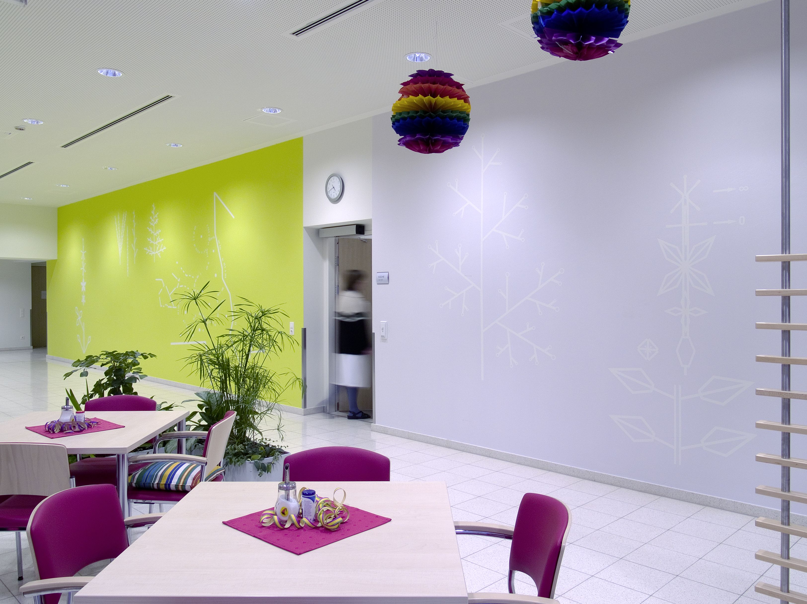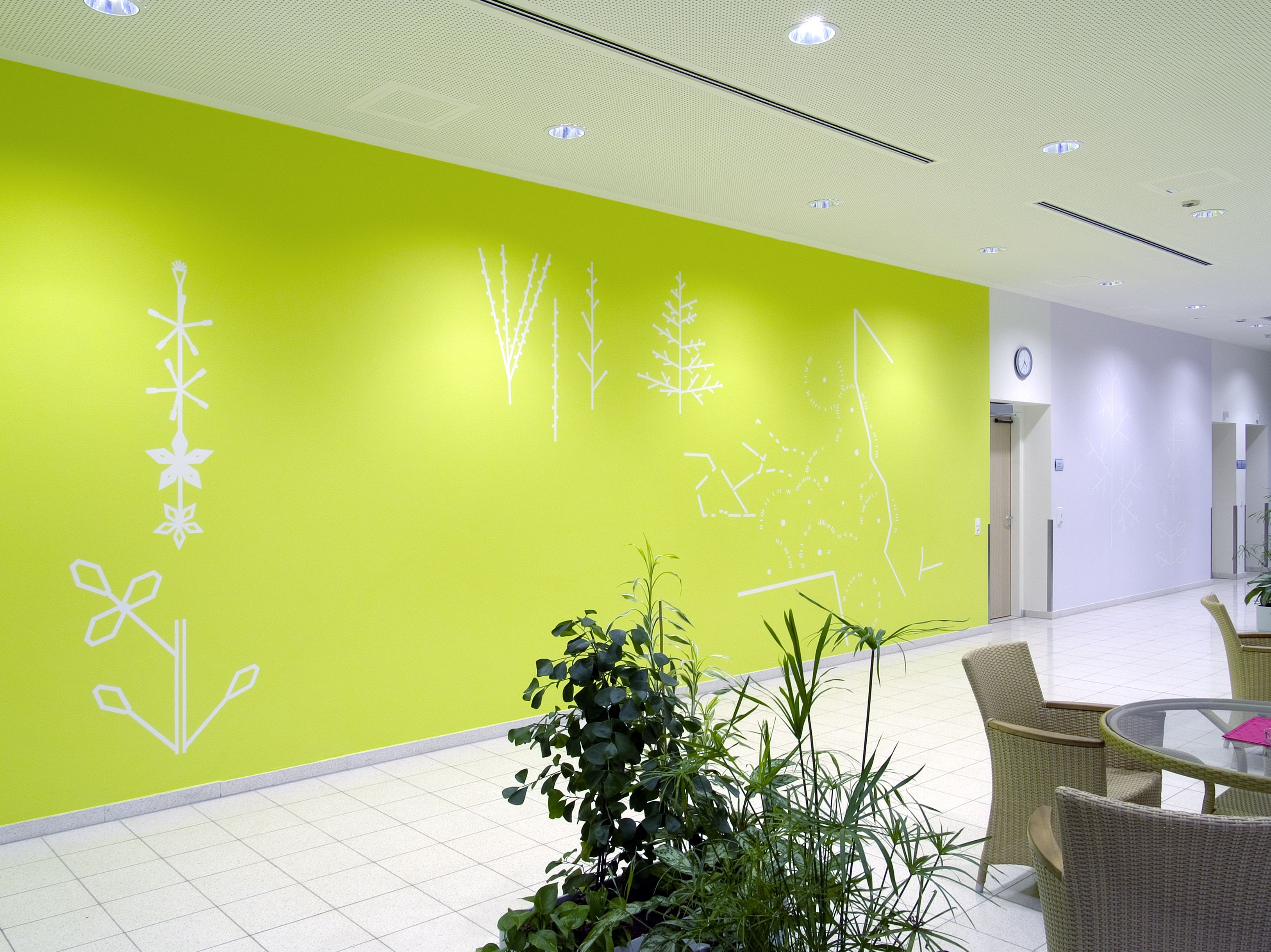 Morphologische Zeichnungen und Zeichen der Botanik in reduziert oder verdichtet angeordneten weißen Linien führen vom Botanischen Zaun im Eingangsbereich in den Innenraum des neu gestalteten Landespensionisten- und Pflegeheims Hainfeld.