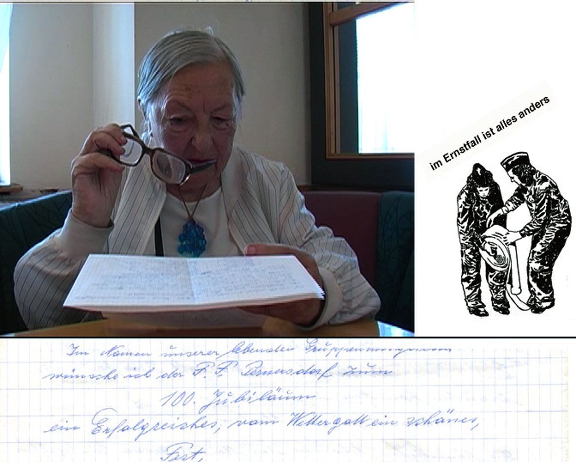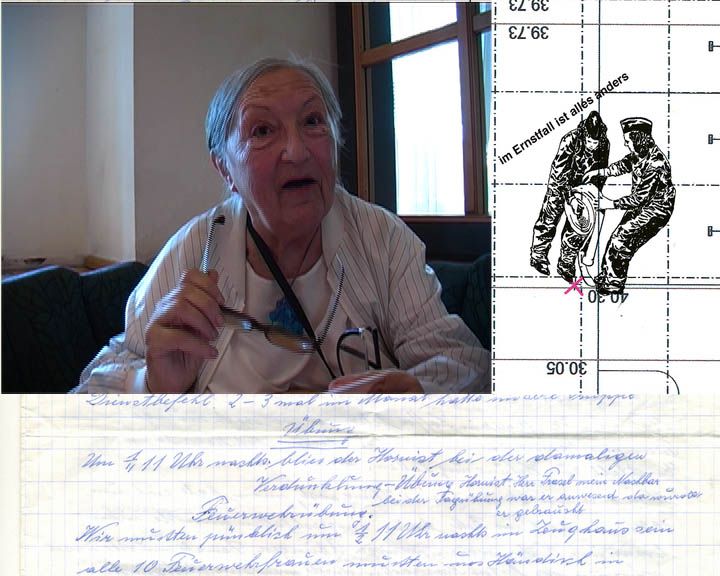 Fiona Rukschcio hat sich in ihrer Arbeit für die in Tulln neu errichtete Landesfeuerwehrschule einem in der offiziellen Geschichtsschreibung marginalisierten Faktum gewidmet: der Notdienstverpflichtung von Frauen in der Feuerwehr vor allem während des Zweiten Weltkriegs in Österreich. Bei ihren Recherchen stieß sie im Feuerwehrmuseum Tulln auf einen handschriftlichen Text der ehemaligen Feuerwehrhelferin Maria Lehner und machte die Bekanntschaft mit der Zeitzeugin Maria Auli, die ebenfalls während des Zweiten Weltkriegs als Feuerwehrhelferin tätig war. Die persönlichen und vom Vergessen geprägten Erinnerungen von Frau Auli werden in einem Film dem historischen Bericht von Frau Lehner gegenübergestellt, der nicht nur detailliert auf die Aufgaben und Abläufe eingeht, sondern auch einen Einblick in die Stimmung der Frauen zu jener Zeit bietet. Die Künstlerin versucht, mit den eingeschränkten Unterlagen ein mehrschichtiges Bild der Bedeutung dieser Arbeit für die Frauen zu jener Zeit aber auch in ihrem späteren Leben zu skizzieren, und gibt indirekt Aufschluss über den Umgang der Gesellschaft mit einem Aufbrechen klassischer Rollenzuweisungen in Ausnahmefällen. Zusätzlich zu dem Film war eine Bodenarbeit für den Vorplatz der Schule geplant, die allerdings nicht durchgeführt werden konnte – da wir es heute nicht mit in einem Ernstfall, sondern mit dem „Normalfall“ zu tun haben wollte die Feuerwehr nichts von Frauen wissen.