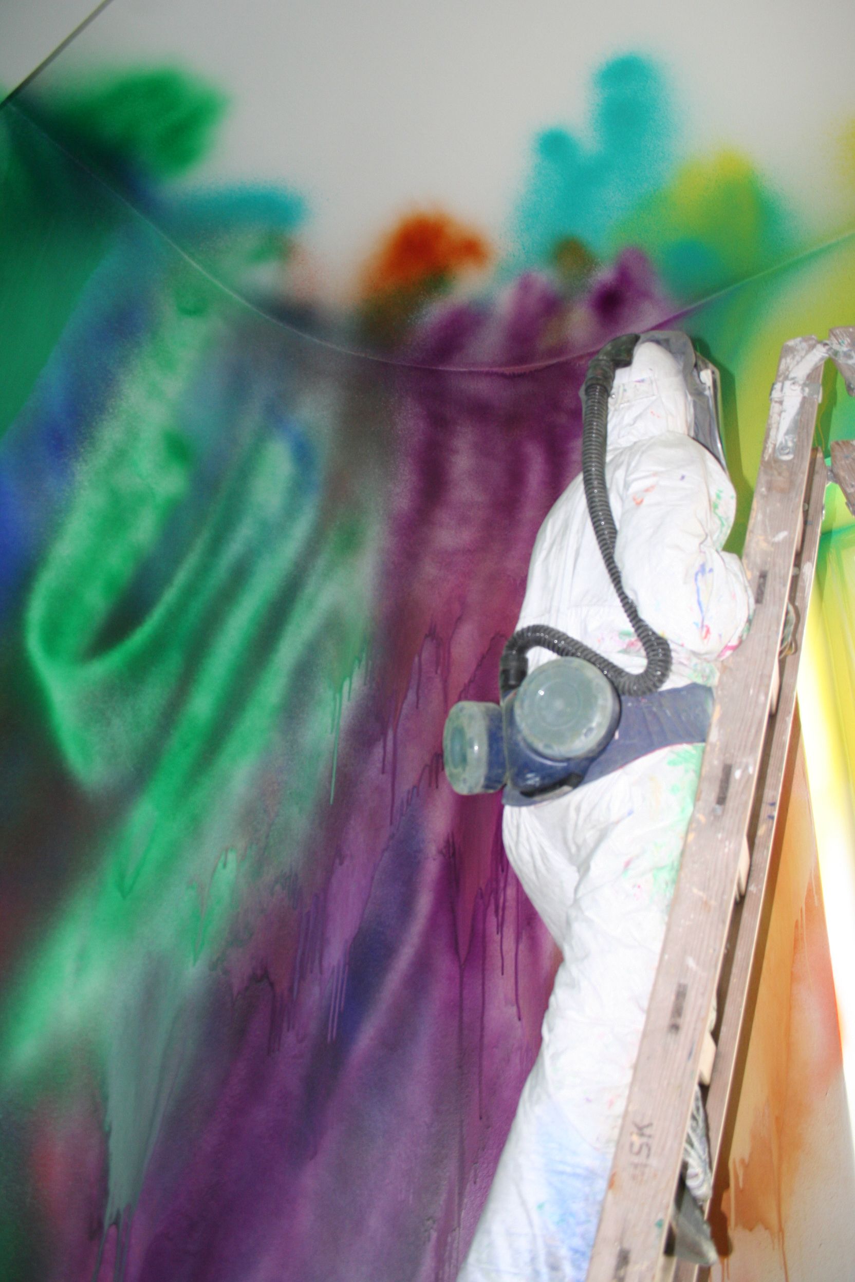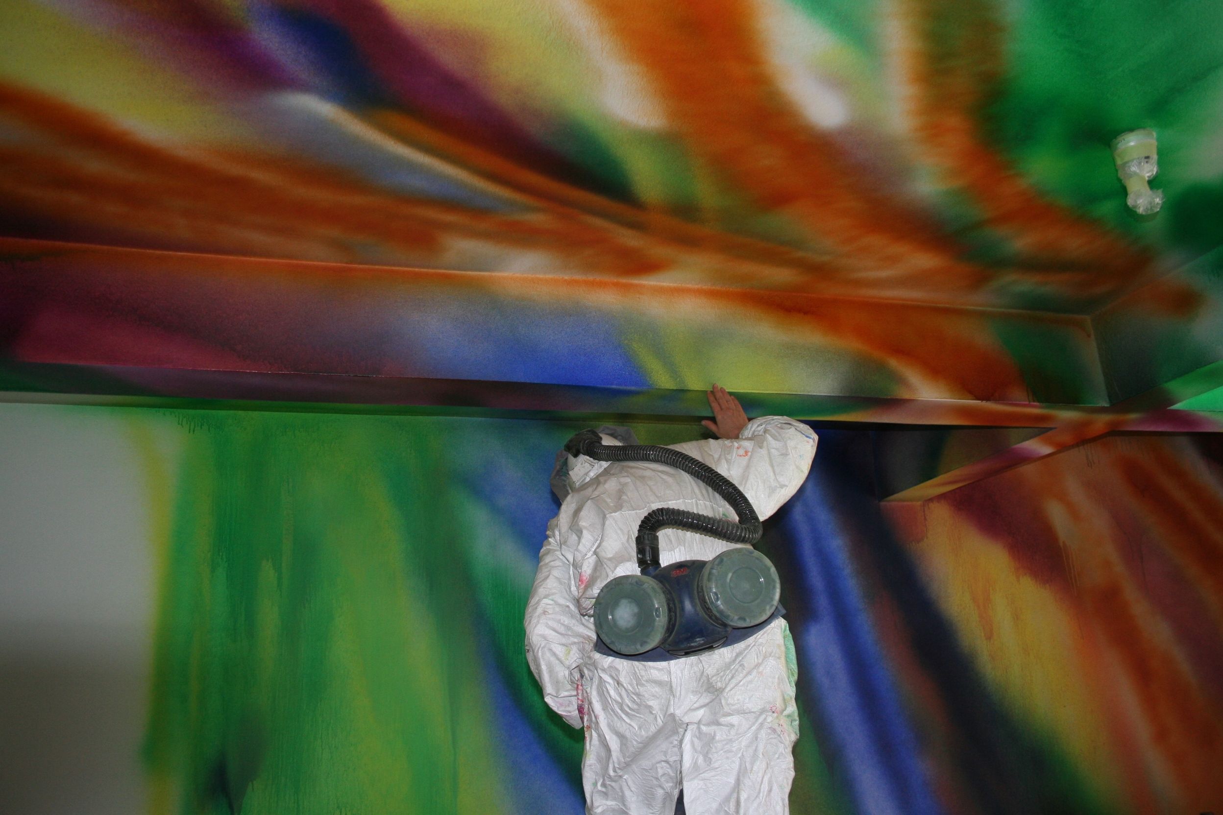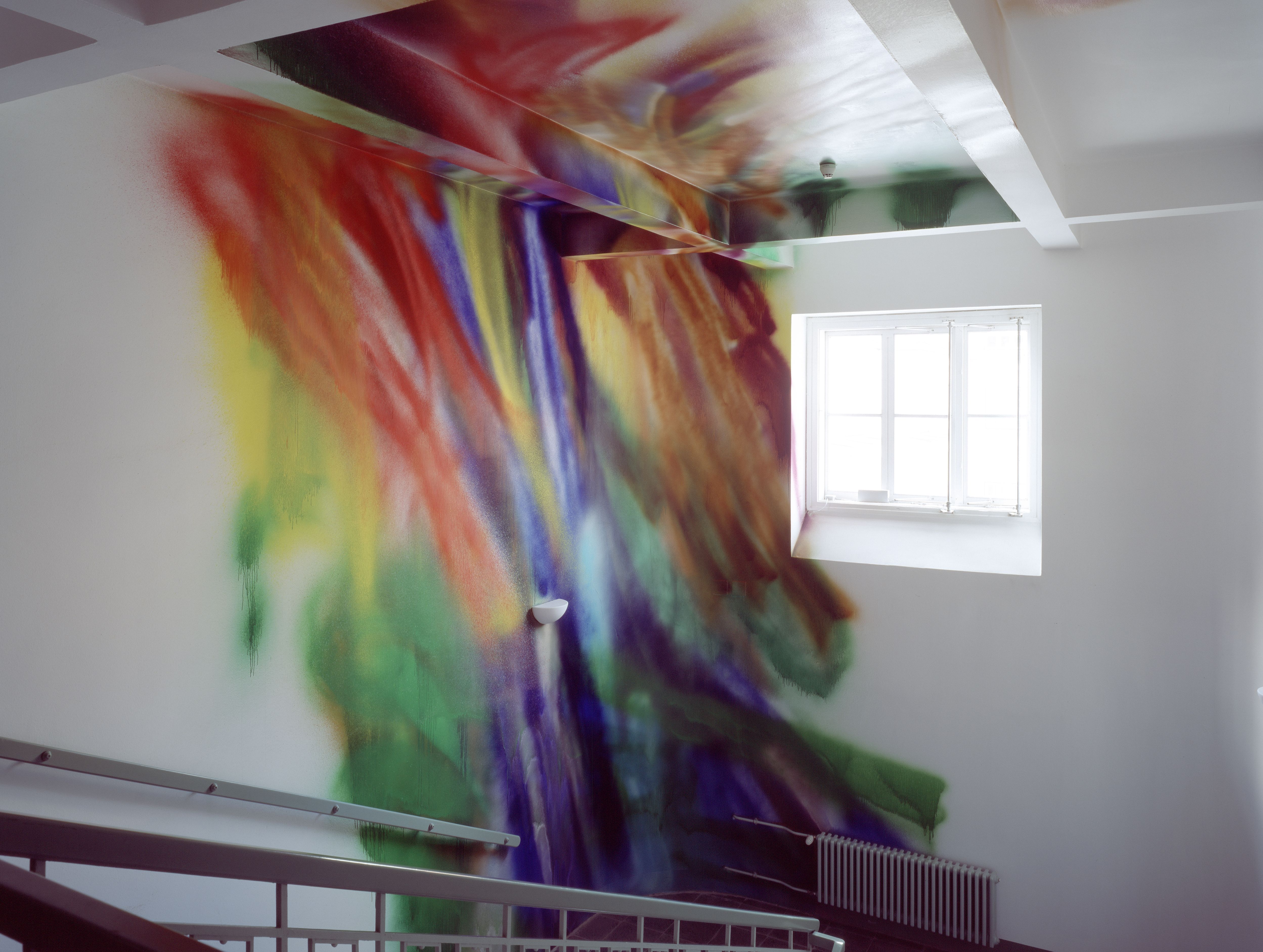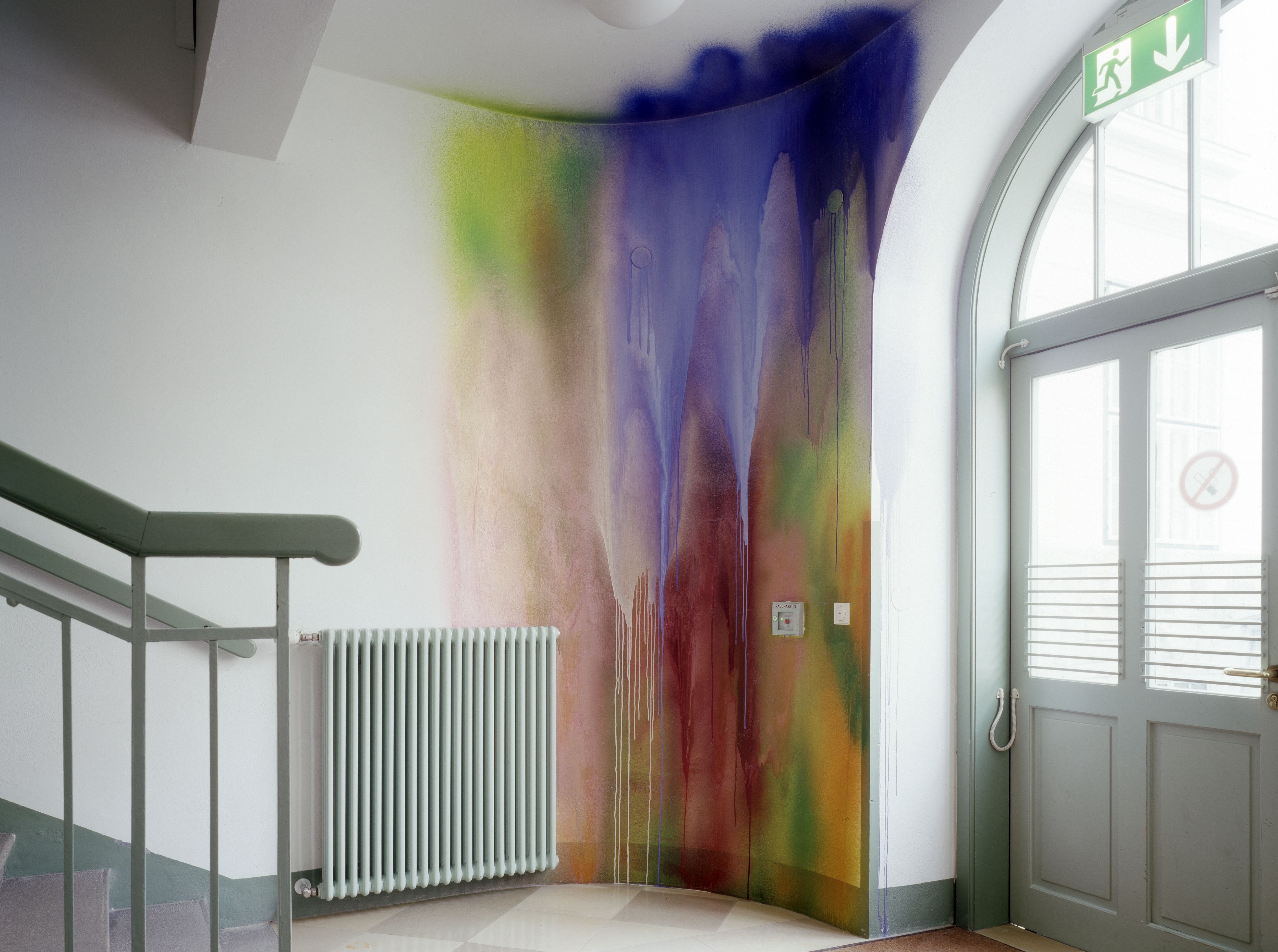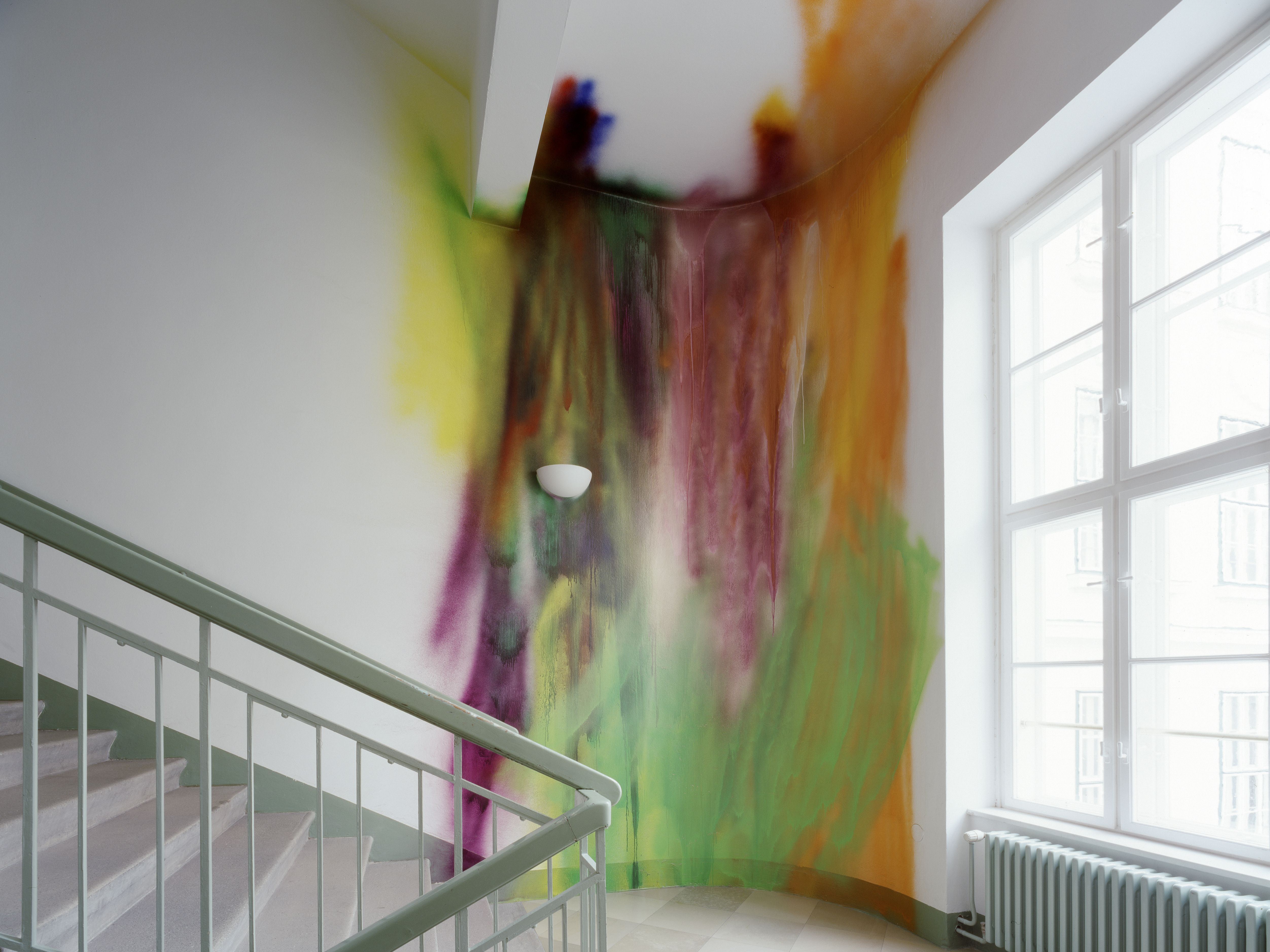 Seit vielen Jahren arbeitet sich die Malerin Katharina Grosse in die Tiefen der Grenzauflösung zwischen Raum und Bild vor. Ihre Farbinstallation im Stiegenhauses des Hauptgebäudes zieht sich vom 3. Obergeschoß bis ins Erdgeschoß. Mit einem abstrakten Spraybild hat sie die Wand zum Bildträger gemacht und physischen und illusionistischen Raum verbunden.