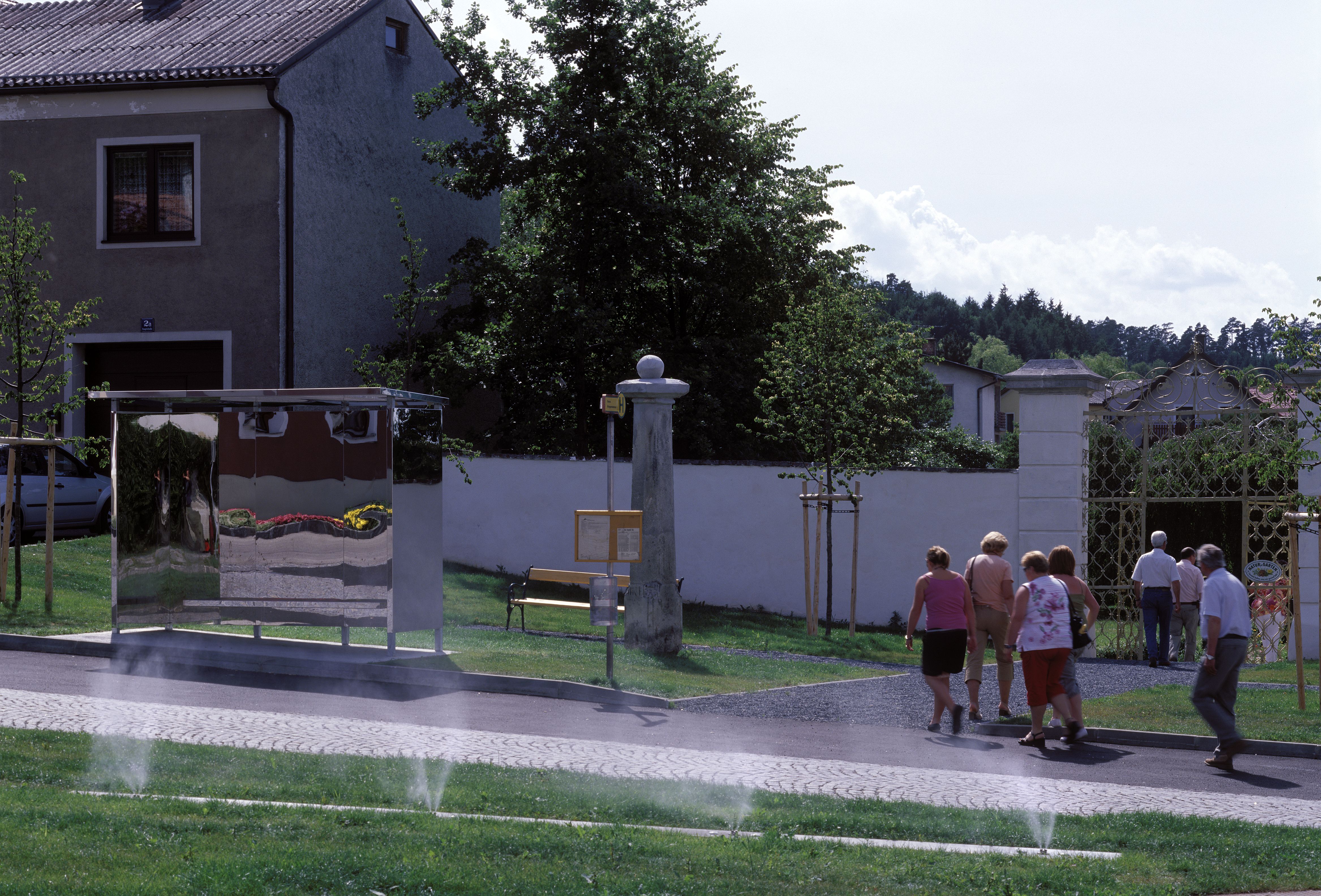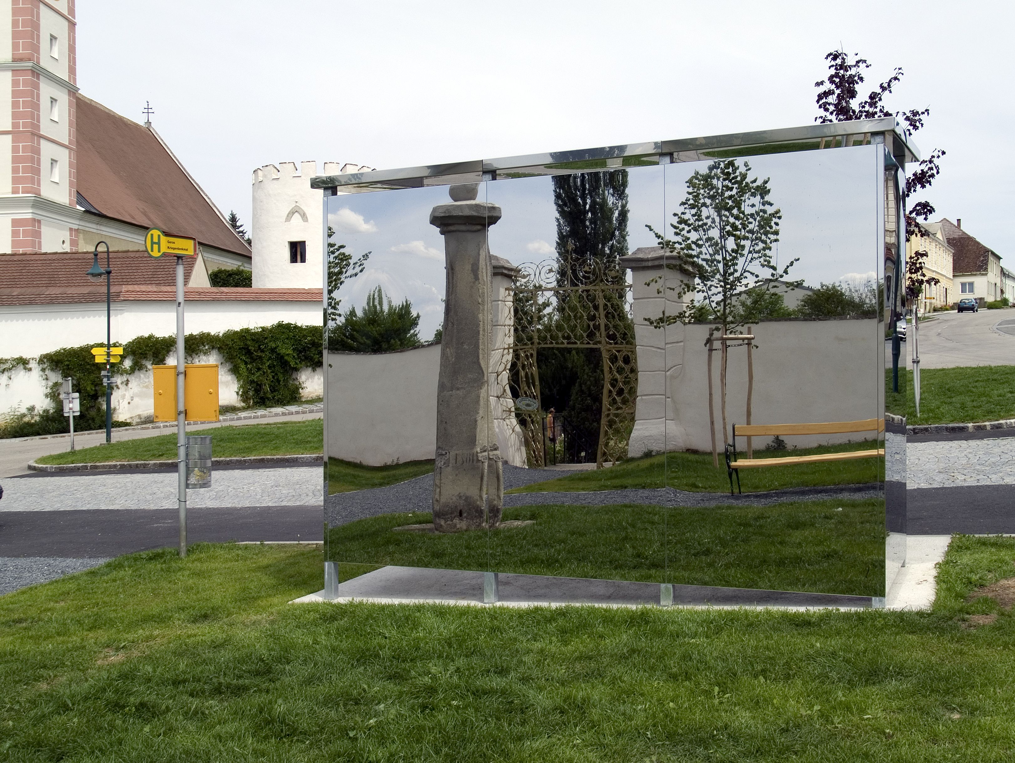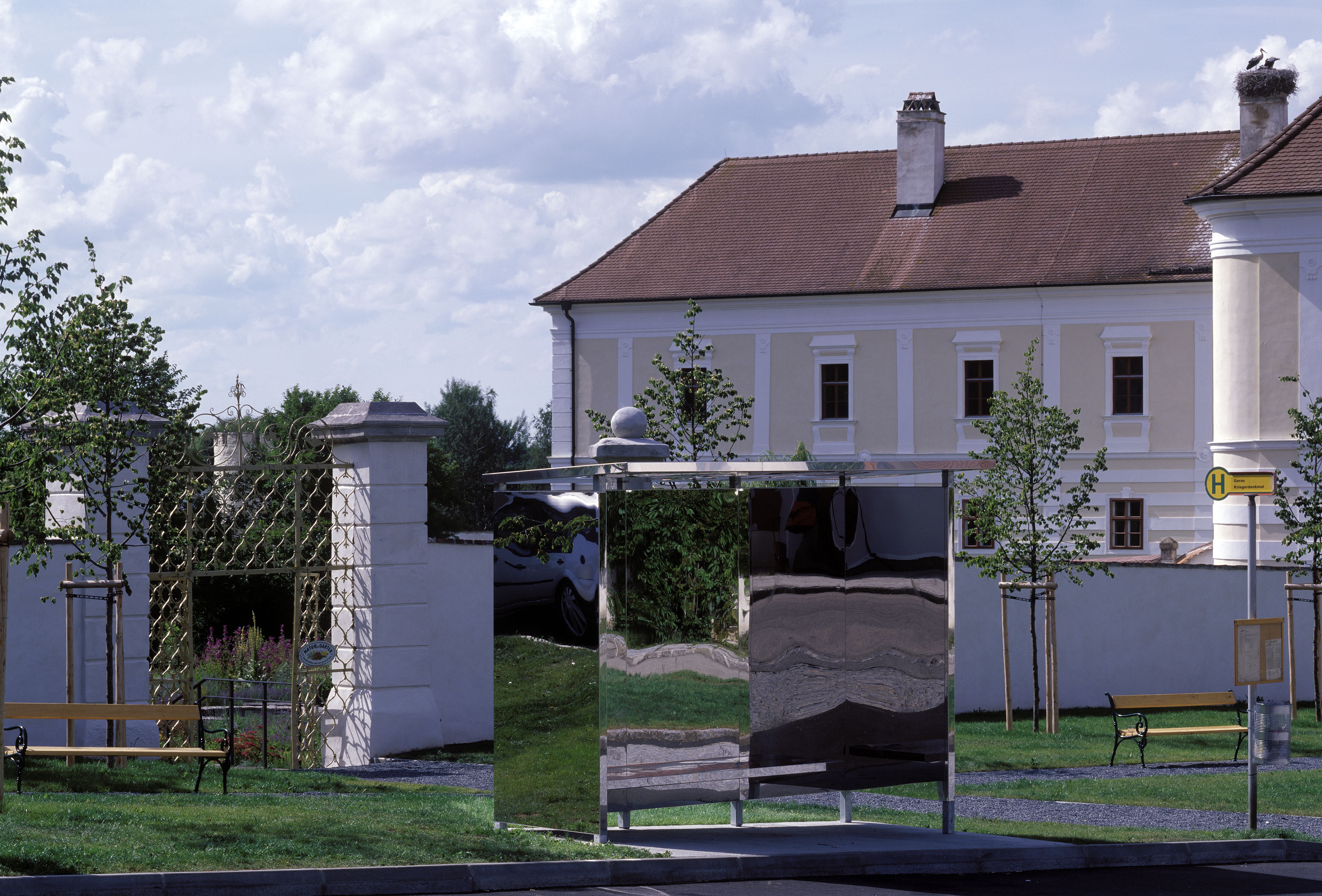 Das Projekt von Lisa Holzer für den kleinen Park vor dem Stift Geras besteht aus drei Teilen, die jeweils auf die bestehende Situation eines "verwünschten" Parks reagieren: ein Wartehaus aus spiegelndem Edelstahl, ein Brunnen in Form zarten Nebels und die Markierung des Tors zum Kräutergarten mit Goldfarbe. Das Hauptanliegen der Künstlerin war es, den Platz zu öffnen bzw. zu animieren und zu Interaktivität zwischen den künstlerischen Eingriffen und den BesucherInnen des Parks einzuladen. Für das Wartehäuschen wurde eine einfache kubische Struktur gewählt, die an drei Seiten mit hochpoliertem Edelstahl verkleidet ist. Lisa Holzer zaubert so ein sich ständig veränderndes Spiel von (Spiegel-)Bildern auf den Platz. Die Architektur tritt zurück und erhält die Funktion einer Bildproduktionsmaschine. Konterkariert wird das harte Material des Stahls durch den künstlichen Nebel, den die Künstlerin für den Brunnen gewählt hat. Das verdunstende Wasser erzeugt einen Schleier, der wiederum den dahinter liegenden Park in unserer Wahrnehmung verändert und immer wieder anders erscheinen lässt. Die Goldfarbe als Blickfang für das Tor zieht die BesucherInnen an, verschränkt es mit dem Gold des barocken Stiftes und führt weiter in den Garten. Wie in Mallarmés Gedicht "Nachmittag eines Fauns" erzeugt der gestaltete Park (Traum-)Bilder, welche die Projektionen der BesucherInnen abbilden.