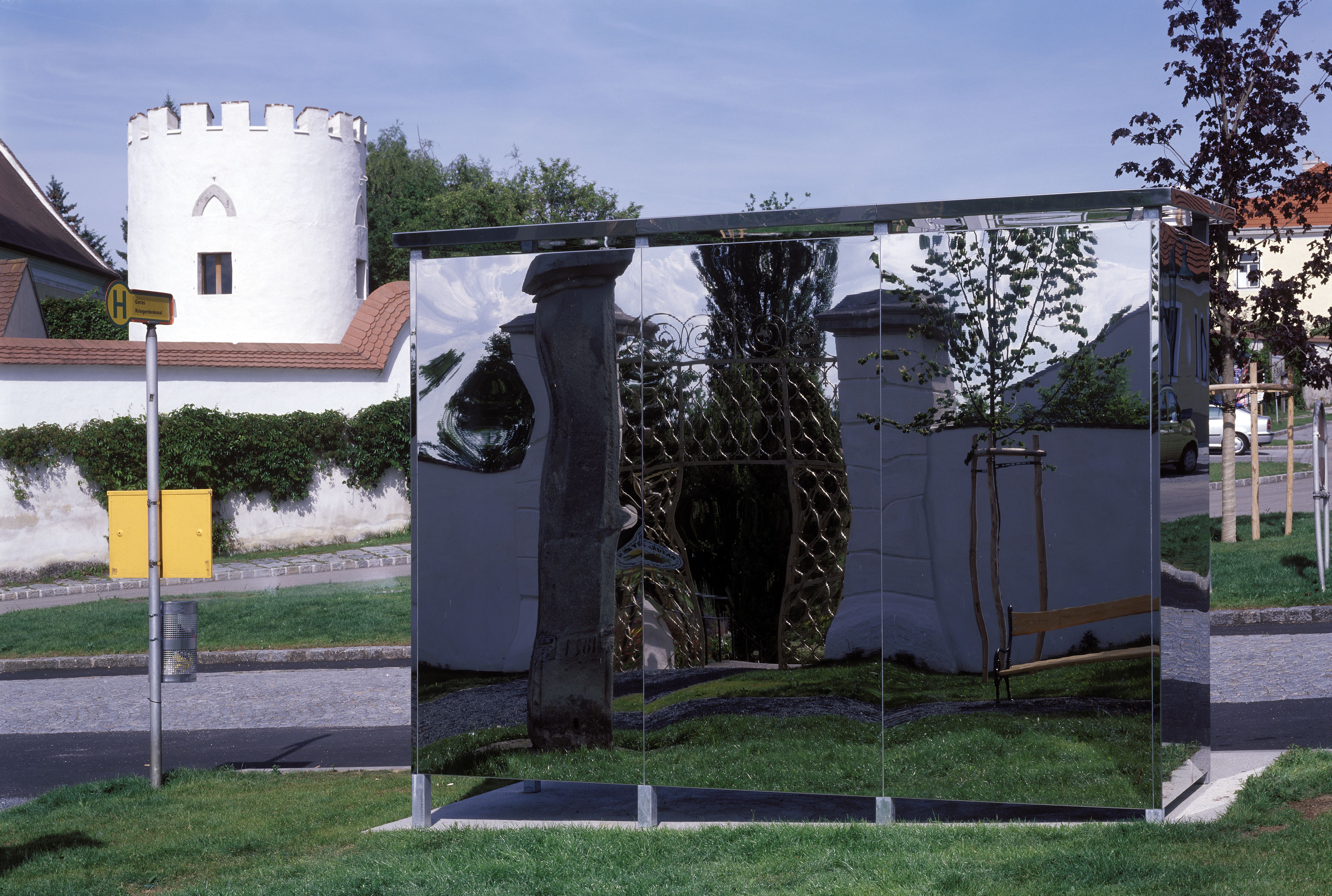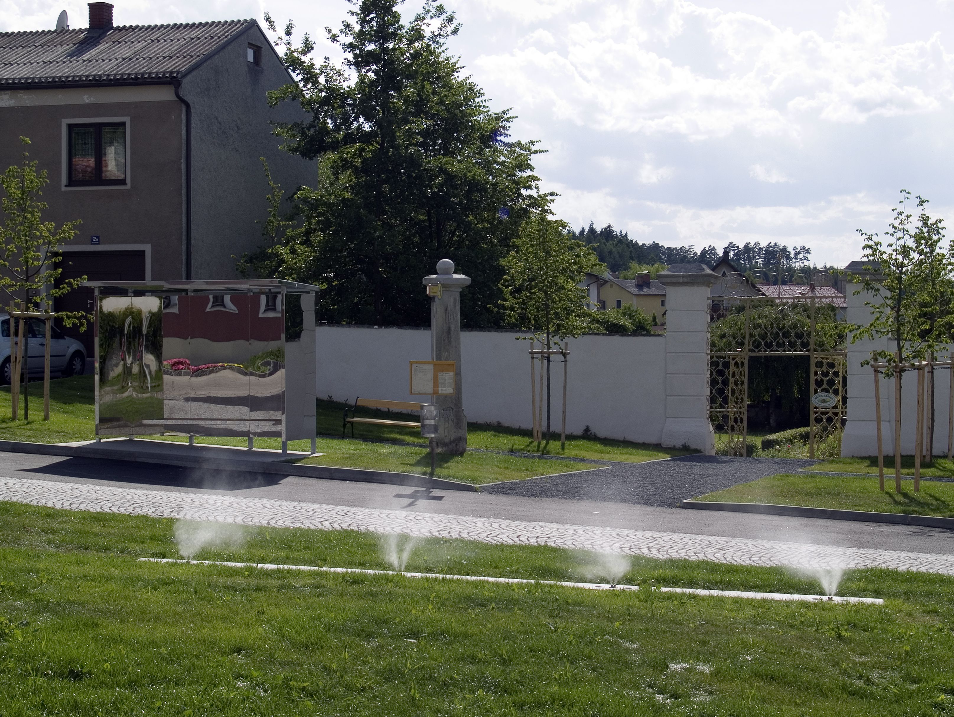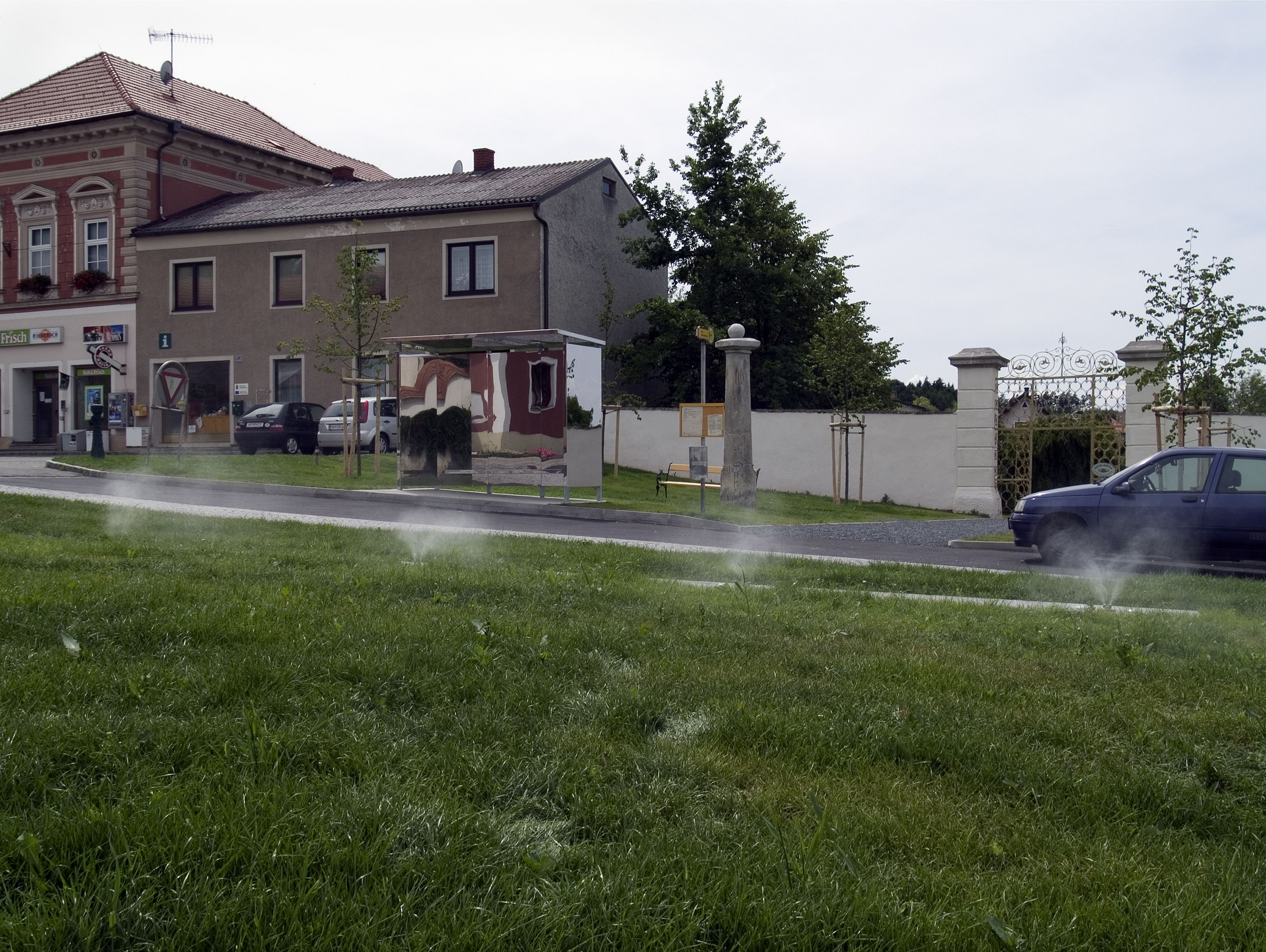 Das Projekt von Lisa Holzer für den kleinen Park vor dem Stift Geras besteht aus drei Teilen, die jeweils auf die bestehende Situation eines "verwünschten" Parks reagieren: ein Wartehaus aus spiegelndem Edelstahl, ein Brunnen in Form zarten Nebels und die Markierung des Tors zum Kräutergarten mit Goldfarbe. Das Hauptanliegen der Künstlerin war es, den Platz zu öffnen bzw. zu animieren und zu Interaktivität zwischen den künstlerischen Eingriffen und den BesucherInnen des Parks einzuladen. Für das Wartehäuschen wurde eine einfache kubische Struktur gewählt, die an drei Seiten mit hochpoliertem Edelstahl verkleidet ist. Lisa Holzer zaubert so ein sich ständig veränderndes Spiel von (Spiegel-)Bildern auf den Platz. Die Architektur tritt zurück und erhält die Funktion einer Bildproduktionsmaschine. Konterkariert wird das harte Material des Stahls durch den künstlichen Nebel, den die Künstlerin für den Brunnen gewählt hat. Das verdunstende Wasser erzeugt einen Schleier, der wiederum den dahinter liegenden Park in unserer Wahrnehmung verändert und immer wieder anders erscheinen lässt. Die Goldfarbe als Blickfang für das Tor zieht die BesucherInnen an, verschränkt es mit dem Gold des barocken Stiftes und führt weiter in den Garten. Wie in Mallarmés Gedicht "Nachmittag eines Fauns" erzeugt der gestaltete Park (Traum-)Bilder, welche die Projektionen der BesucherInnen abbilden.