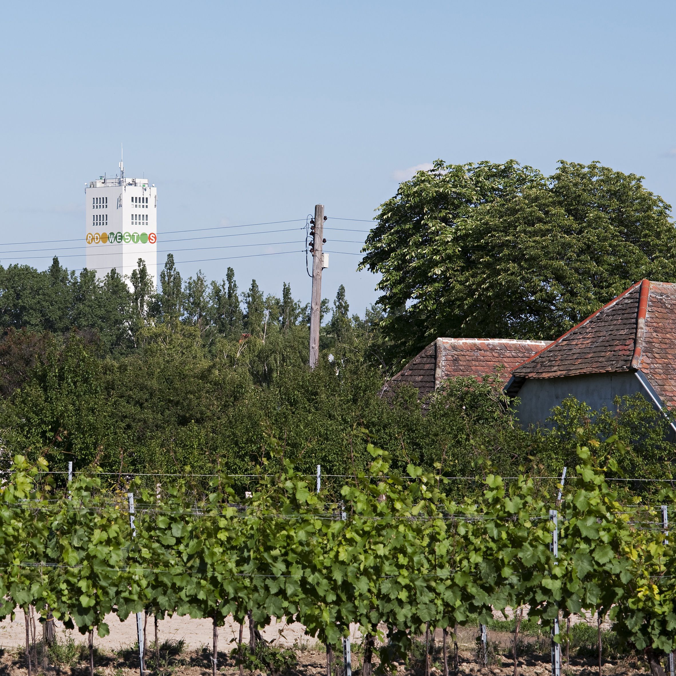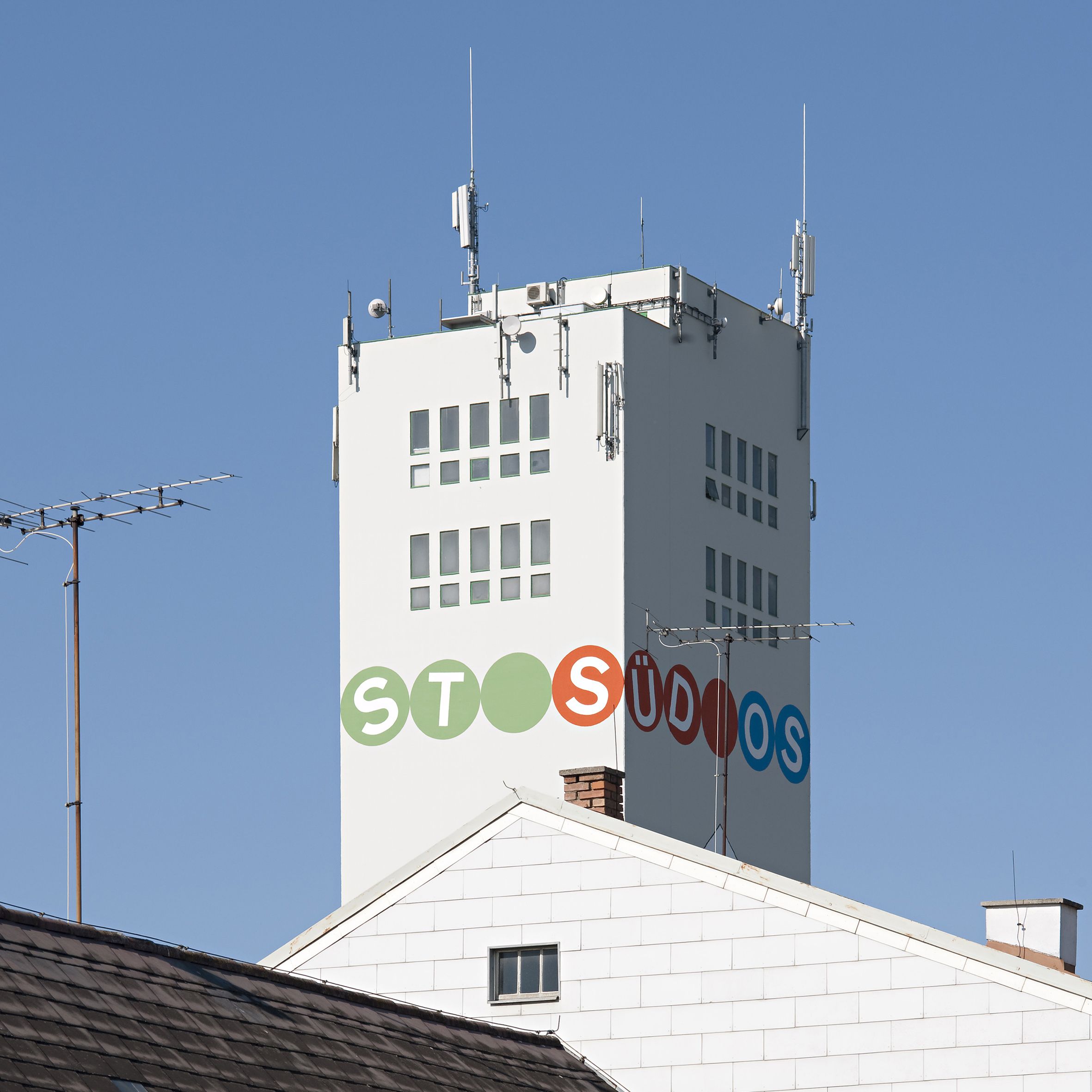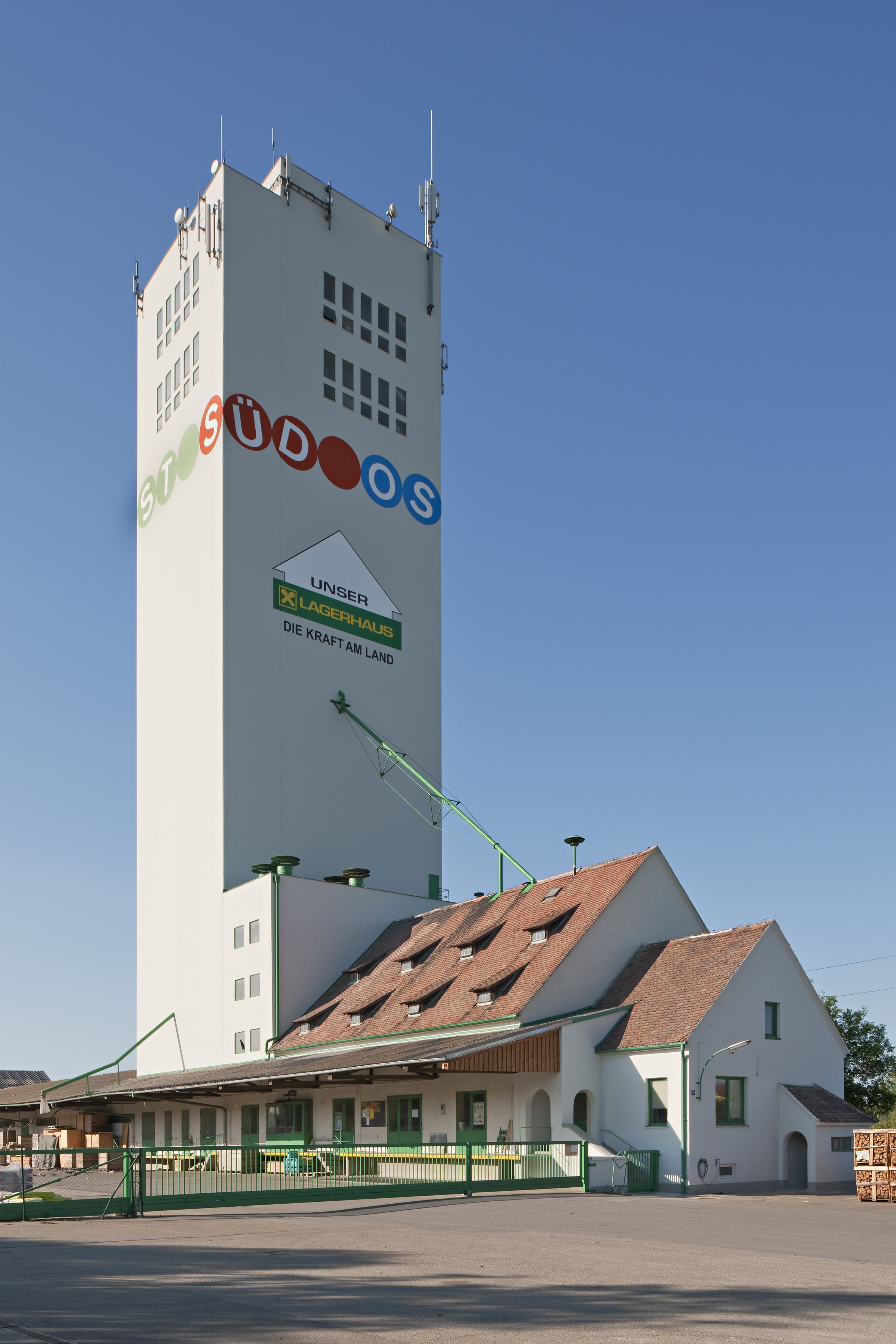 Lagerhäuser sind die heimlichen Wolkenkratzer der österreichischen Provinz. Keine andere Bautypologie prägt das österreichische Flachland wie die vielen wuchtigen Getreidespeicher in den Gemeinden Niederösterreichs. Noch bevor die Dörfer sichtbar werden, ragen von Weitem schon die betonierten Kolosse in den Himmel. Der Wiener Künstler Christian Hutzinger bedient sich eines solchen Silos – und verwendet ihn als Wegweiser und Orientierungspunkt des zweiten Blicks. Riesige Kreise mit einem Durchmesser von jeweils drei Metern umschnüren den Silo an seinem oberen Ende. Die Flächen sind farbig ausgemalt und mit ungeordneten weißen Lettern versehen. Scheinbar ohne Zusammenhang ergeben sich an den Schmalseiten die Buchstabenkombinationen STS und TNO, während an den beiden Breitseiten RDWE und ÜDOS in großer Höhe prangen. Was wird hier gespielt? Man muss um die Mauerkante blicken: In schlängelnden Bewegungen folgt der Autofahrer den Kurven der Straßen und nähert sich dem Silo von unterschiedlichen Seiten. Die vier Farben geben schließlich den entscheidenden Hinweis: Die Namen der Himmelsrichtungen wurden von Hutzinger übers Eck gezogen – Verwirrung und Orientierung. Der simple Eingriff an der Oberfläche des Gebäudes führt dazu, dass der Silo wieder räumlich wahrgenommen wird. Anstatt nur ein hässlicher Punkt im Dorf zu sein, verwandelt er sich in einen Kompass der Größe XXL. Ein Schmunzelmotiv in 58 Meter Höhe.