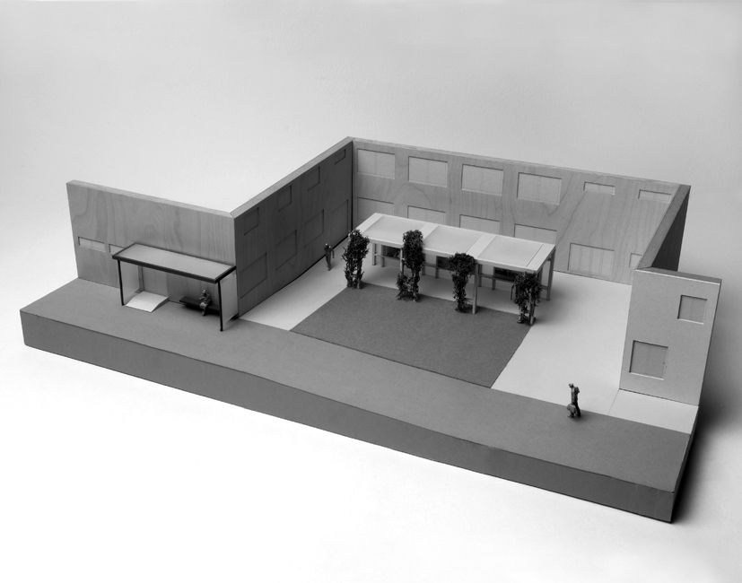 Mit der für sie charakteristischen Gelassenheit löste die Künstlerin die schwierige Aufgabe. Der Vorschlag verzichtete auf romantische Dorfbrunnenästhetik zugunsten einer äußerst zurückgenommenen urbanen Platzinterpretation. So sollten sämtliche Fassaden im Sinne einer Vereinheitlichung von Öffnungen und Oberflächen mit Furnierschichtholzplatten verkleidet werden. Darüber hinaus sah der Plan die Anlage einer rechteckigen Wiesenfläche vor, auf der eine Betonpergola mit integrierten Schaukästen errichtet werden sollte. Lombardis diskrete Maßnahmen eines modernistisches Aufatmens, wie die Befreiung von quälenden Glotzfenstern, Maschinverputz und Verbundtüren, eine Pergola als eleganter Übergangsbereich zwischen dem Innen und Außen, der raumbildende Pfeilergang, der Holzton der Mauerverkleidung sowie die Anpflanzung von Efeu, hätten eine Atmosphäre von Villenanlagen der Antike und mediterranes Feeling in die Waldviertler Gemeinde geholt. Es stimmt traurig, dass den Gemeindevätern die Realisierung dieser souveränen Intervention keine zusätzlichen Anstrengungen wert war. Nicht auszudenken, wie hochgestimmt, wie stolz die Pöggstaller den neuen Platz vor ihrem Gemeindeamt durchmessen hätten. Schade um das Projekt, eine verpasste Chance für Pöggstall!