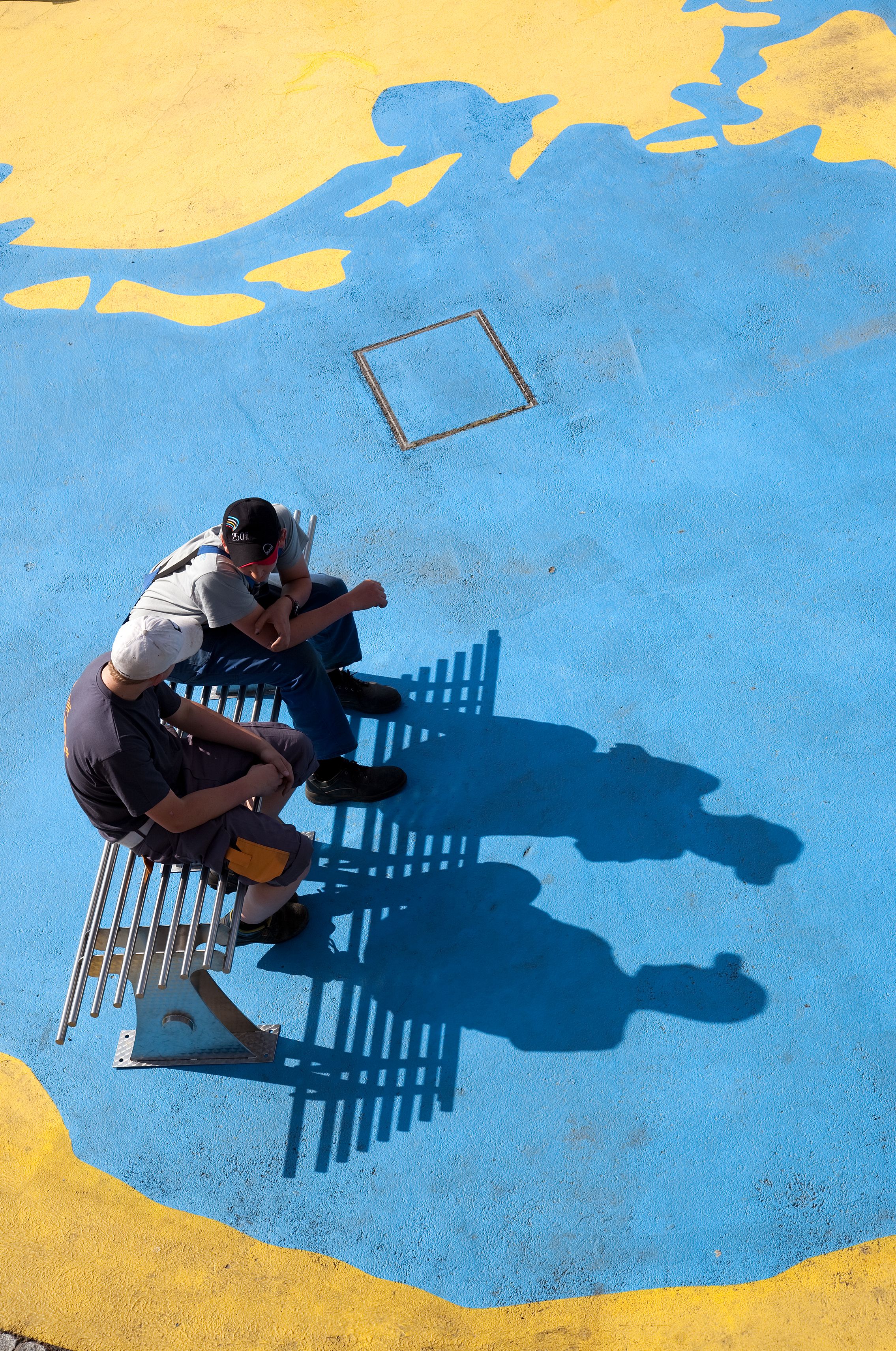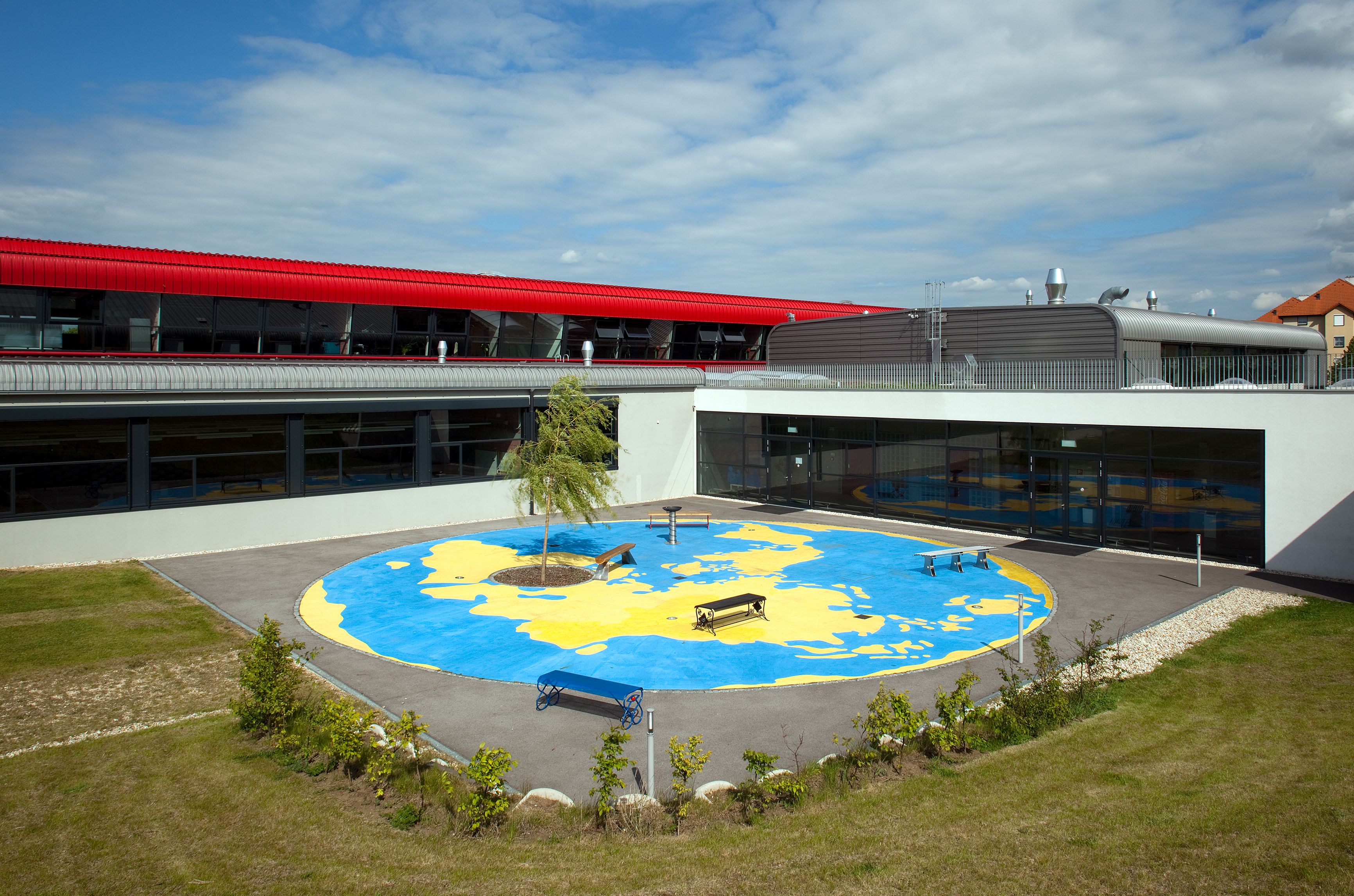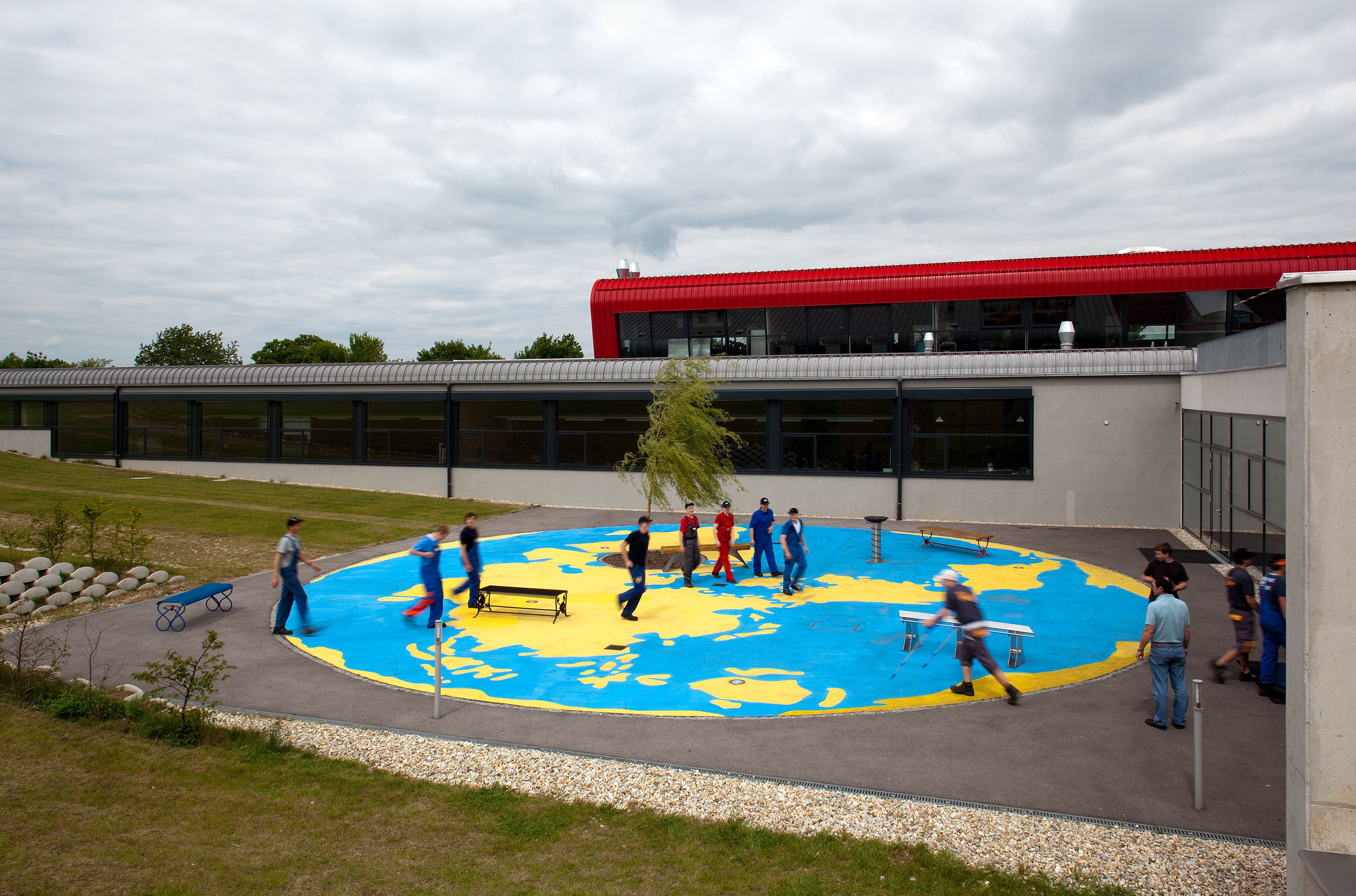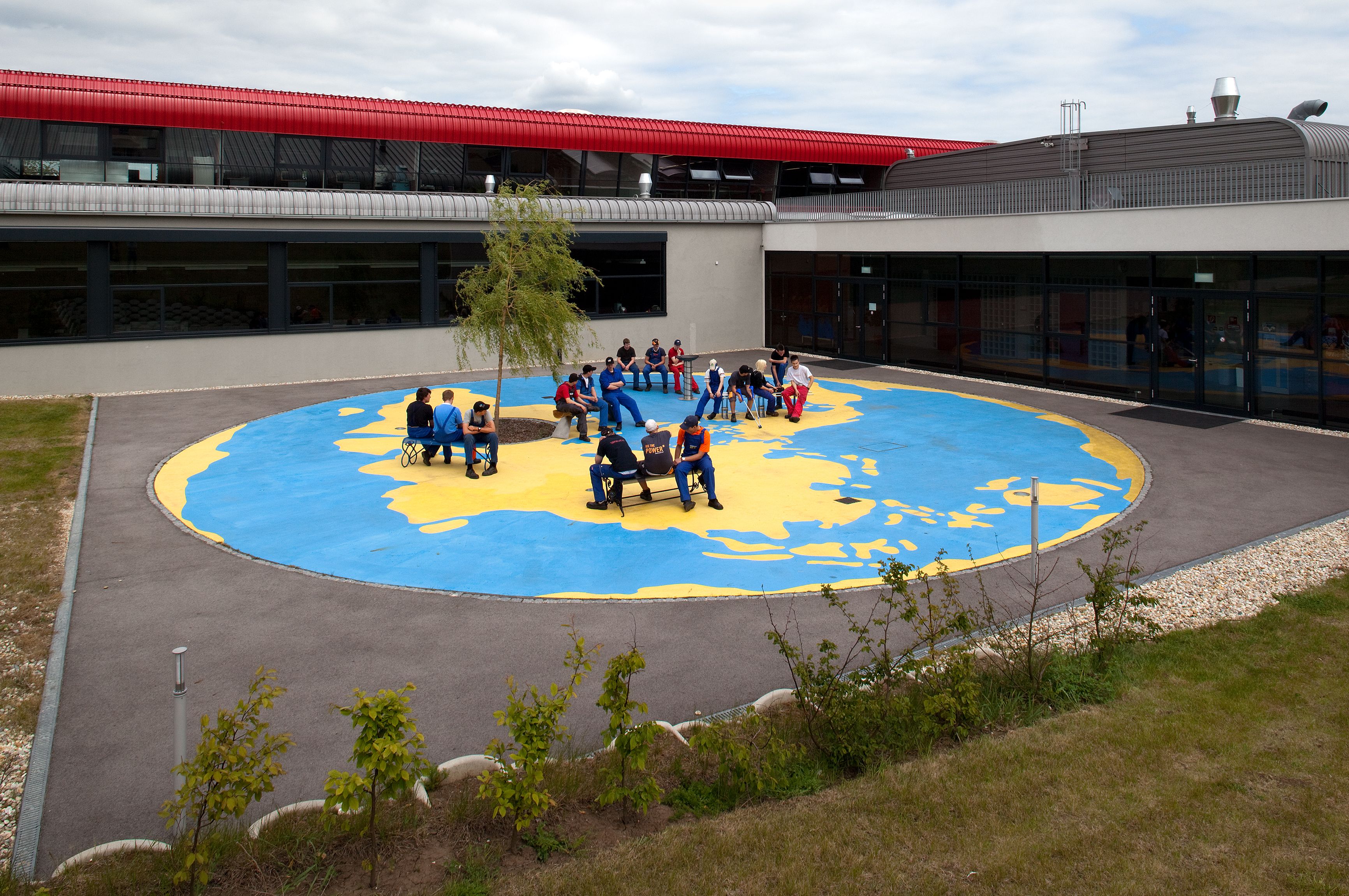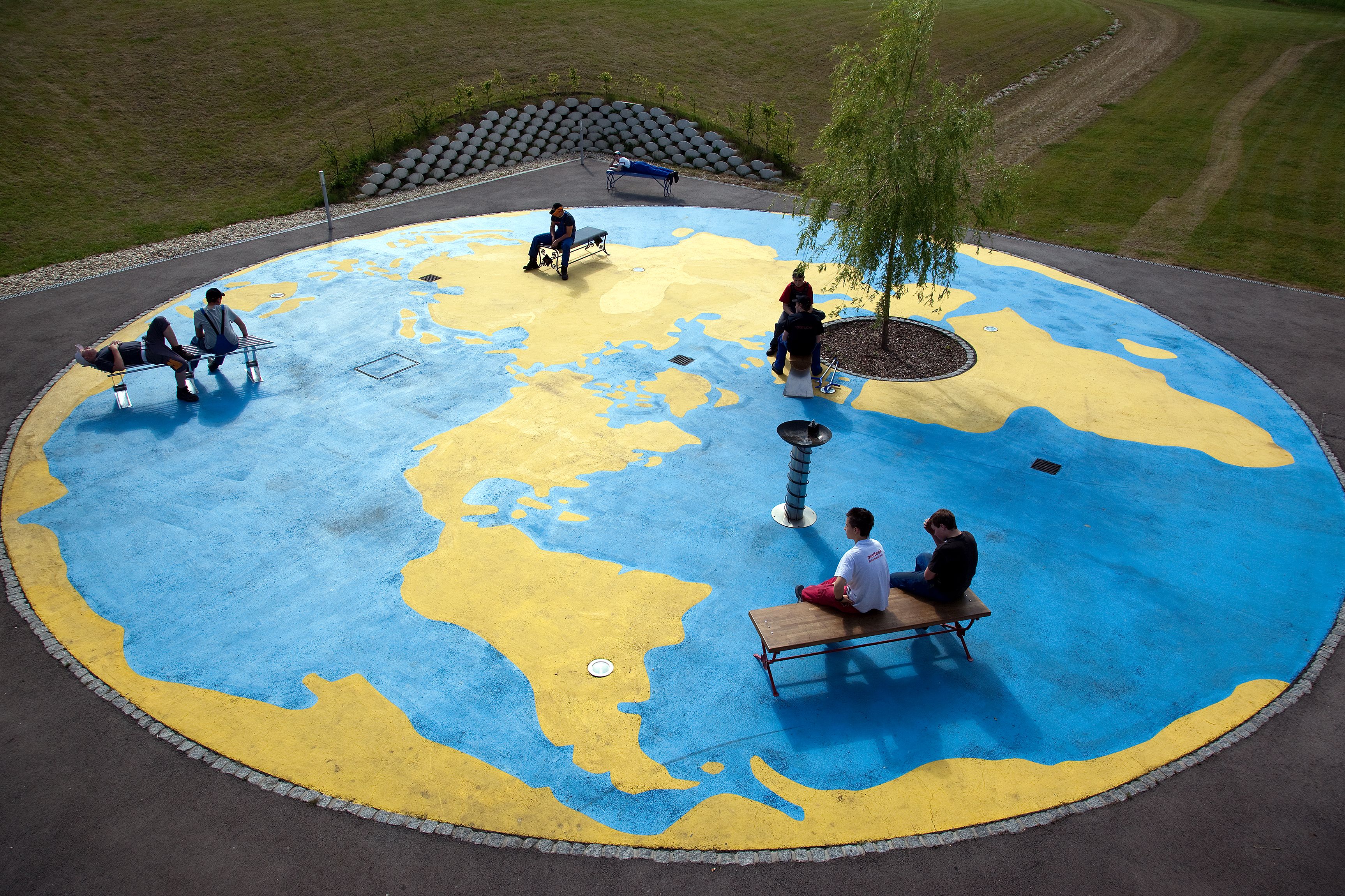 Es war ein mühsamer geschichtlicher Prozess, bis sich in der Wissenschaft unser heutiges Weltbild durchgesetzt hat: Die Erde ist keine Scheibe und ist nicht Mittelpunkt des Sonnensystems. Unsere geografische Vorstellung von der Welt ist aber immer noch sehr zweidimensional. Die kartografischen Projektionen der Erde beschränken die Dimensionen auf oben und unten, links und rechts. Mathematisch lässt sich der Globus auch auf eine Kreisfläche projizieren, mit jedem möglichen Mittelpunkt. Die Größe und Form der Länder und Kontinente wird dabei bis zur Unkenntlichkeit verzerrt. Für mein Kunst-am-Bau-Projekt in der Landesberufsschule Mistelbach habe ich ein solches kreisförmiges Weltbild auf den Pausenhof "gemalt". Mit gelber Straßenmarkierungsfarbe sind die Landmassen der Erde auf die radwegblauen Ozeane aufgetragen. Das Zentrum dieser Weltkarte ist natürlich Mistelbach. Dort ist ein Baum gepflanzt, um den herum Bänke gruppiert sind, die in einem Workshop mit den Schülern gefertigt wurden. So entsteht eine "heimatliche" Gemütlichkeit, die in die niederösterreichischen Landesfarben eingebettet ist. Wenn man vom Pausenhof der Schule ein paar Schritte die Wiese hinaufgeht, kann man sich auch einen anderen Blickwinkel vorstellen: Die lokale Begrenztheit verwandelt sich in einen globalen Raum, die runde Weltkarte wird zu einem Planeten.