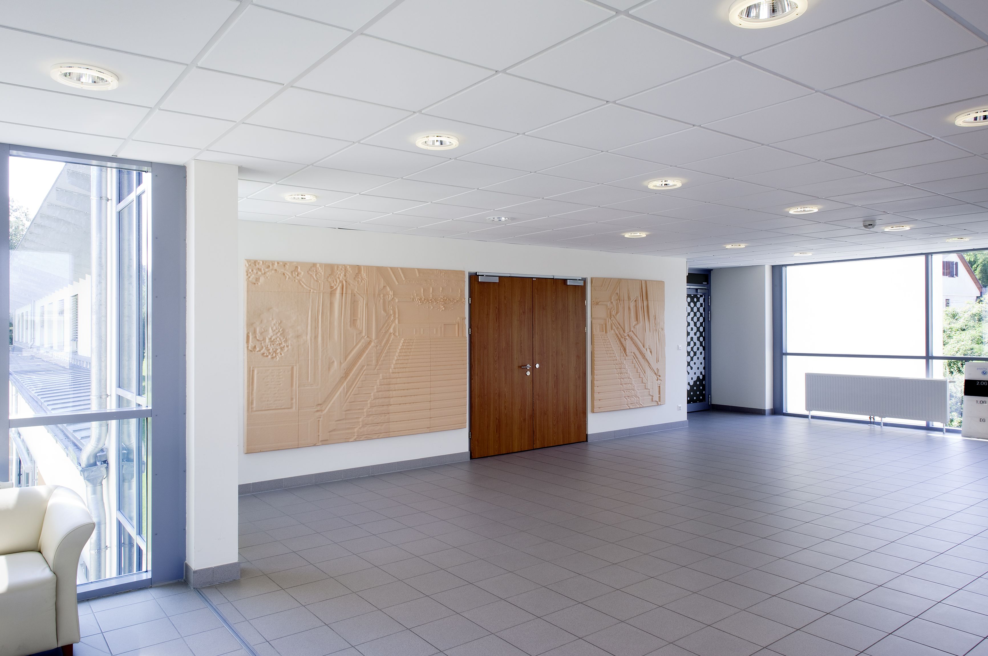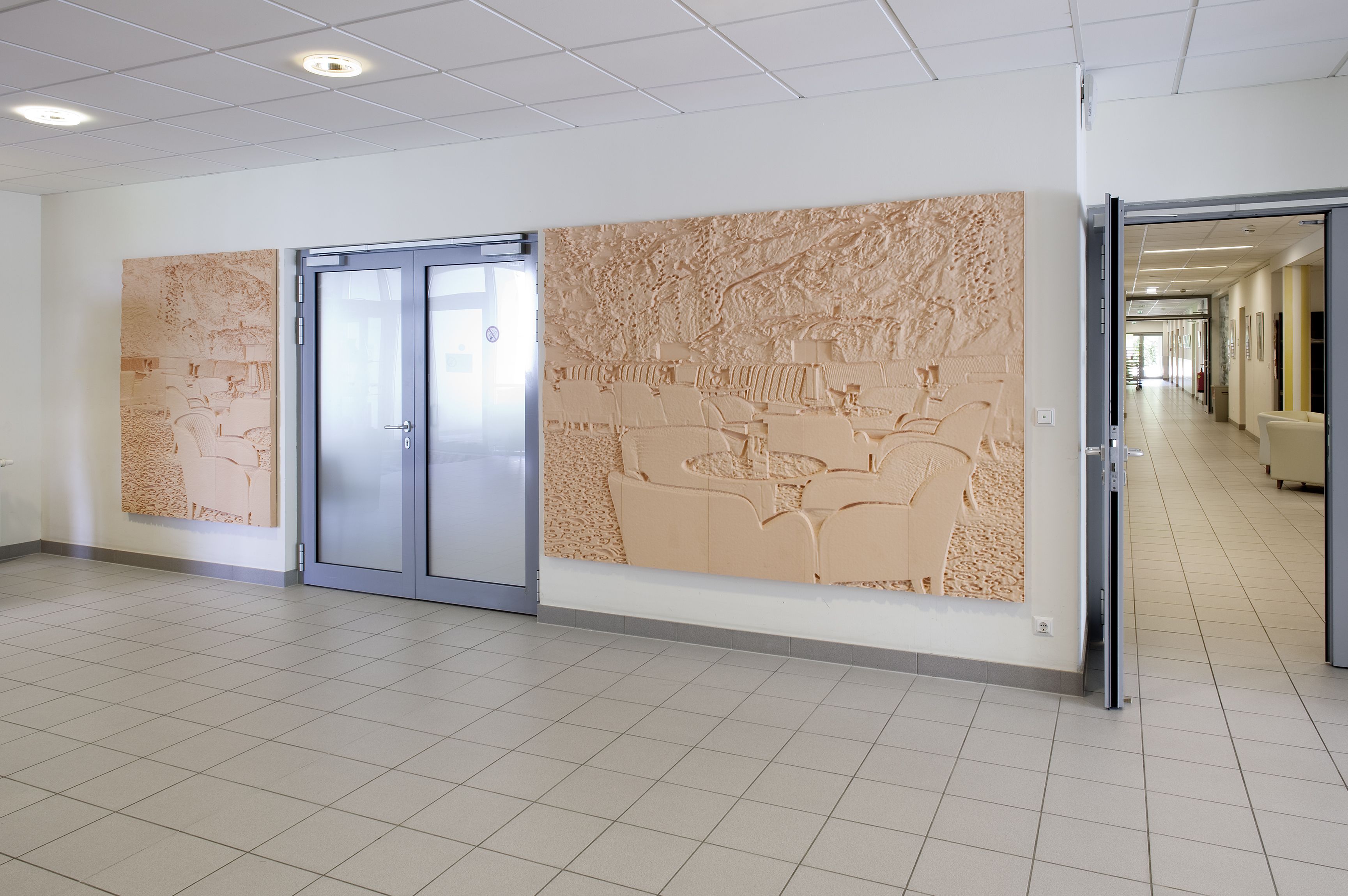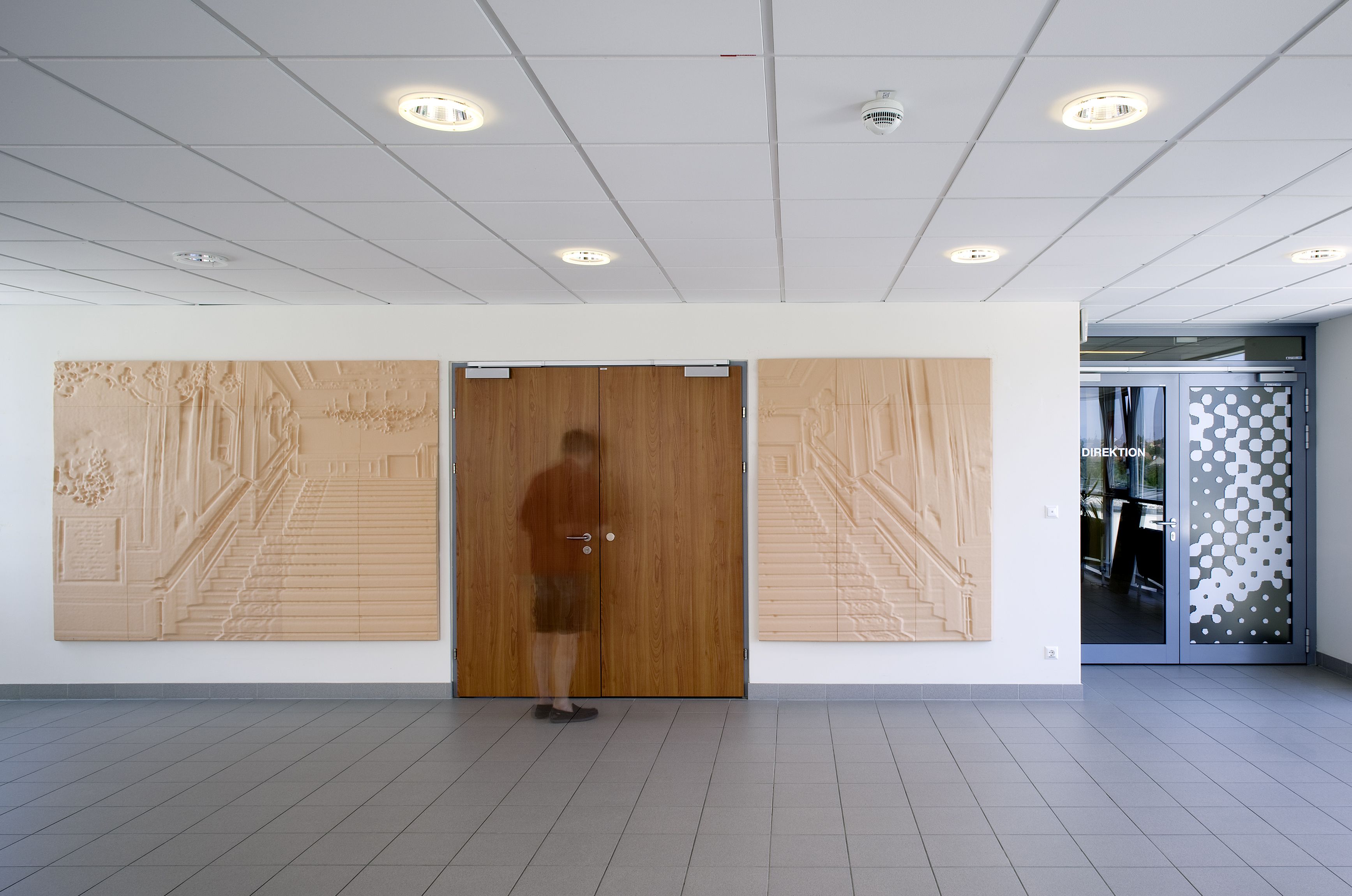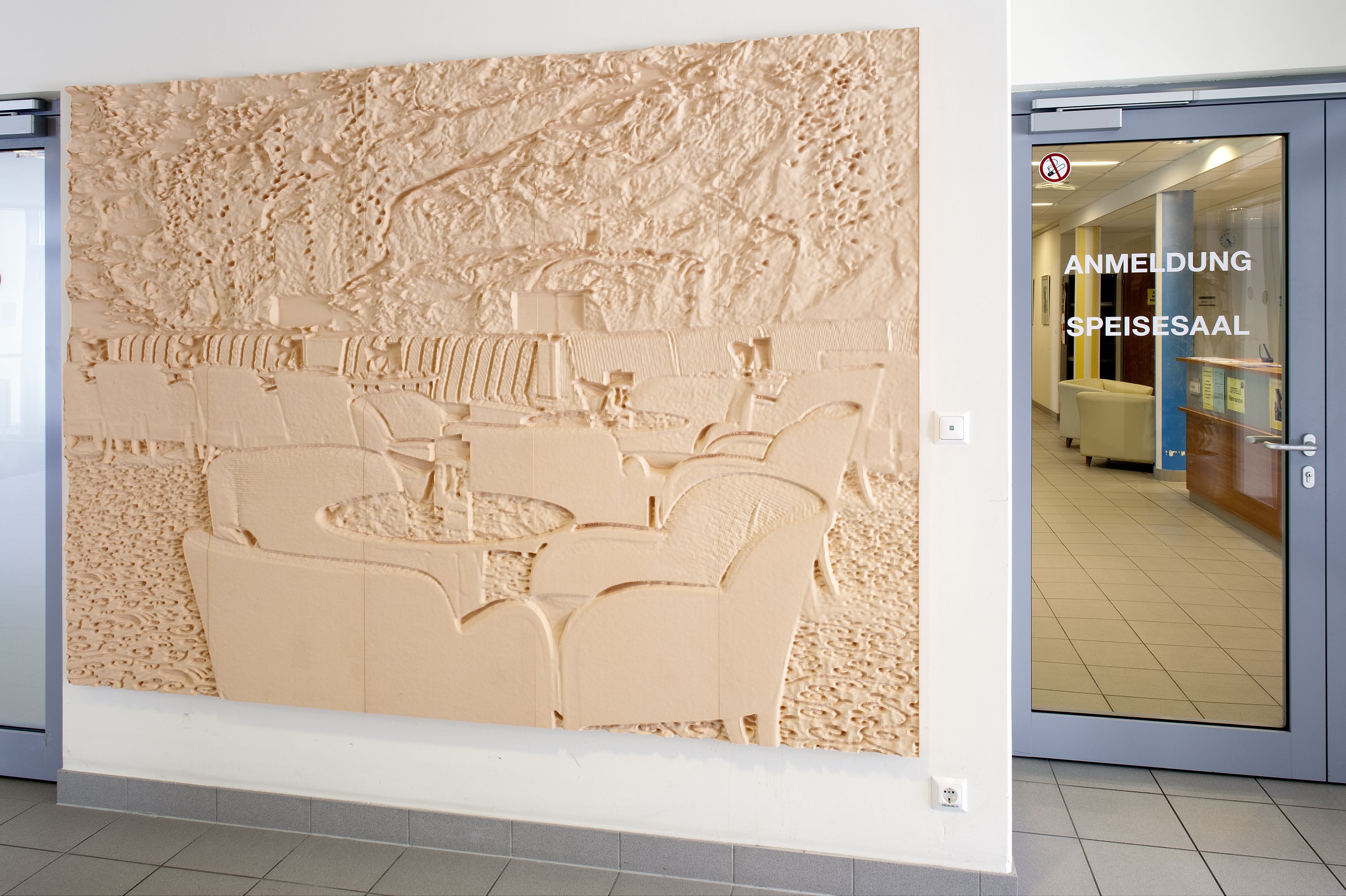 "Aus der Wand treten" ist der Titel der großflächigen Reliefplatten auf den Wänden im Eingangsbereich und in zwei Etagen. Fotografische Aufnahmen von diversen Innenräumen wurden in eine dreidimensionale Reliefstruktur übersetzt und anschließend aus blau eingefärbten Kunststoffplatten herausgefräst.