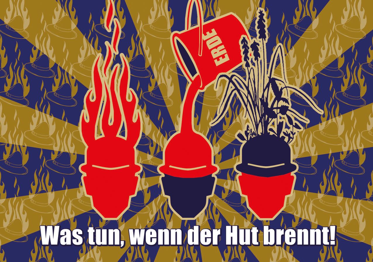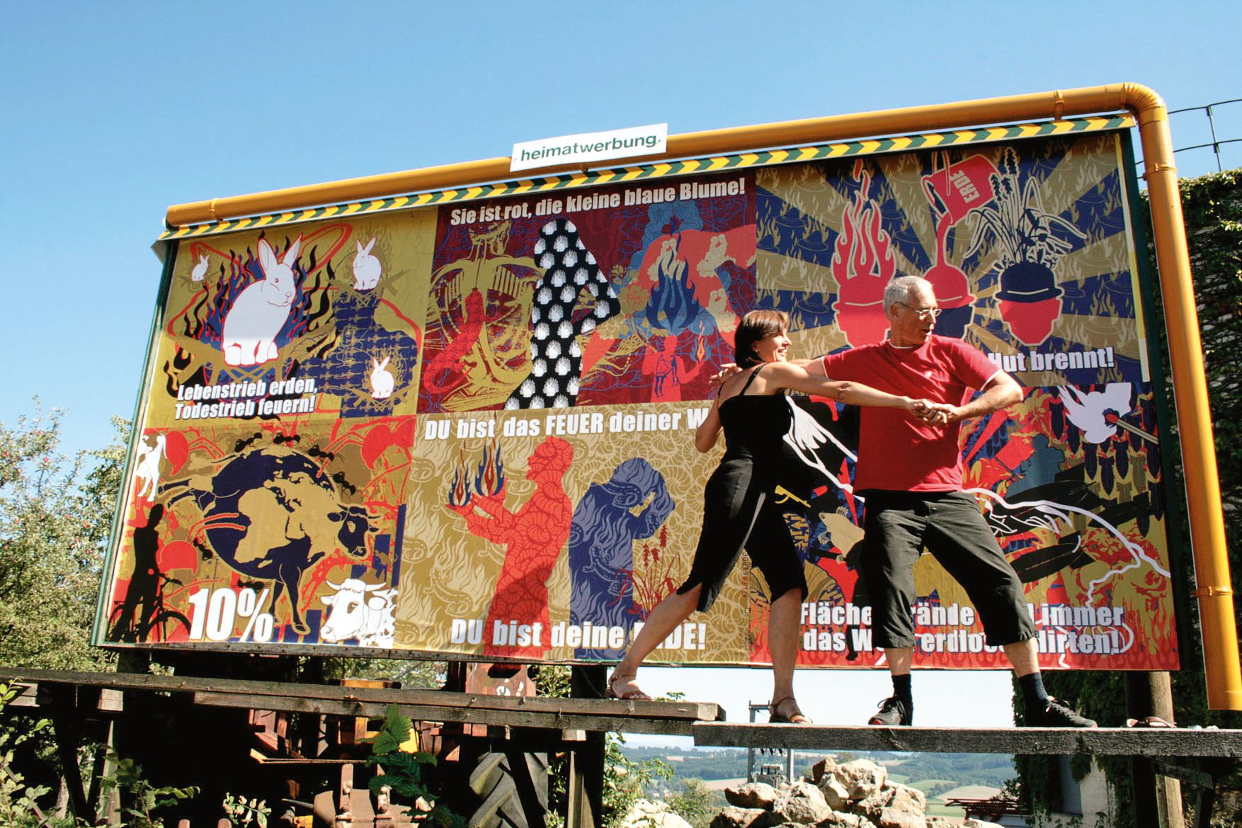 Josef Danner ist Profi im Umgang mit dem Medium Plakat. Ursprünglich der "abstrakten" Linie der "Neuen Wilden" zugeordnet, hat sich die Arbeit von Josef Danner sowohl als Maler, Texter und Grafiker wie auch als Gestalter von Plakatinstallationen im öffentlichen Raum zunehmend konzeptuell entwickelt. Kontinuierlich fließen Textelemente in die bildnerische Arbeit ein. Gesellschaftlich produzierte Mythen und deren mediale Darstellung in Sprache und Bild sind Ausgangspunkt seiner Reflexionen. Für seine Arbeit "Feuer/Erde" griff er gezielt den modularen Aufbau von offiziellen Werbeplakaten auf und entwickelte sechs einzelne Module, die sowohl selbstständig als auch als gesamtes 24-Bogen-Plakat funktionierten. Inhaltlich nahm Danner die archaischen Aspekte der Werbelinie des Mostviertels (der kraftvolle Schmied vor dem Amboss, der gerundete Mostbauer im Wams, strahlende Menschen unter blühenden Bäumen etc.) zum Ausgangspunkt, brach sie auf und erweiterte das Assoziationsfeld zu den Elementen Feuer und Erde um analytische sowie bedrohliche und erotische Aspekte. Die intensive Farbgebung in verführerischem Rot und Gold funktionierte als Eye-Catcher. Jedoch anstatt suggestiver Kaufanleitungen, wie sie normalerweise von Werbeflächen ausgehen, stellte der Künstler ein visuelles Rätsel in den öffentlichen Raum, das bei den BetrachterInnen durch die Kombination von Text und Bild eine Vielzahl an Assoziationen auslösen sollte.