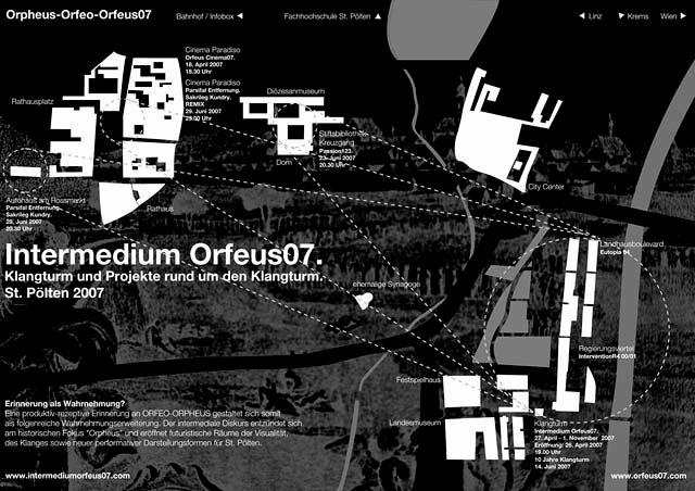 Das Ausstellungsthema des Klangturms St. Pölten 2007 trug das Programm bereits im Titel. Ausgangpunkt der Überlegungen der Medienkünstler Markus Wintersberger und Eberhard Kloke bildete die Oper "L’Orfeo" von Claudio Monteverdi – eines der ersten intermedialen Kunstwerke. Was Intermedialität heute ausmacht, welche Themen und Möglichkeiten sie im Feld der Musik und der Klangwelten eröffnet und worin die Zukunft liegen könnte, wurde im Jahr 2007 bei zahlreichen Veranstaltungen in St. Pölten auf unterschiedlichste Weise erkundet. Den Ausgangspunkt bildete der Klangturm, in dem Interessierte von April bis Oktober in Forschungslaboratorien vor allem dem Potenzial der eigenen Stimme nachgehen konnten, sei es als Teil einer raumgreifenden Licht- und Klanginstallation oder als Beitrag zu dem außergewöhnlichen Gesangsstück "Aria" von John Cage. Von der Aussichtsterrasse des Klangturms aus wurde der Blick der BesucherInnen durch "Gucklöcher" auf symbolische Orte in St. Pölten gelenkt. Diese Orte tauchten dann als zum Leben erweckte sprechende und singende Wesen in der Videoinstallation "Talking Buildings" wieder auf und konnten mit einer speziell angefertigten Schatzkarte im Anschluss zu Fuß begangen werden. Dies wurde in zwei über den Sommer verteilt stattfindenden Performances, welche die Intermedialität erfahrbar machten, demonstriert. In den Performances "Passion123" (intermediale Frakturen zwischen Musik-Bild-Licht-Sprache) und "Parsifal Entfernung. Sakrileg Kundry" wurden Sound, Tanz und Videoprojektionen zu einem Gesamterlebnis zusammengefügt. Dabei kam auch den stimmungsvollen Räumlichkeiten des Diözesanmuseums und den Stadtsälen, in denen die Veranstaltungen stattfanden, eine entscheidende Rolle zu.