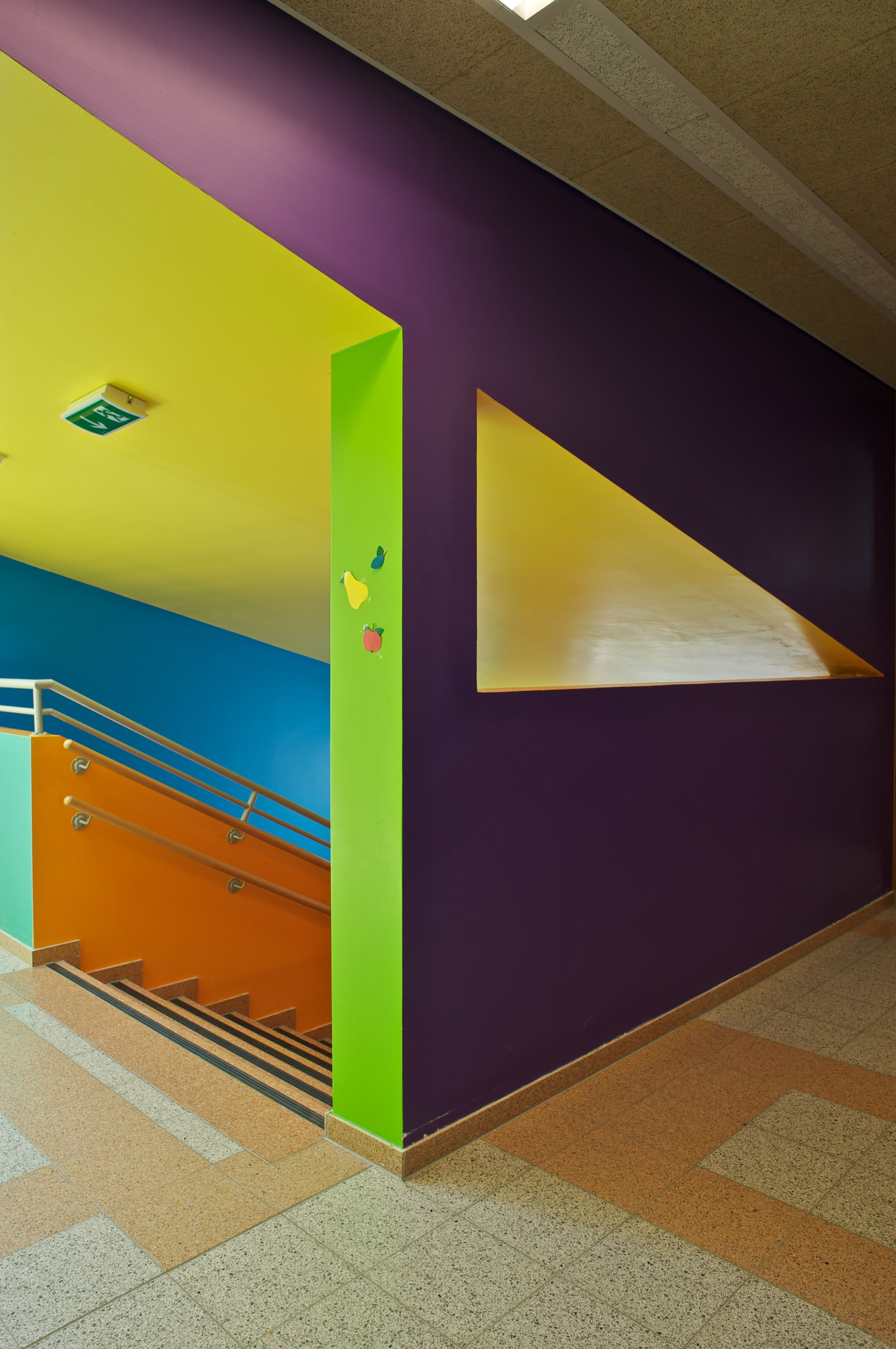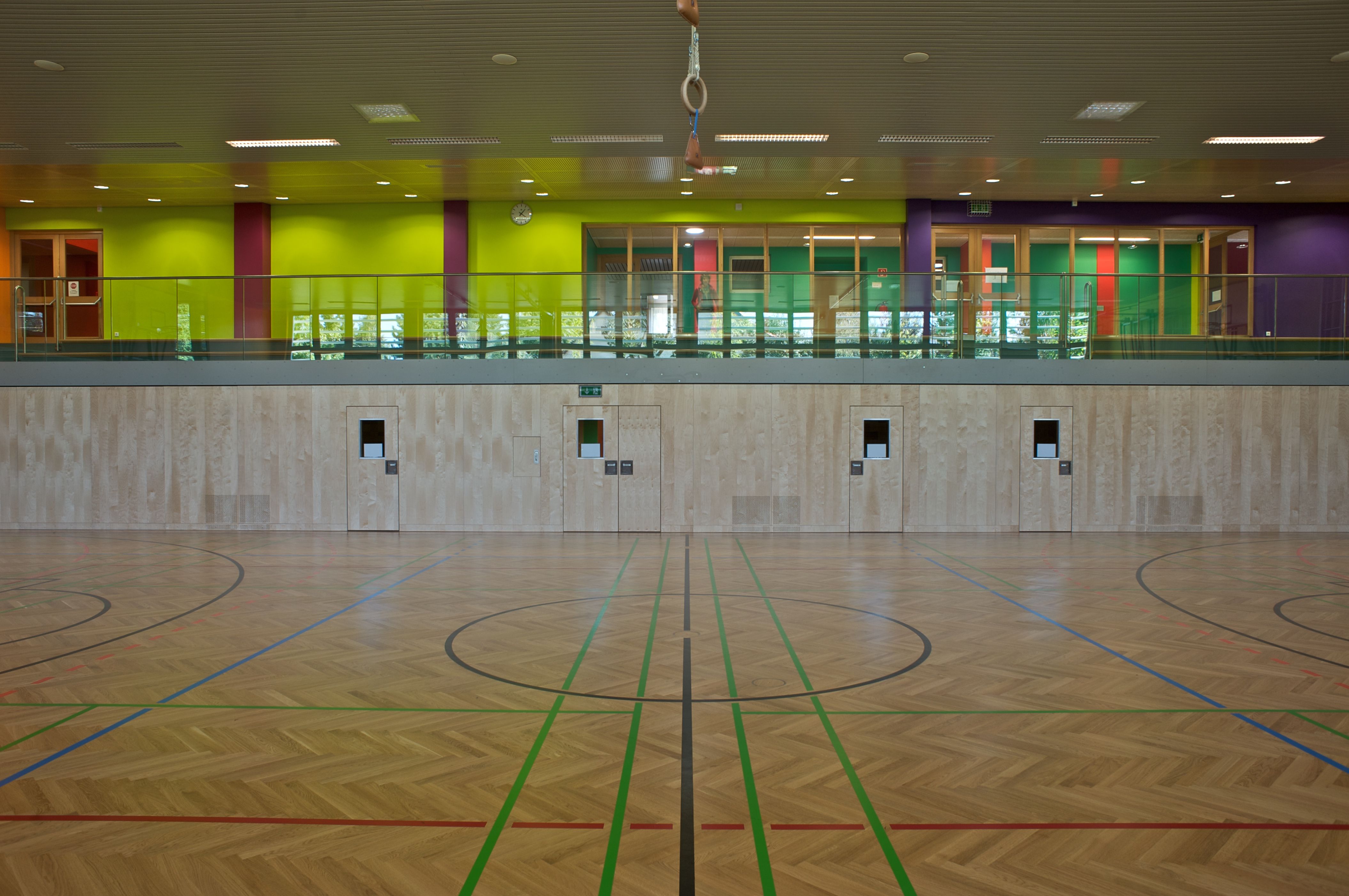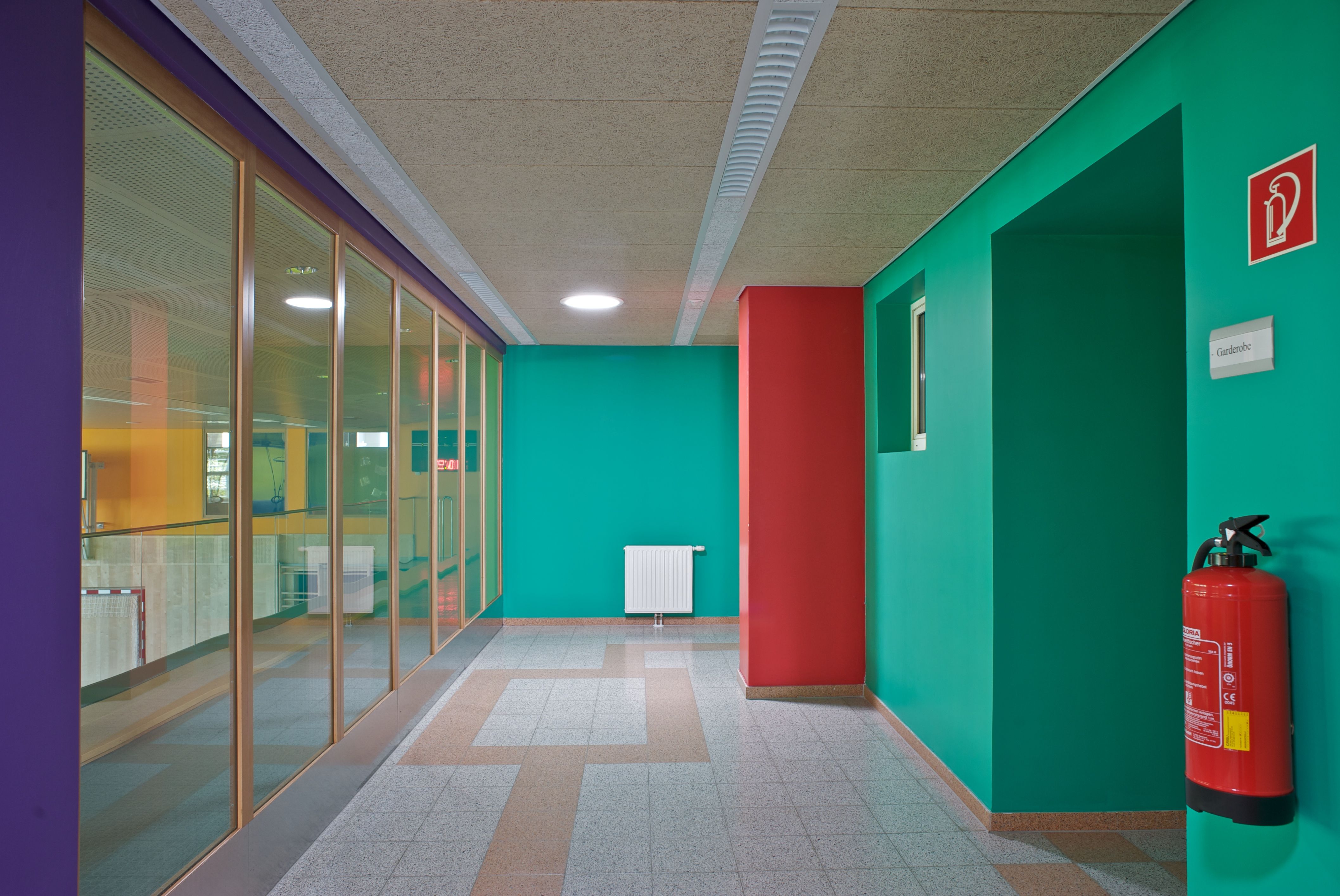 Das Farbkonzept für die Sporthalle Kapellerfeld entstand auf der Basis von Recherchen, die wir schon so etwa um 1970 durchgeführt hatten, betreffend Farbtheorien von Goethe, Itten, und Küppers. Tatsächlich orientierten wir uns dann an eigenen Experimenten mit dem Prisma.
