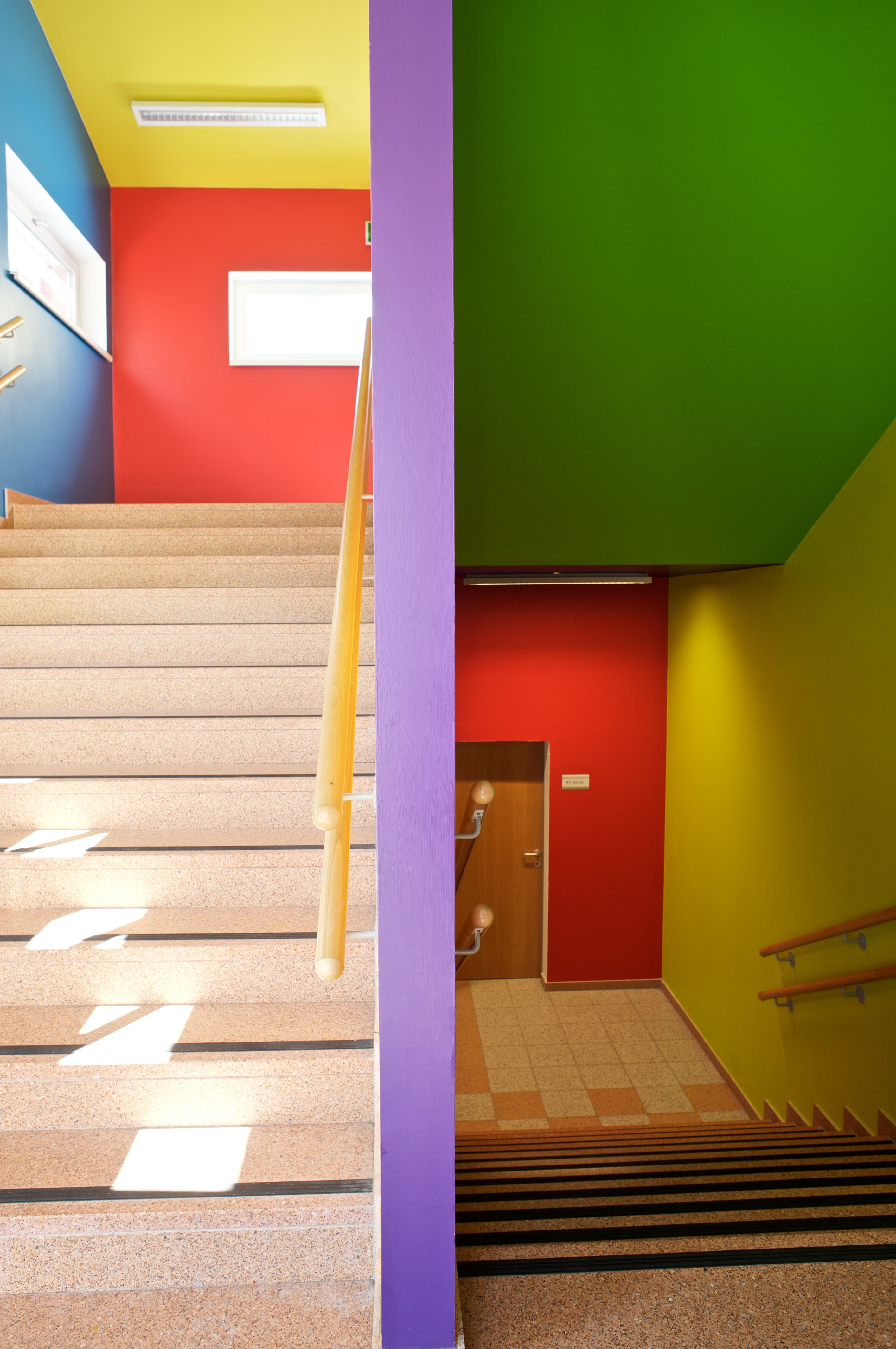 Diese damals erarbeitete Farbpalette kam also jetzt auch in Kapellerfeld zur Anwendung. Sie ist auf der Balance zwischen Hell-Dunkel und Warm-Kalt aufgebaut. Die Entscheidung fiel in diesem Falle auf 14 Farbstufen. Die Aufteilung der Farbflächen ist aber frei komponiert. Je eine Farbe pro Wand,- also keine Flächenteilungen. Manche Farbtöne sind häufiger vertreten, andere selten. Größere und kleinere Wandflächen. Stimmungen zu erzeugen über die Raumtiefenwirkung und Temperatur der Farbe.